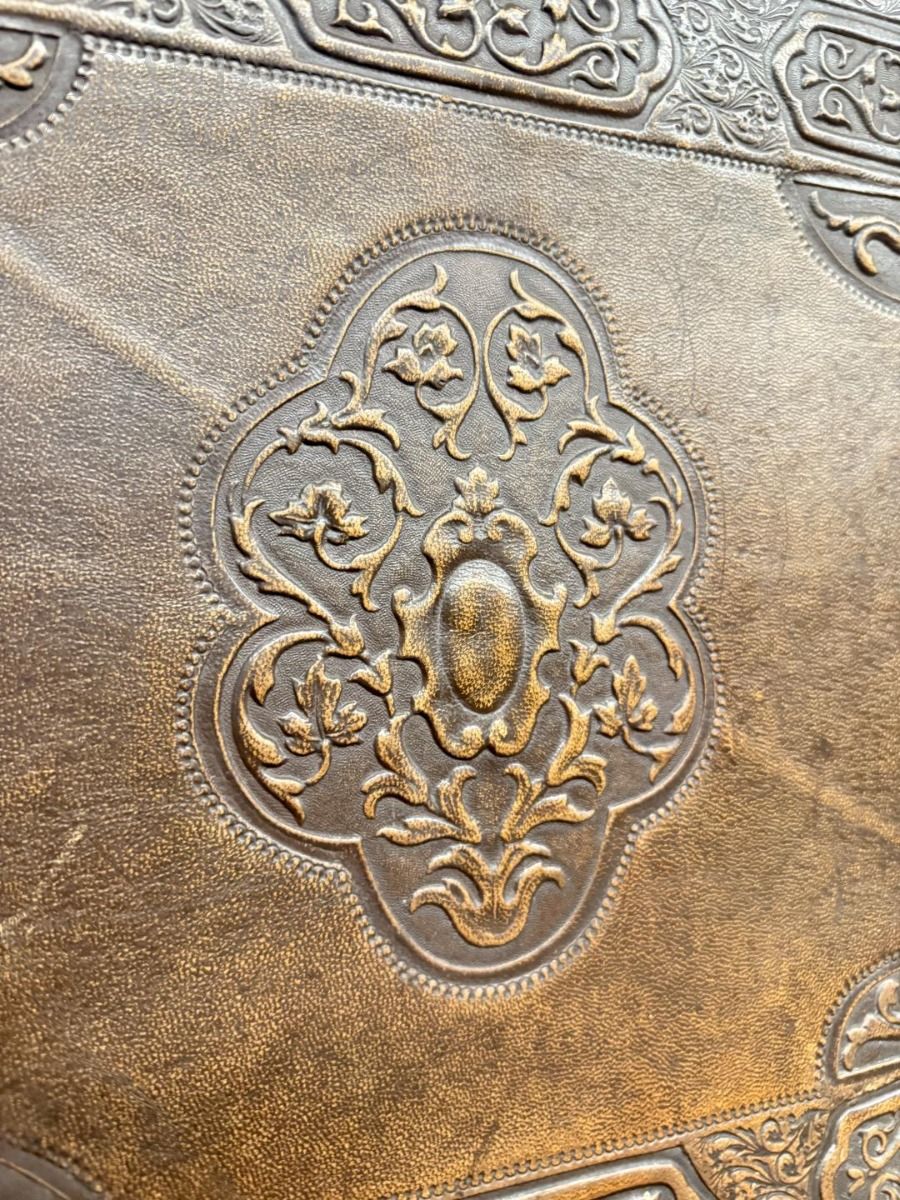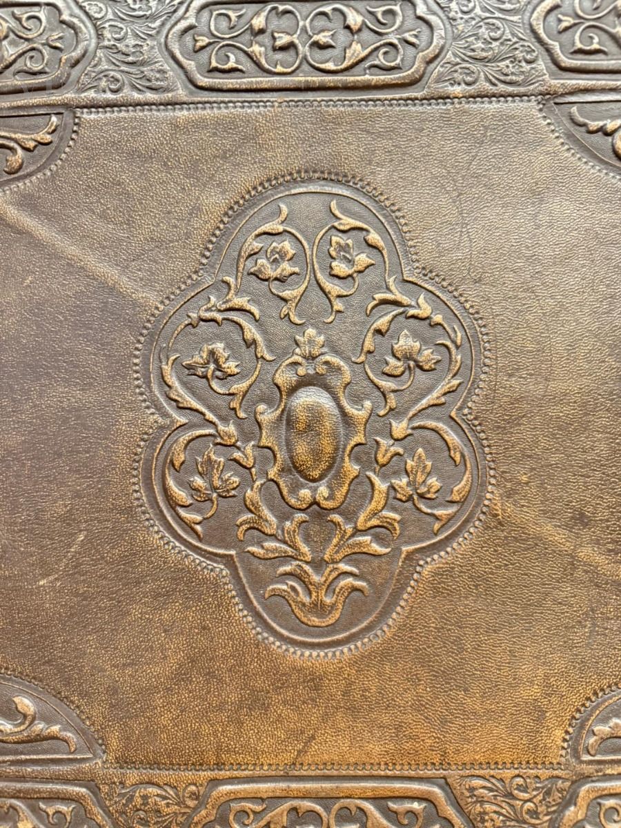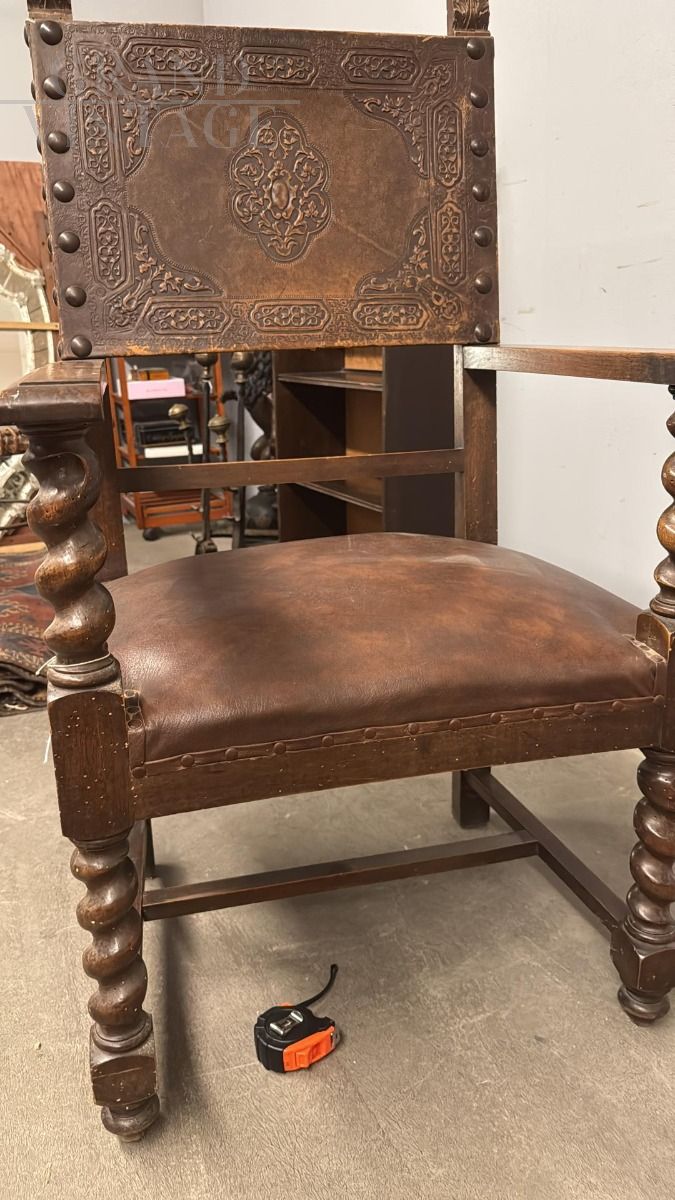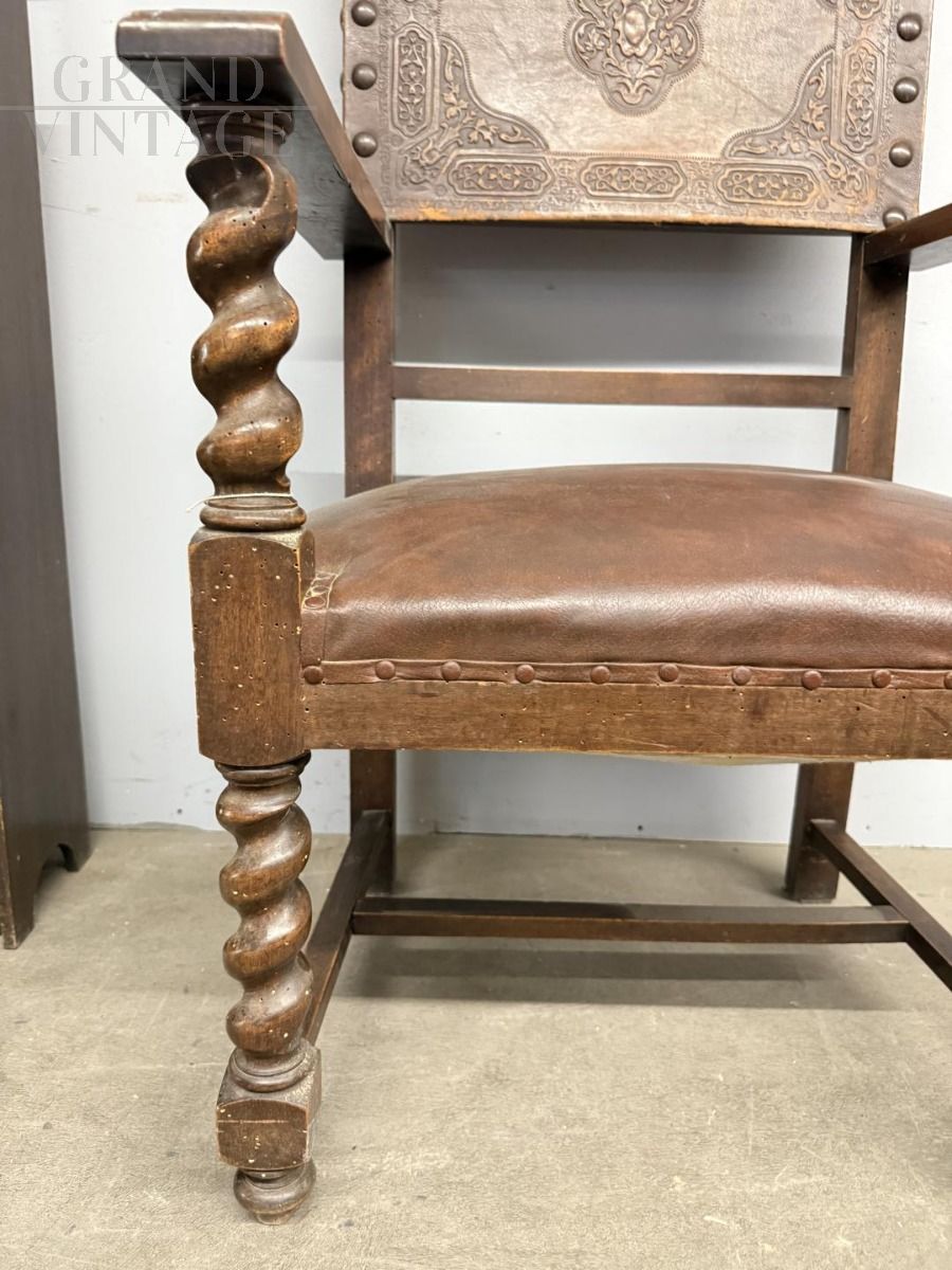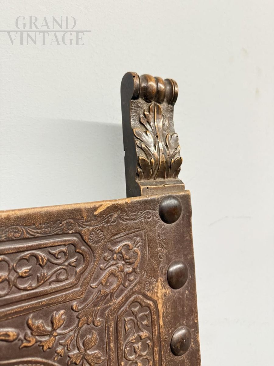 Poltrona antica neorinascimentale con braccioli e cuoio originale stampato, XIX secolo, non restaurata.