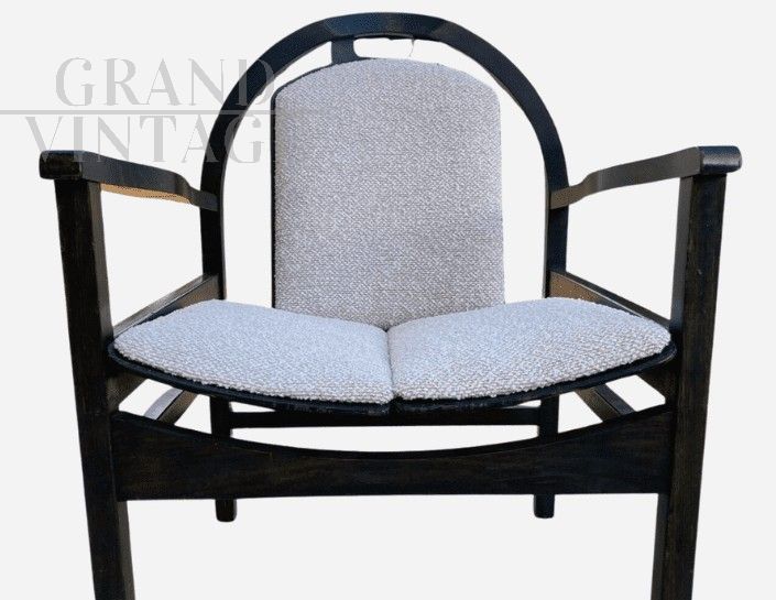 Questa poltrona Baumann, emblema del design anni '50, coniuga un'eleganza senza tempo con il comfort moderno. Realizzata in faggio tinto nero, è un esempio della maestria artigianale di Baumann. Il sottile contrasto tra la struttura scura e il tessuto bouclé grigio-beige ne esalta l'estetica vintage, offrendo al contempo una seduta accogliente e confortevole.