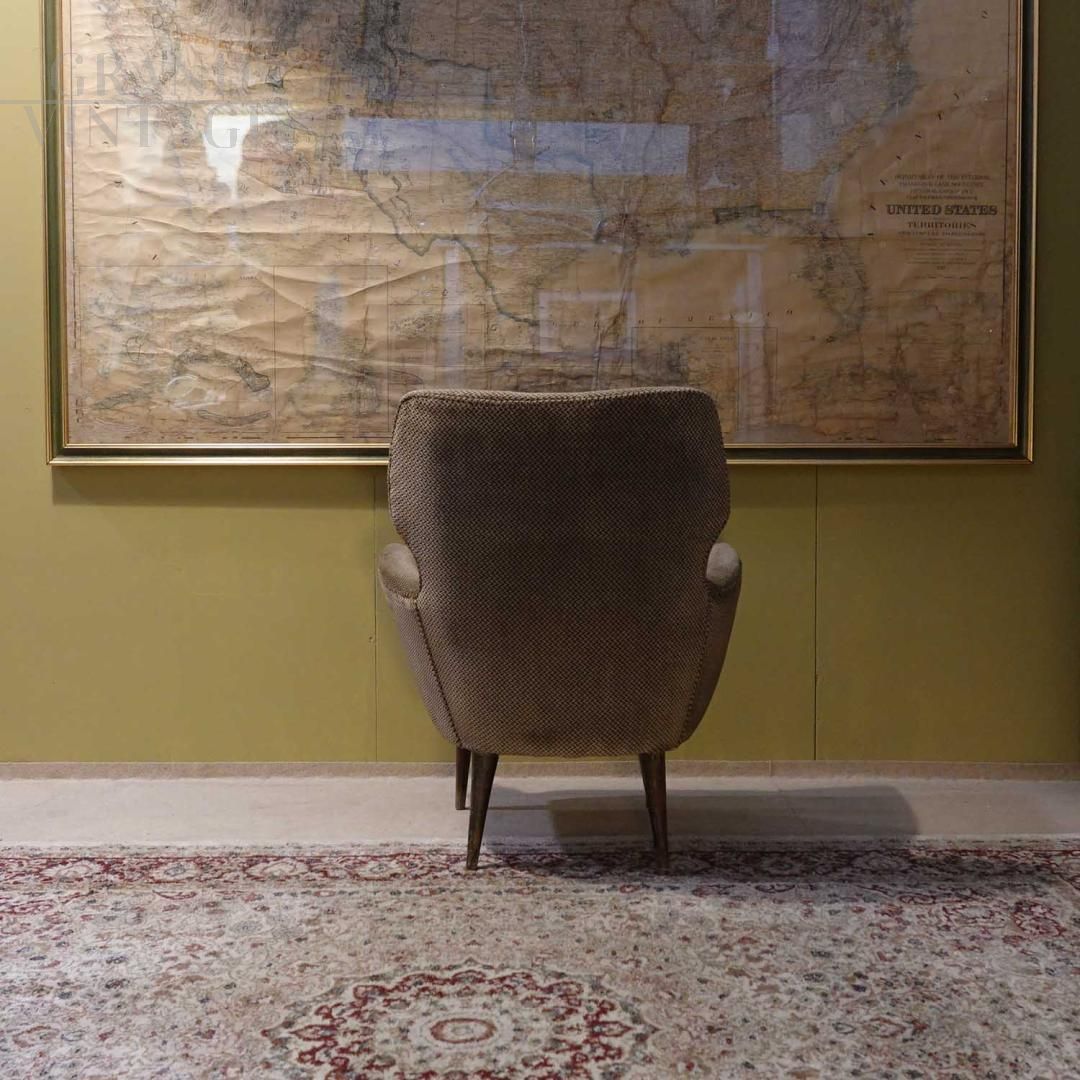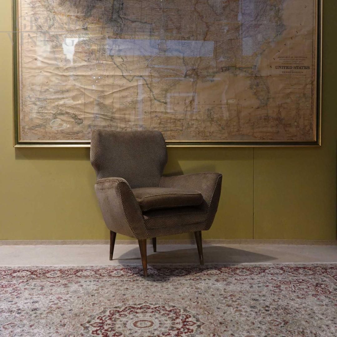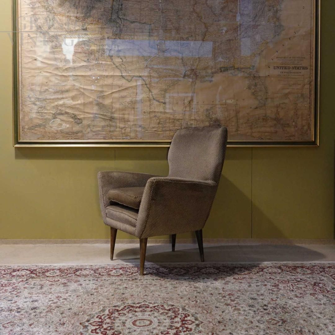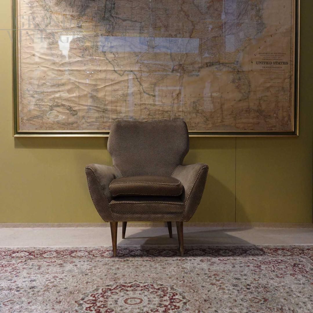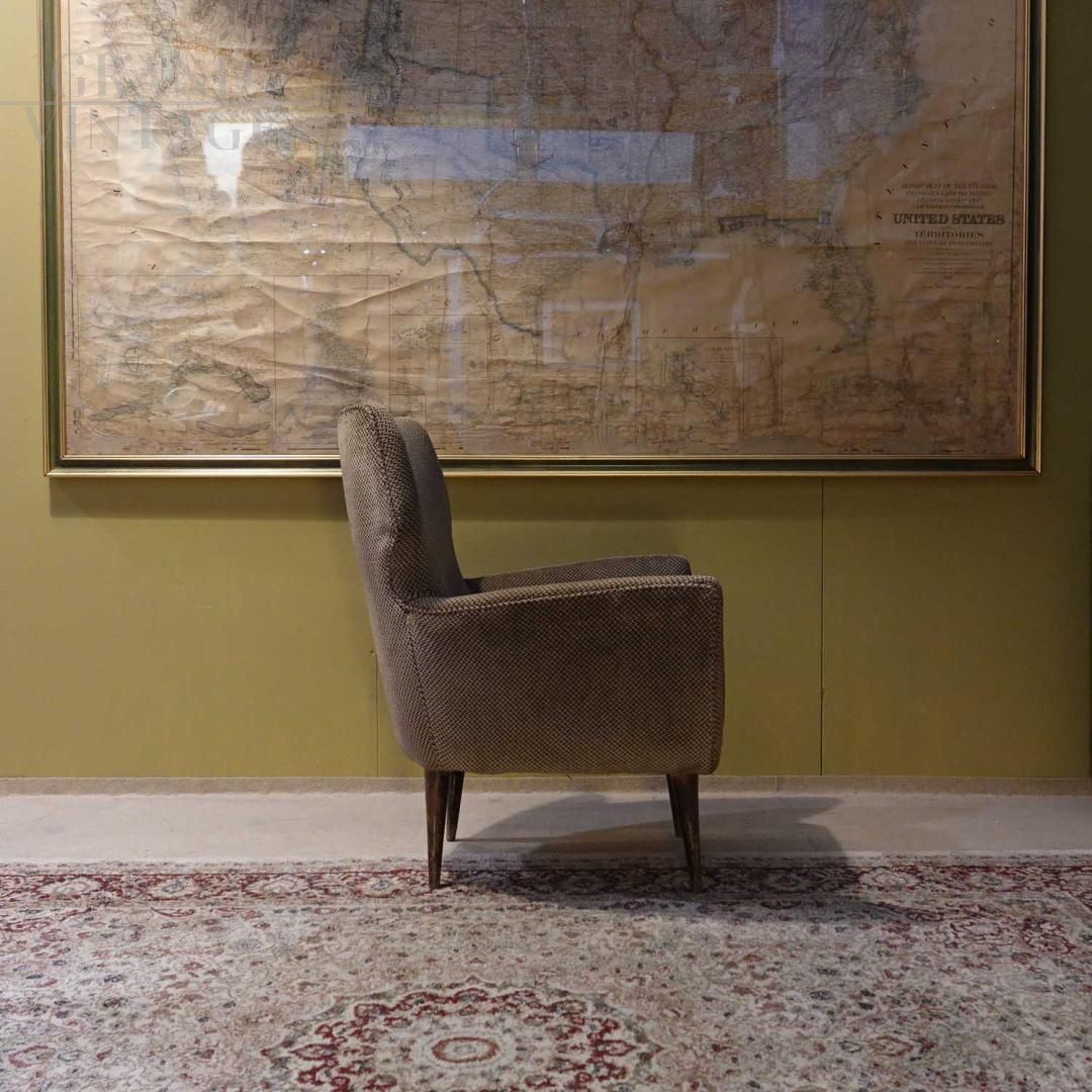 Poltrona Art Déco in tessuto marrone con micro fantasia, caratterizzata da linee eleganti e geometrie decise tipiche di questo stile iconico. Un pezzo raffinato che aggiunge un tocco di lusso e simmetria agli spazi, perfetto per ambienti sofisticati, salotti di design o set scenografici dal gusto classico - moderno.