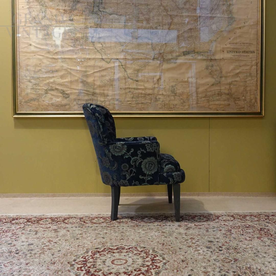 Con il suo rivestimento in velluto blu decorato da un motivo floreale, questa poltrona unisce comfort, eleganza e personalità. Un pezzo unico che dona carattere e vitalità a qualsiasi ambiente, perfetto per arredamenti eclettici, creativi o dallo stile bohémien.
