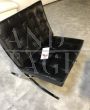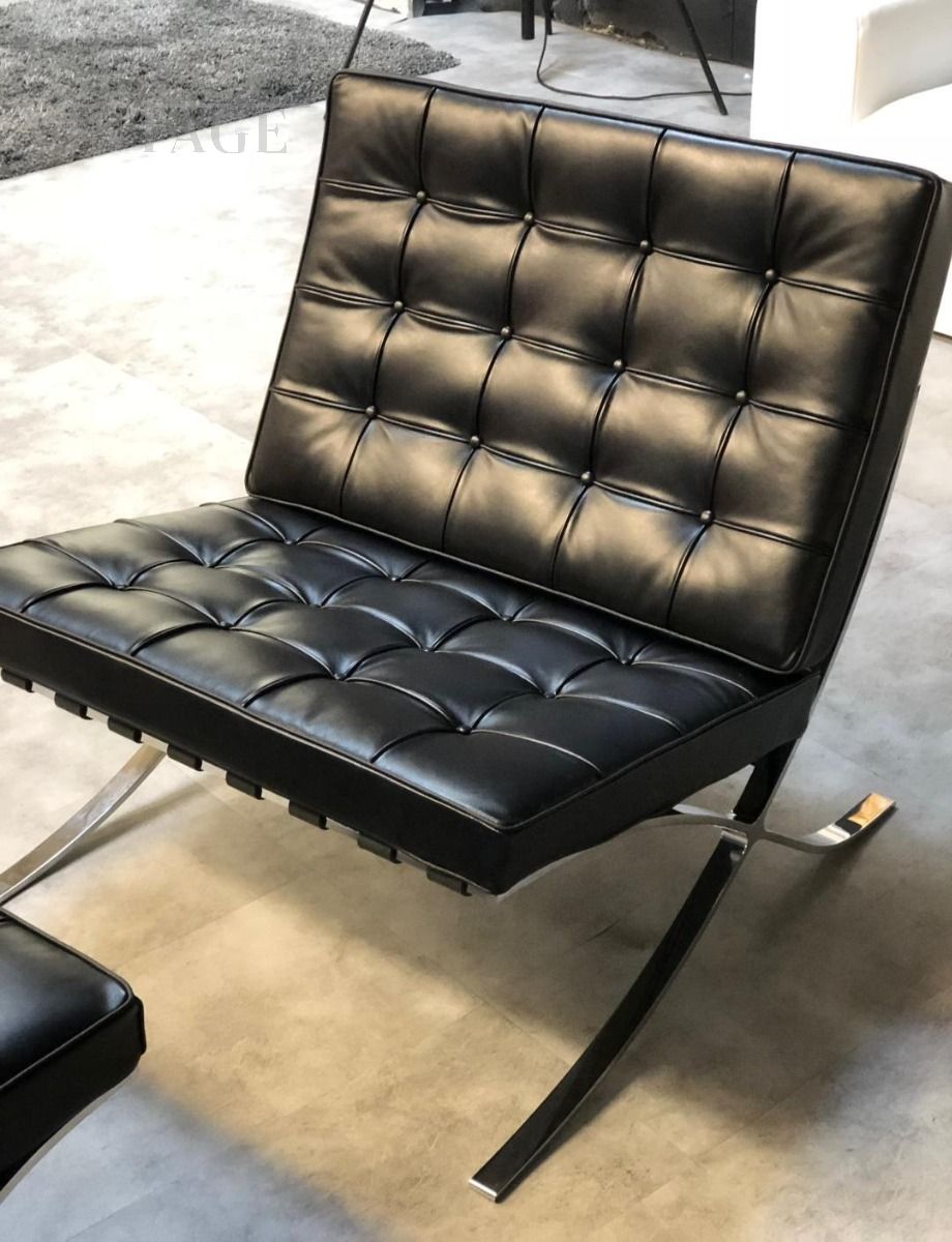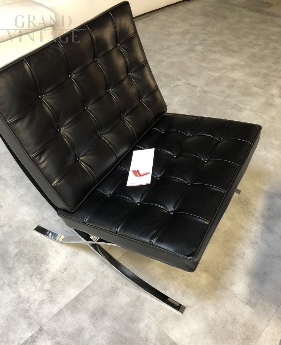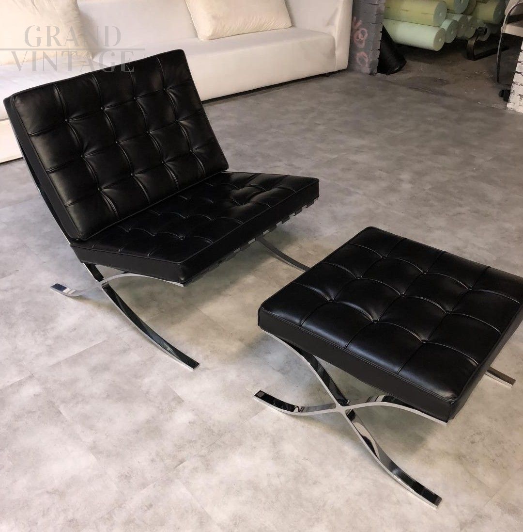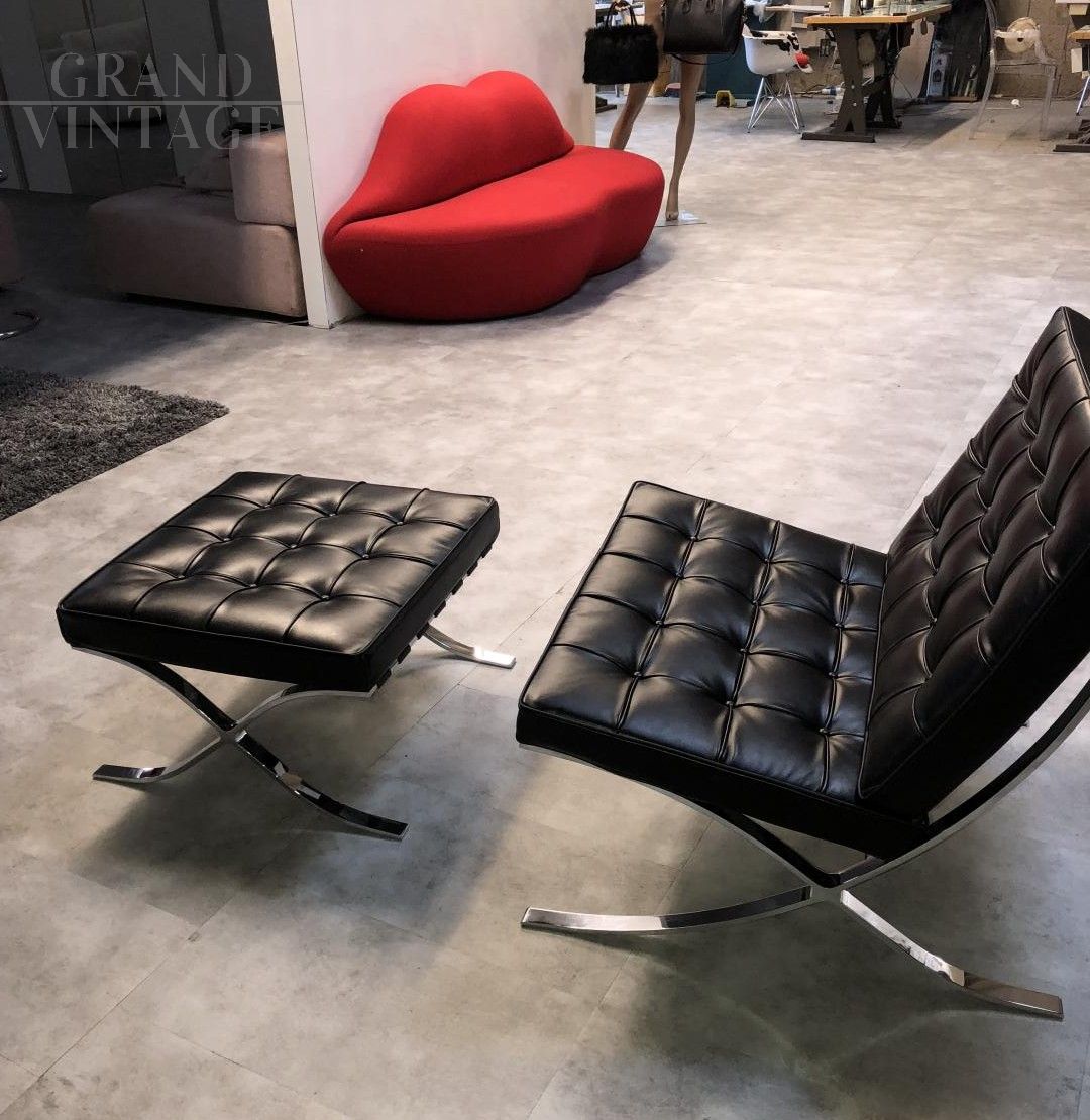 Magnifica poltrona Barcelona originale completa di pouf, progettata da Mies Van Der Rohe per Knoll e realizzata in pelle nera, il marchio è visibile sia sulla struttura sua sotto la seduta. Mantenuta in ottimo stato di conservazione.