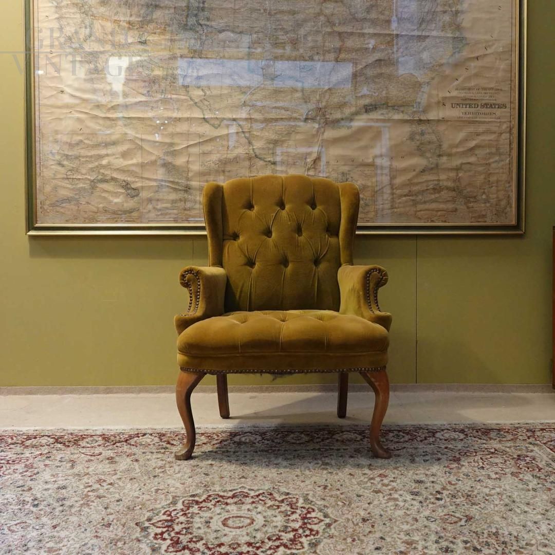 Poltrona bergère vintage in velluto giallo ocra dall'aspetto barocco, un pezzo unico che unisce eleganza e memoria del passato. Morbida, avvolgente e ricca di charme, è perfetta per arricchire ambienti con un tocco di lusso discreto e personalità autentica. Ideale per spazi dallo stile vintage, ricercato o creativo.