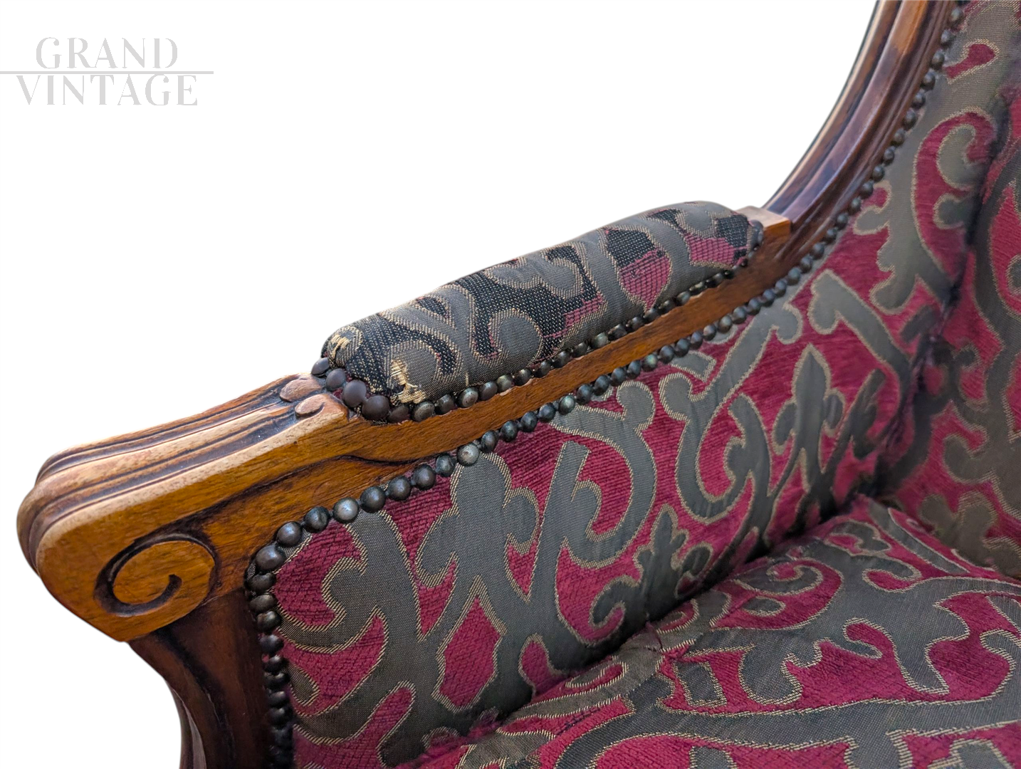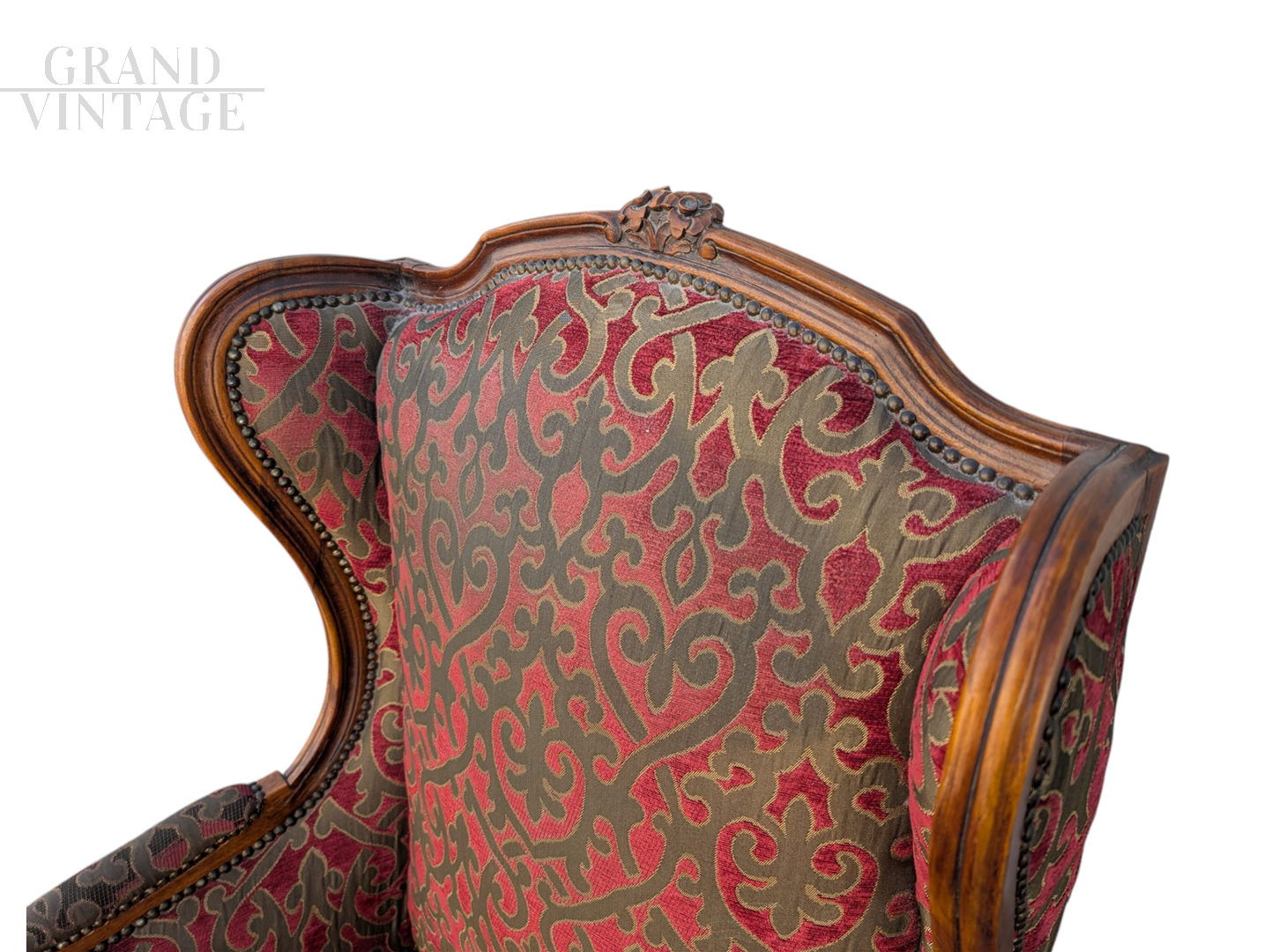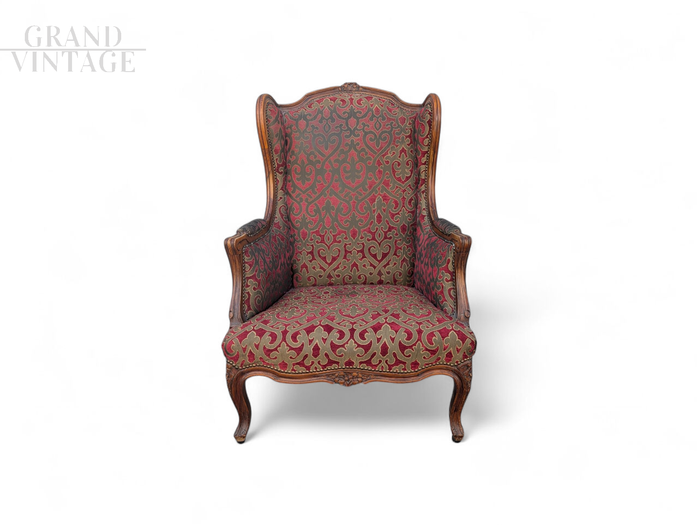 Elegante poltrona Bergère in stile Luigi XV, caratterizzata da una raffinata struttura in legno intagliato a mano, con gambe cabriole e motivi floreali scolpiti. L’imbottitura è rivestita con un tessuto damascato a motivi barocchi in tonalità rosso e oro antico, fissato con una fila di borchie decorative che ne esaltano il profilo. La forma avvolgente dello schienale alto e bombato, unita ai braccioli sagomati e al sedile ampio, conferisce alla seduta un perfetto equilibrio tra comfort e stile classico. Ideale per ambienti d’epoca, salotti eleganti o angoli lettura sofisticati. Dimensioni: Altezza: 105 cm Larghezza: 71 cm Profondità: 70 cm Altezza seduta: 50 cm