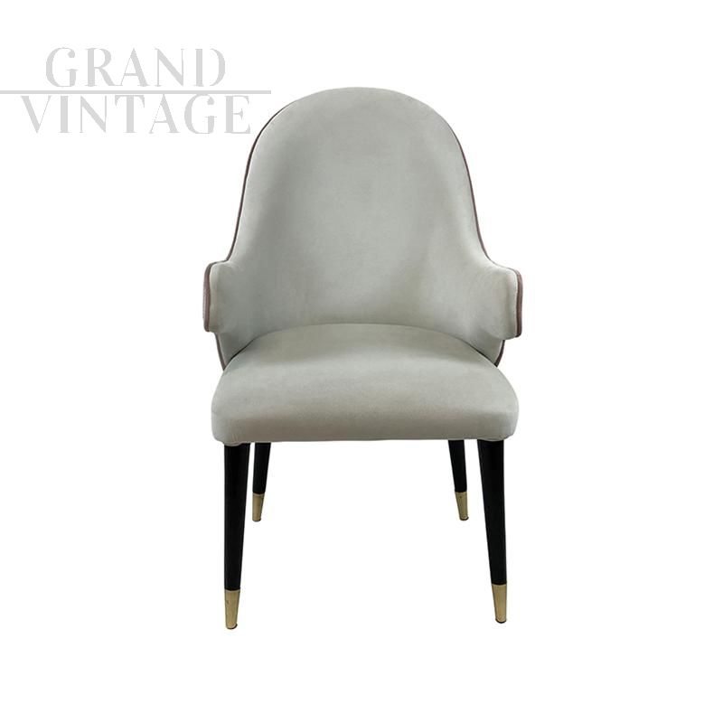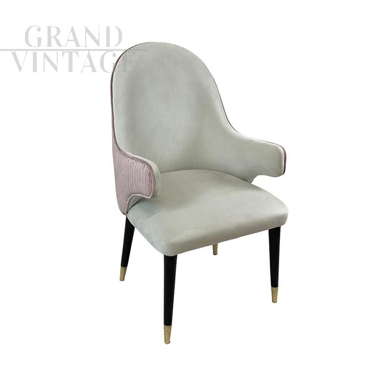 Poltroncina capotavola in velluto rosa tenue e bianco, con piedi in legno laccato nero e finale in ottone. Disponibili diversi pezzi.