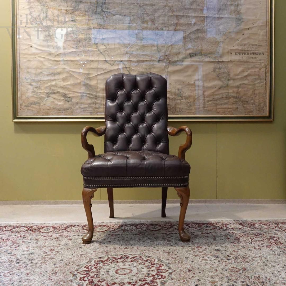 Classica poltrona sedia Chesterfield inglese, con la sua iconica lavorazione capitonné della pelle, braccioli arrotondati e rivestimento profondo. Un simbolo di eleganza, prestigio e tradizione britannica,