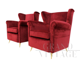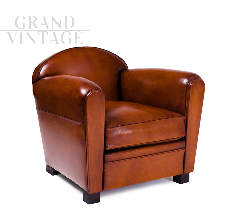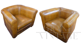 Poltroncine Club in stile vintage in vera pelle di montone pieno fiore, con schienale e braccioli arrotondati, dalla seduta profonda e avvolgente, con cuscino sfoderabile. Le poltrone sono realizzate artigianalmente con una bella patina antica che gli dona un aspetto retrò. La struttura è in legno di faggio massiccio, le molle biconiche sono cucite su una cinghia in tela di juta su seduta e shienale. L'imbottitura è in schiuma bultex e piuma, e i piedi sono completi di punte protettive per salvaguardare i pavimenti.