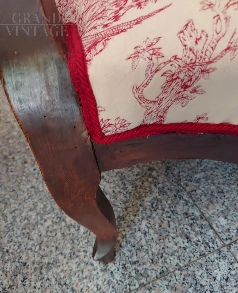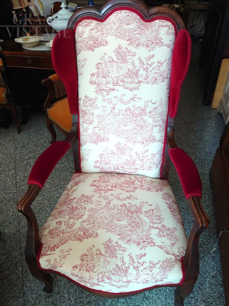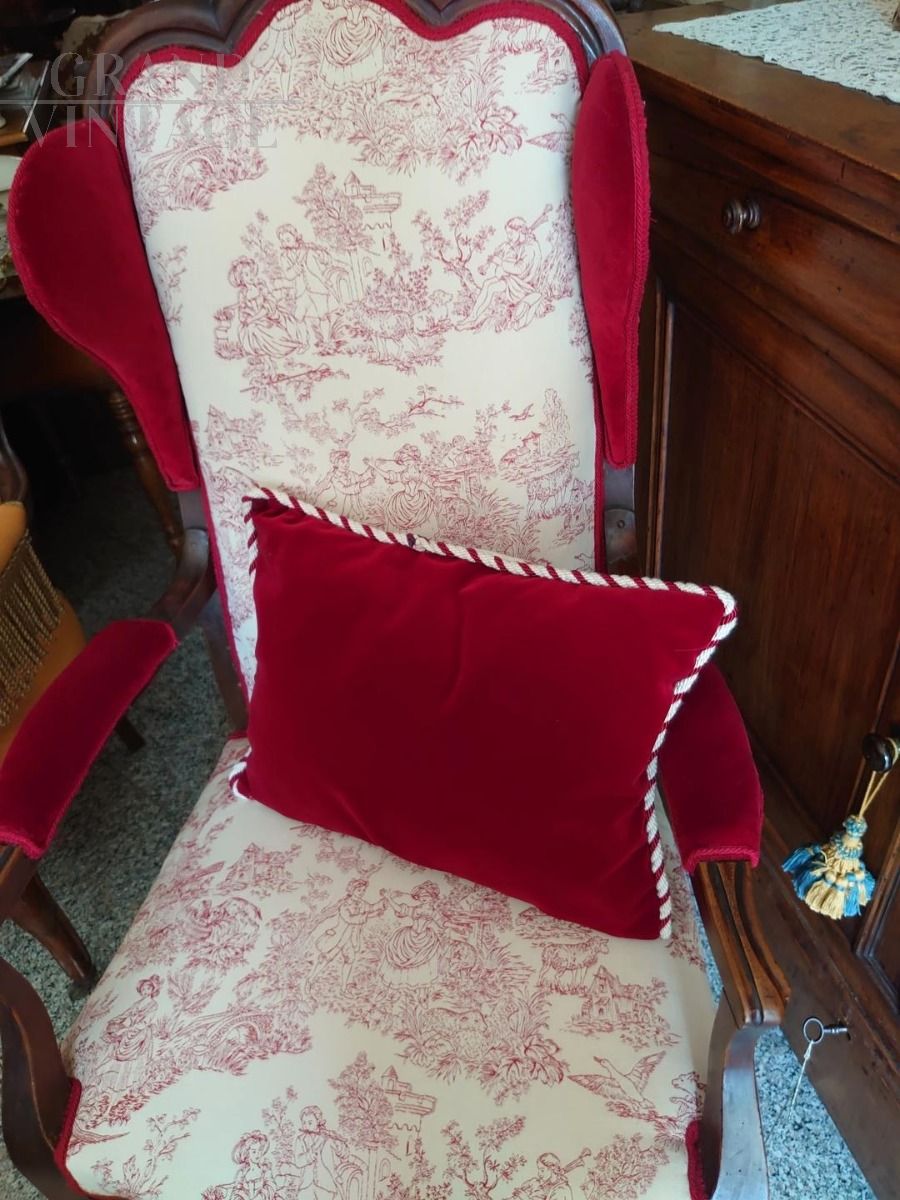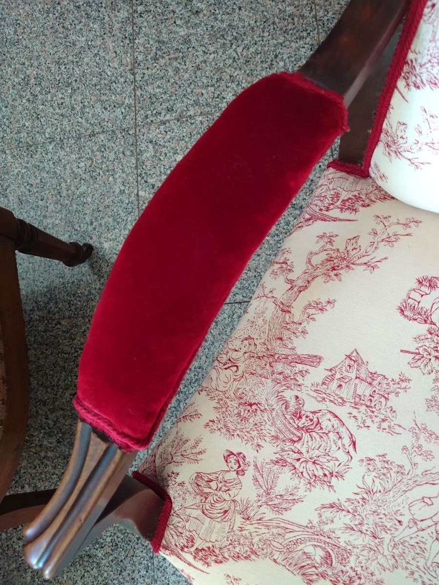 Poltrona d'epoca dei primi dell'800 tappezzata in velluto bordeaux e stoffa Toile de Jouy con i tipici motivi di scene galanti.