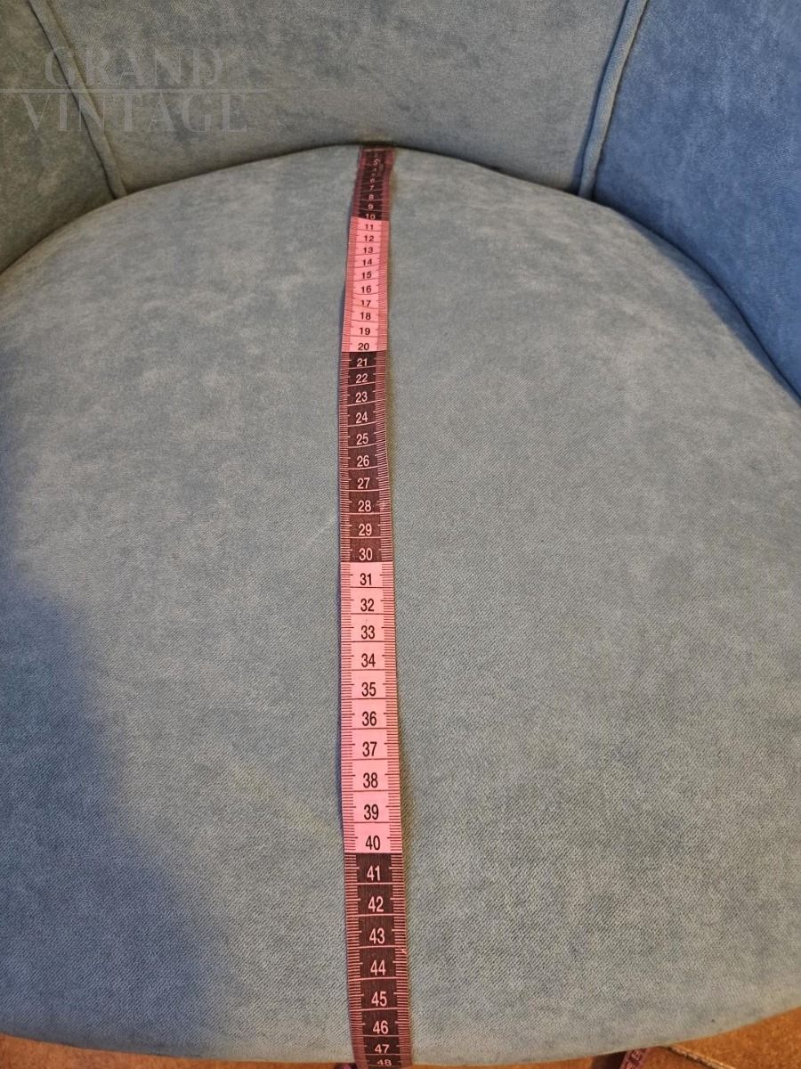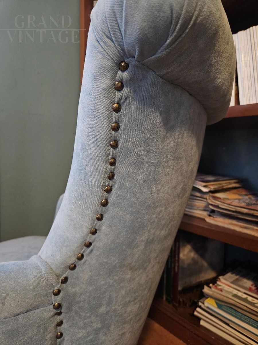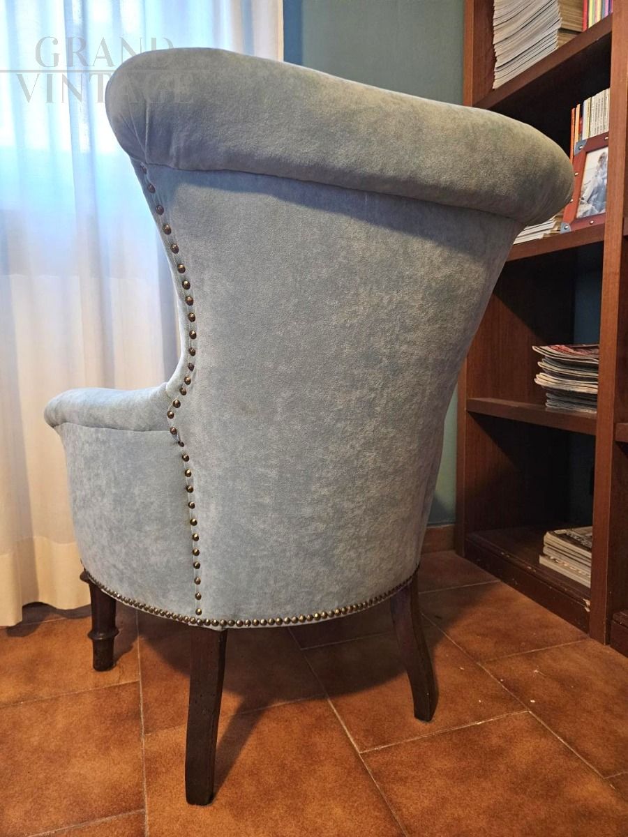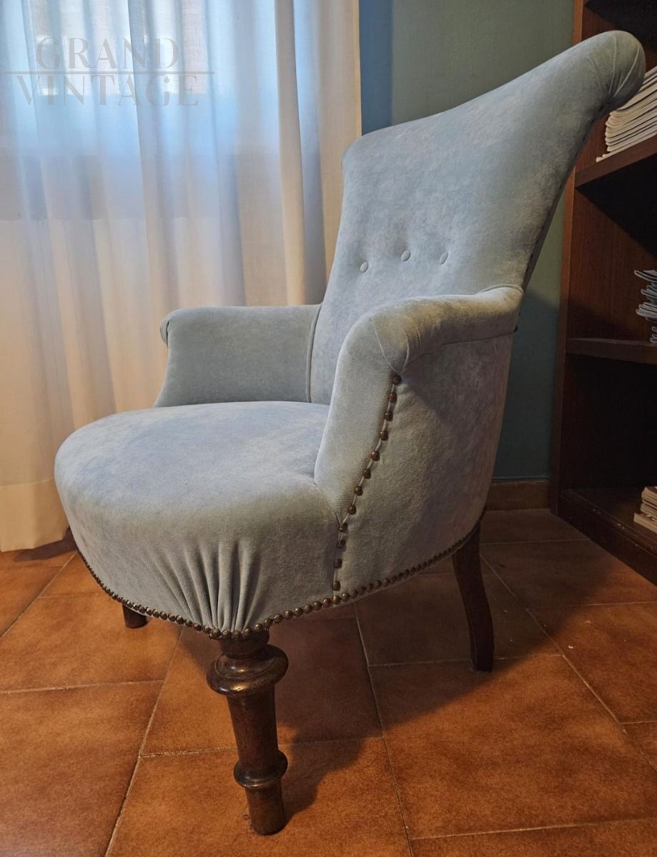 Poltroncina bassa antica da camera, modello nonnina, originale della fine del XIX secolo, rifoderata in velluto azzurro tenue e imbottita con tecnica tradizionale a capecchio con molleggio e cinghie di iuta. Completamente restaurata, in ottime condizioni.