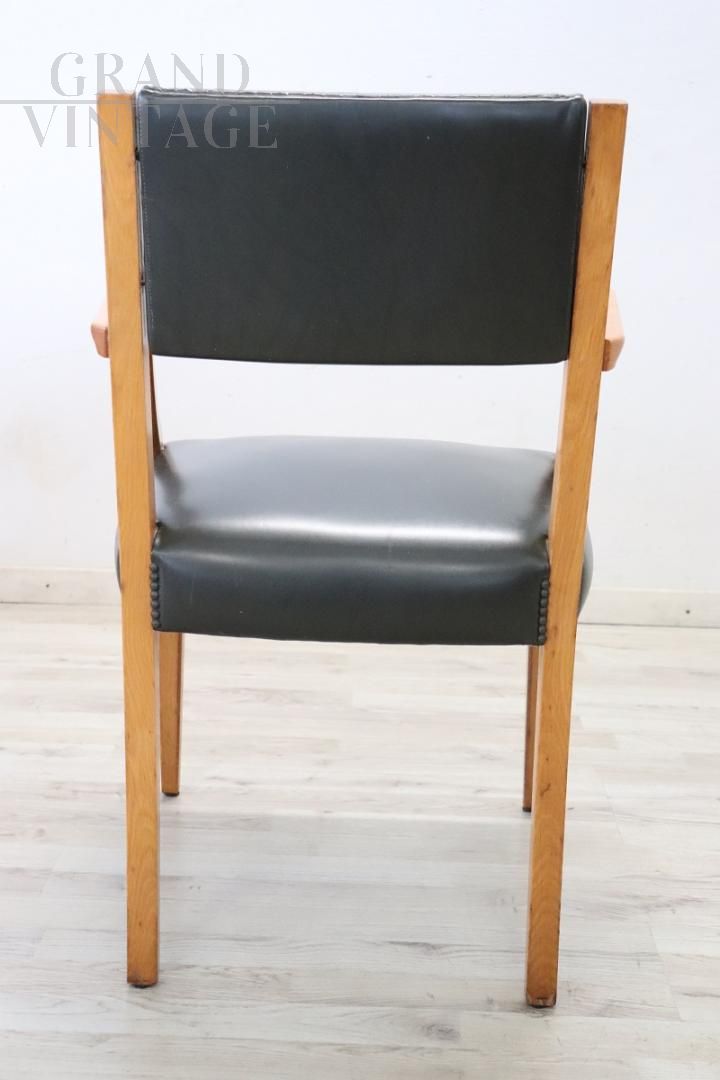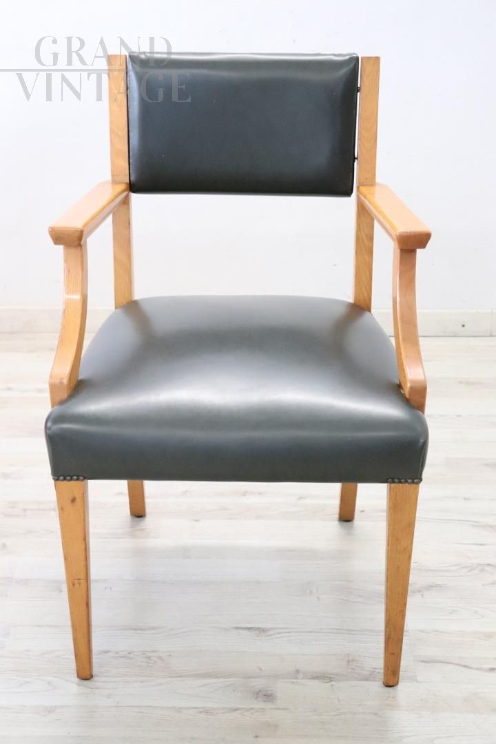 Poltrona da ufficio vintage italiana degli anni '50 - '60 in stile art déco con struttura in massello di rovere chiaro, mentre la seduta e lo schienale imbottiti sono rivestiti in ecopelle verde. Questa poltrona può essere utilizzata ovunque, ma il suo schienale dritto la rende perfetta per l'uso con una scrivania. È in ottime condizioni, con lievi segni d'usura dovuti all'età, ma non ci sono difetti rilevanti da segnalare. Questa poltrona è pronta per essere utilizzata immediatamente a casa vostra. Altezza della seduta 52 cm. Prezzo trattabile.