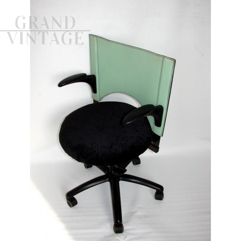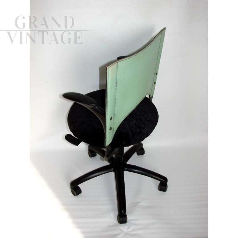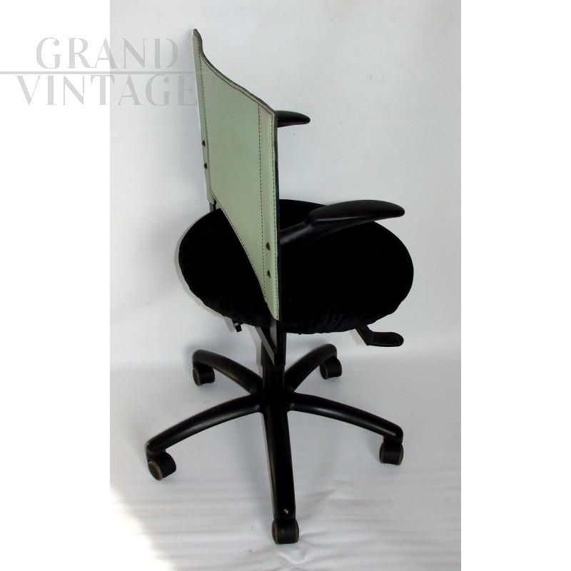 Poltrona sedia da ufficio Collezione Strassle, Svezia anni '80, schienale in pelle verde acqua e seduta in tessuto nero. La sedia è in buone condizioni, ha rotelle, altezza regolabile e funzione dondolo.
