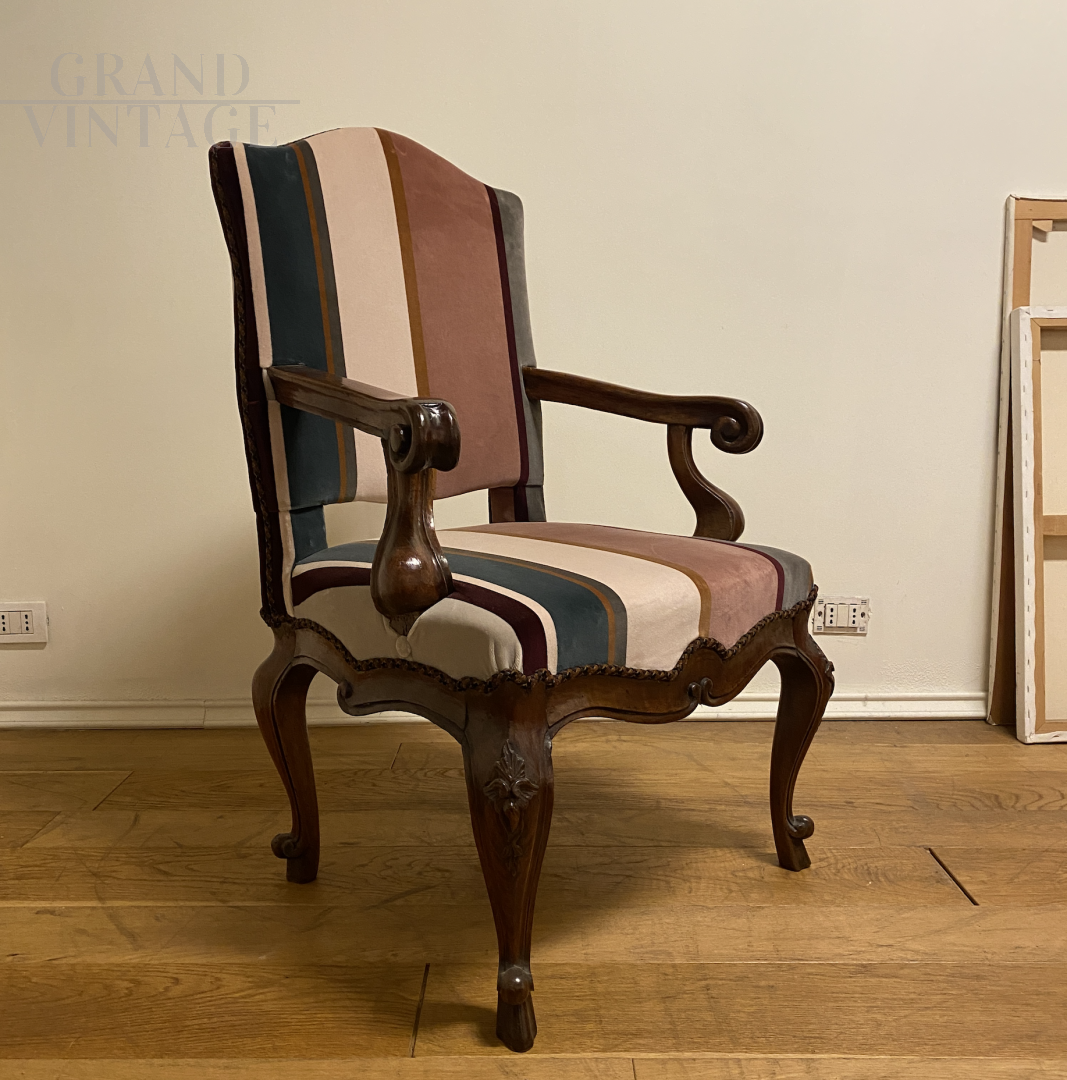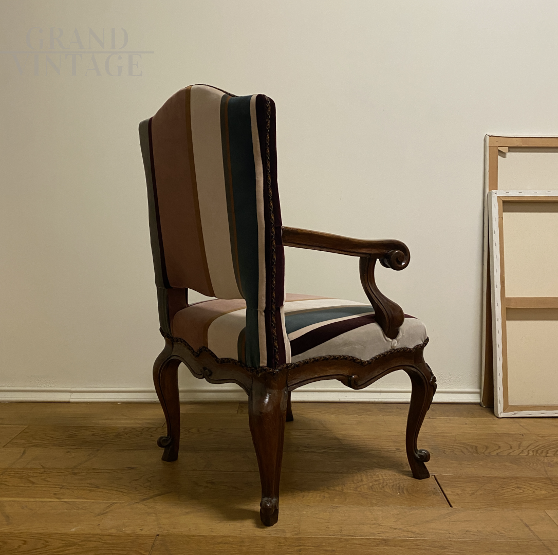 Poltrona antica barocca del '600 in noce con intaglio floreale, rivestita in velluto moderno a righe colorate. In condizioni perfette, recentemente restaurata sia nella parte lignea sia nell'imbottitura e del rivestimento.