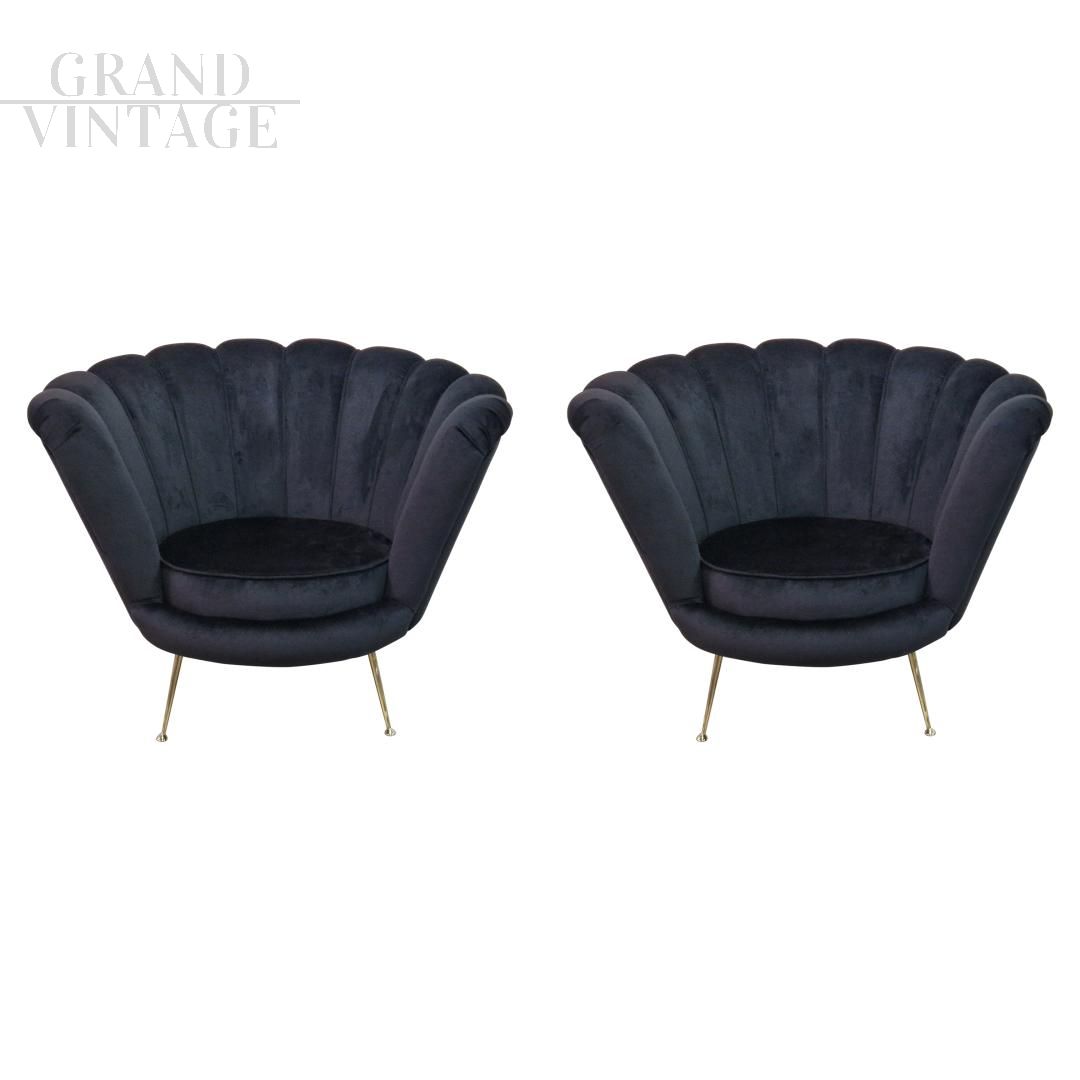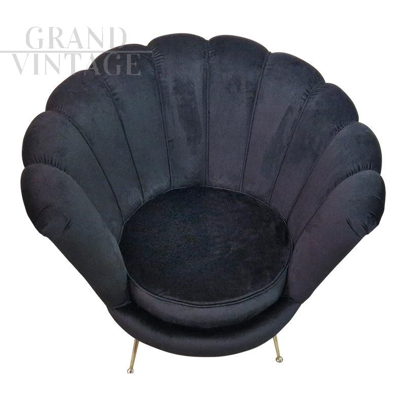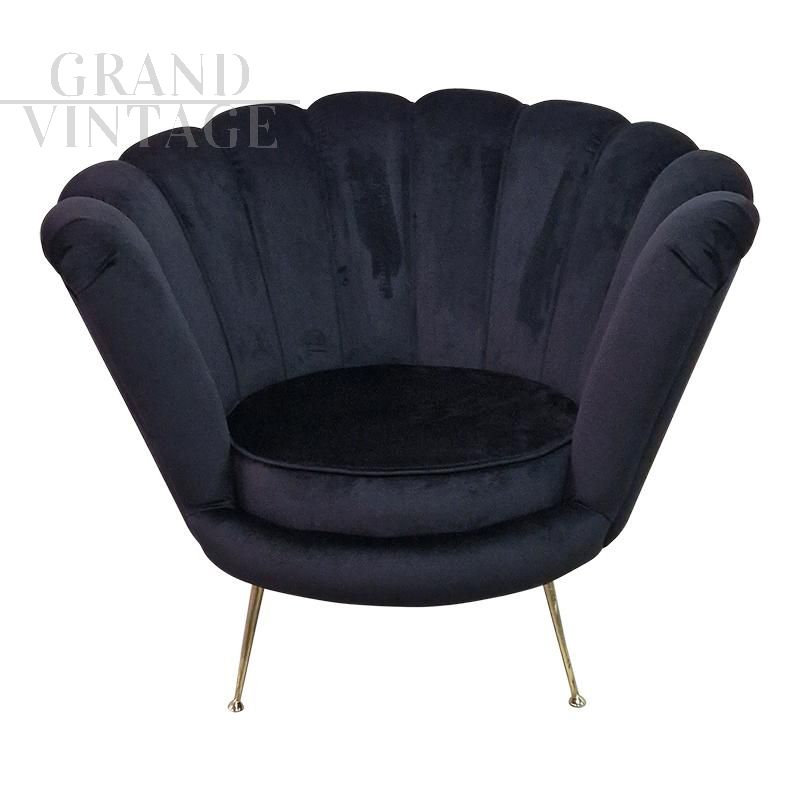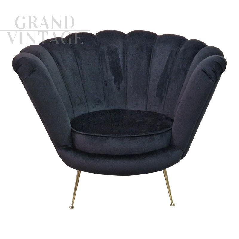 Elegante e comoda poltrona imbottita dalla forma accogliente e dallo stile glamour, con struttura in legno a semicerchio che include schienale e braccioli, rivestimento in tessuto di cotone nero e gambe a spillo nero con finiture in ottone dorato.