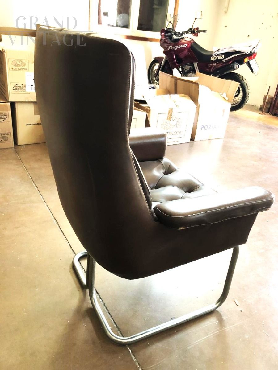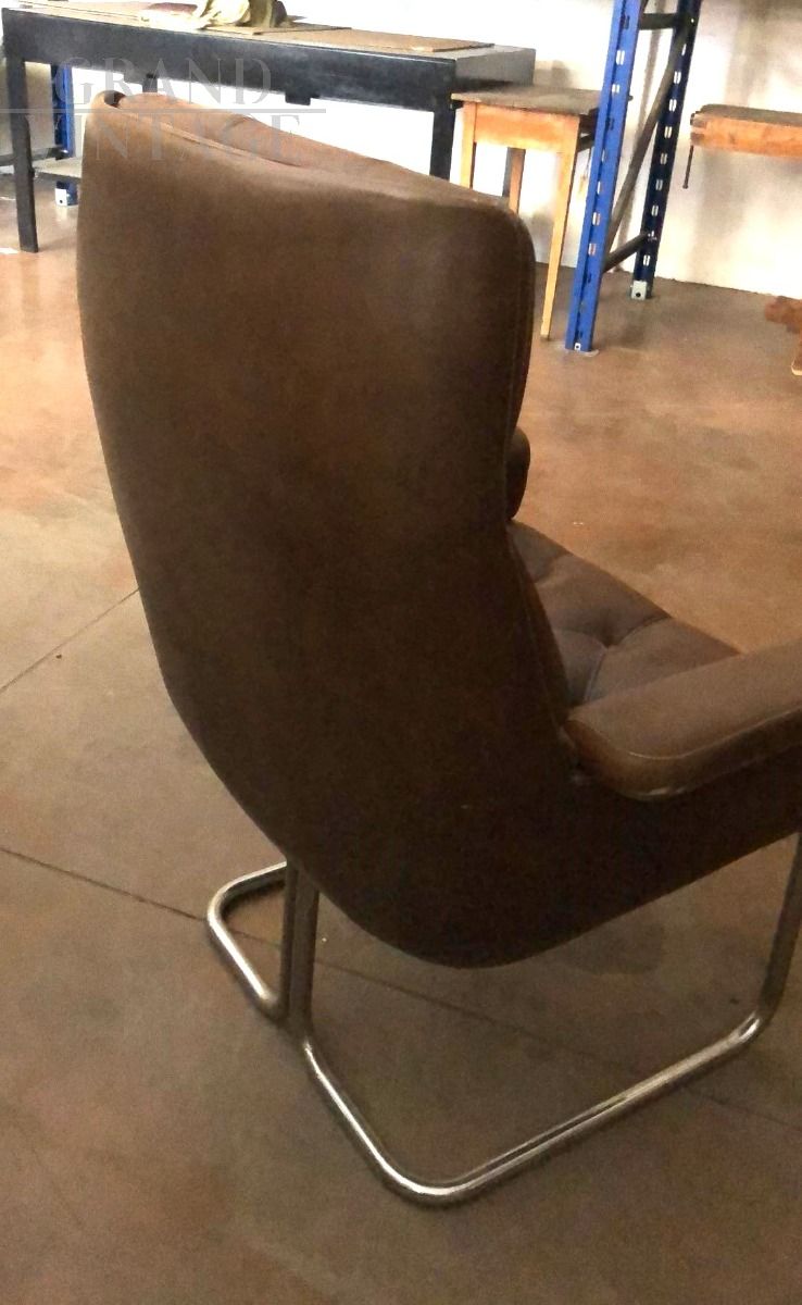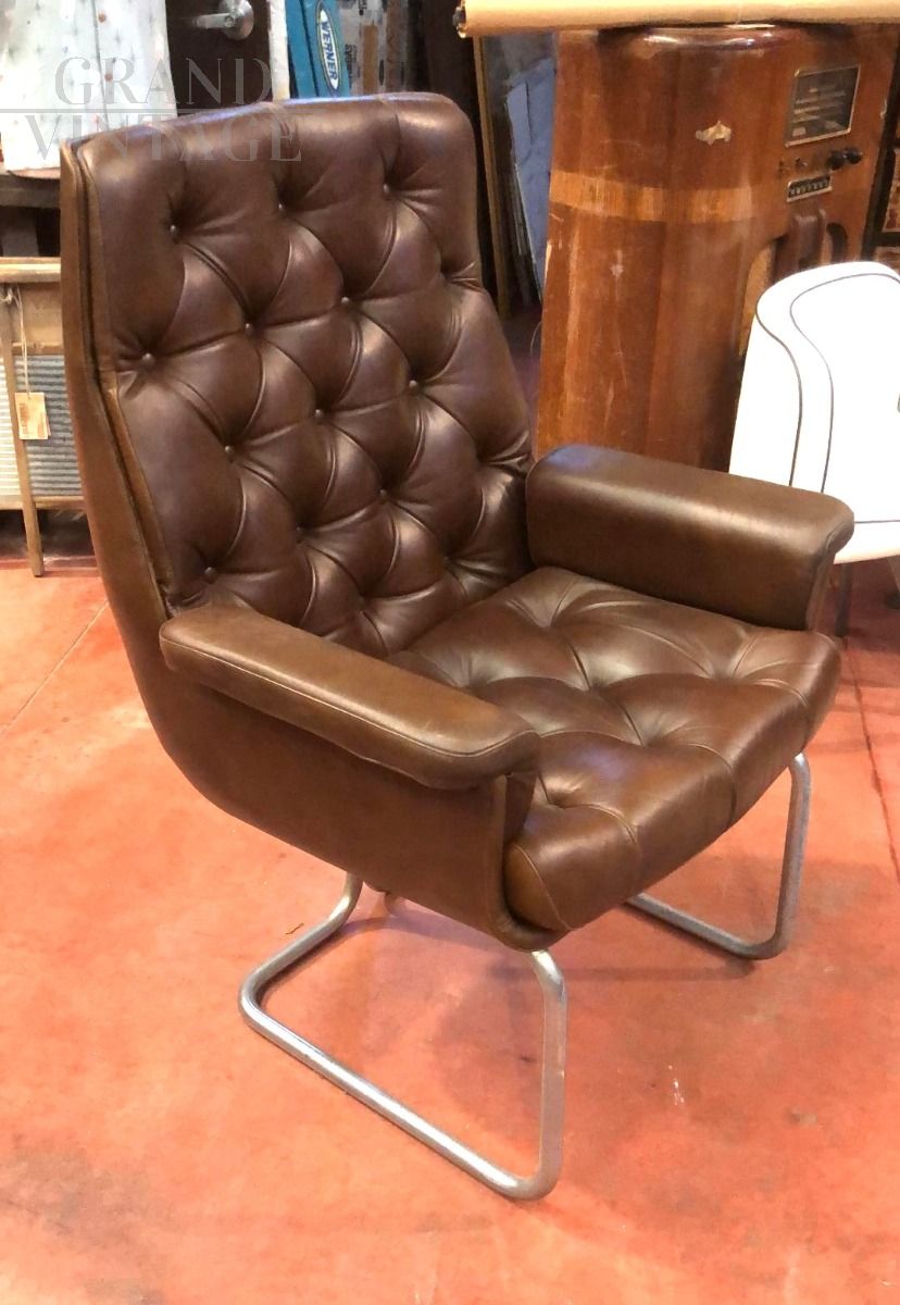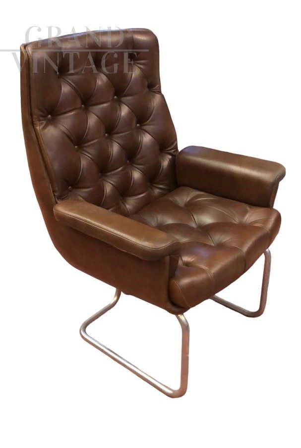 Poltrona o sedia in pelle marrone con lavorazione capitonné e base in metallo tubolare, in ottimo stato. Disponibili più pezzi, che facevano parte di una sala riunioni attorno ad un tavolo direzionale.