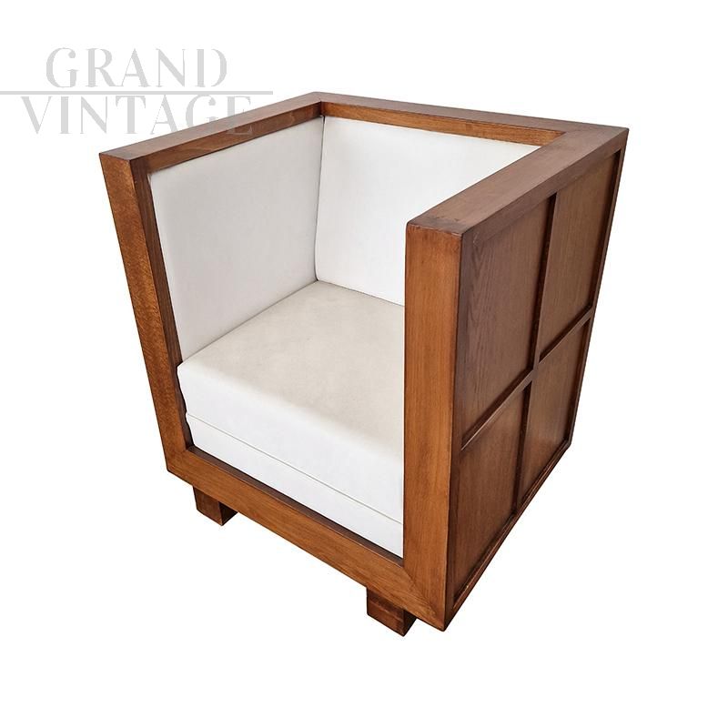 Poltrona a pozzetto in stile Art Déco con struttura squadrata in legno di noce; seduta, schienale e fianchi interni sono imbottiti e rivestiti in pelle bianca.