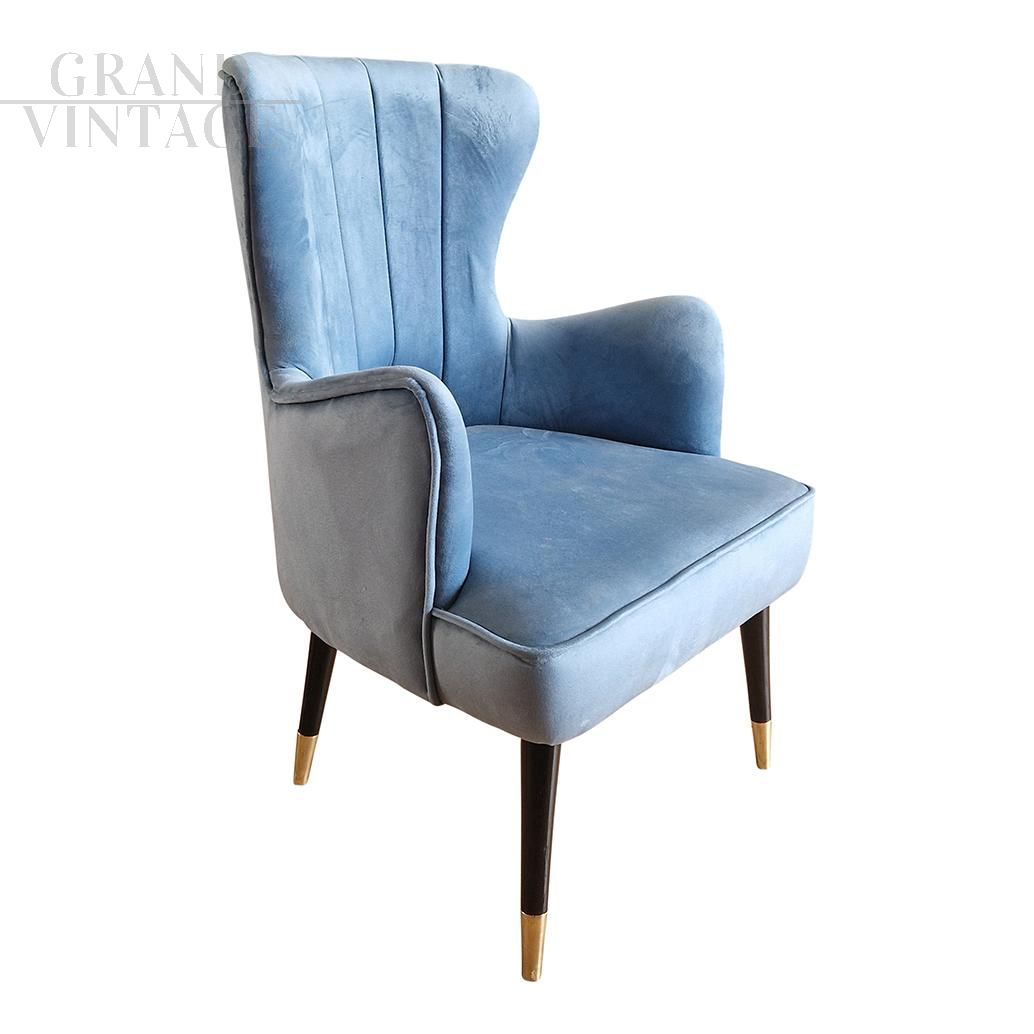 Poltrona design in stile art déco in velluto azzurro con piedi in legno laccato nero e finale in ottone.