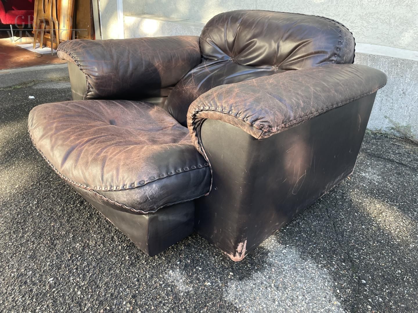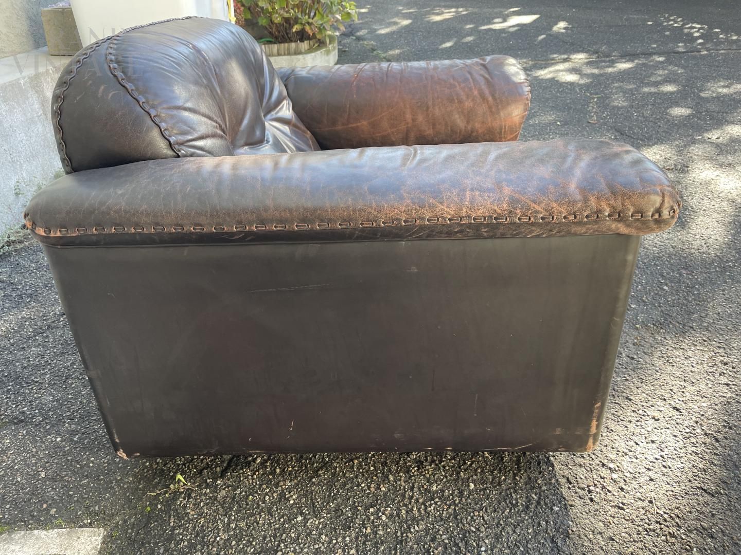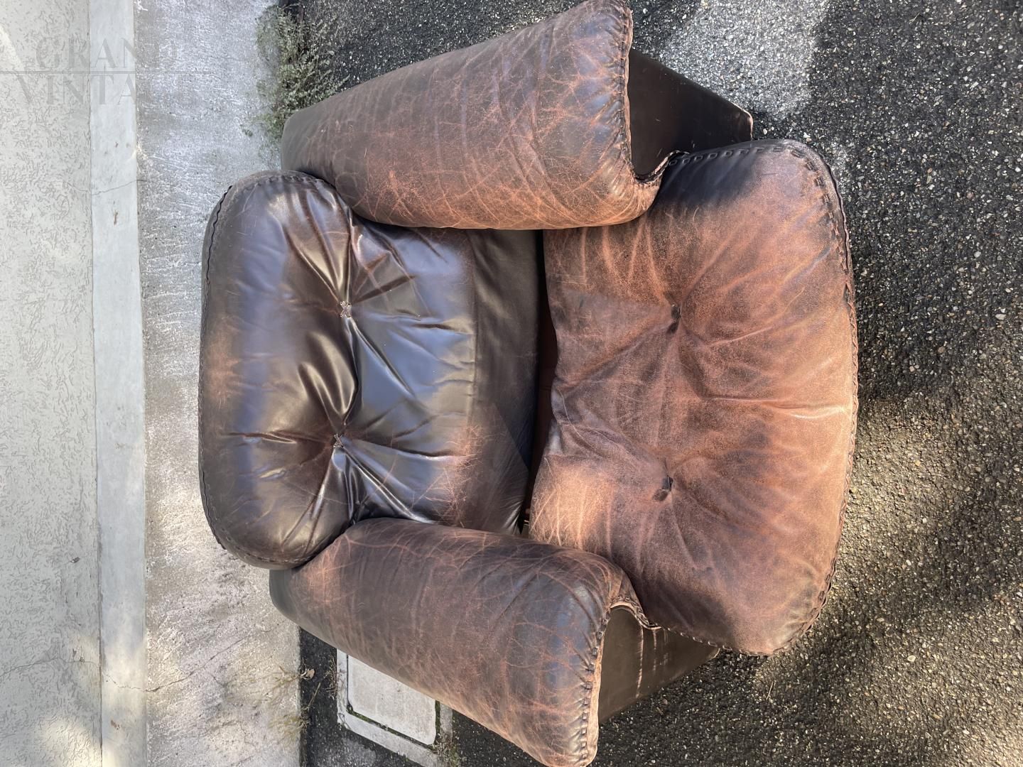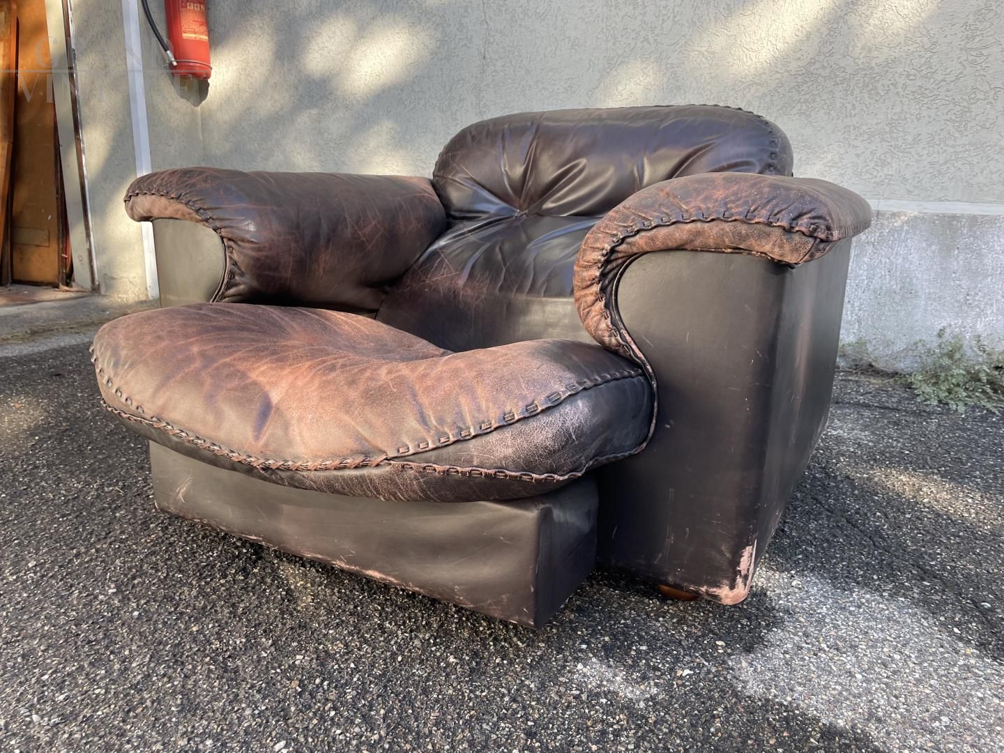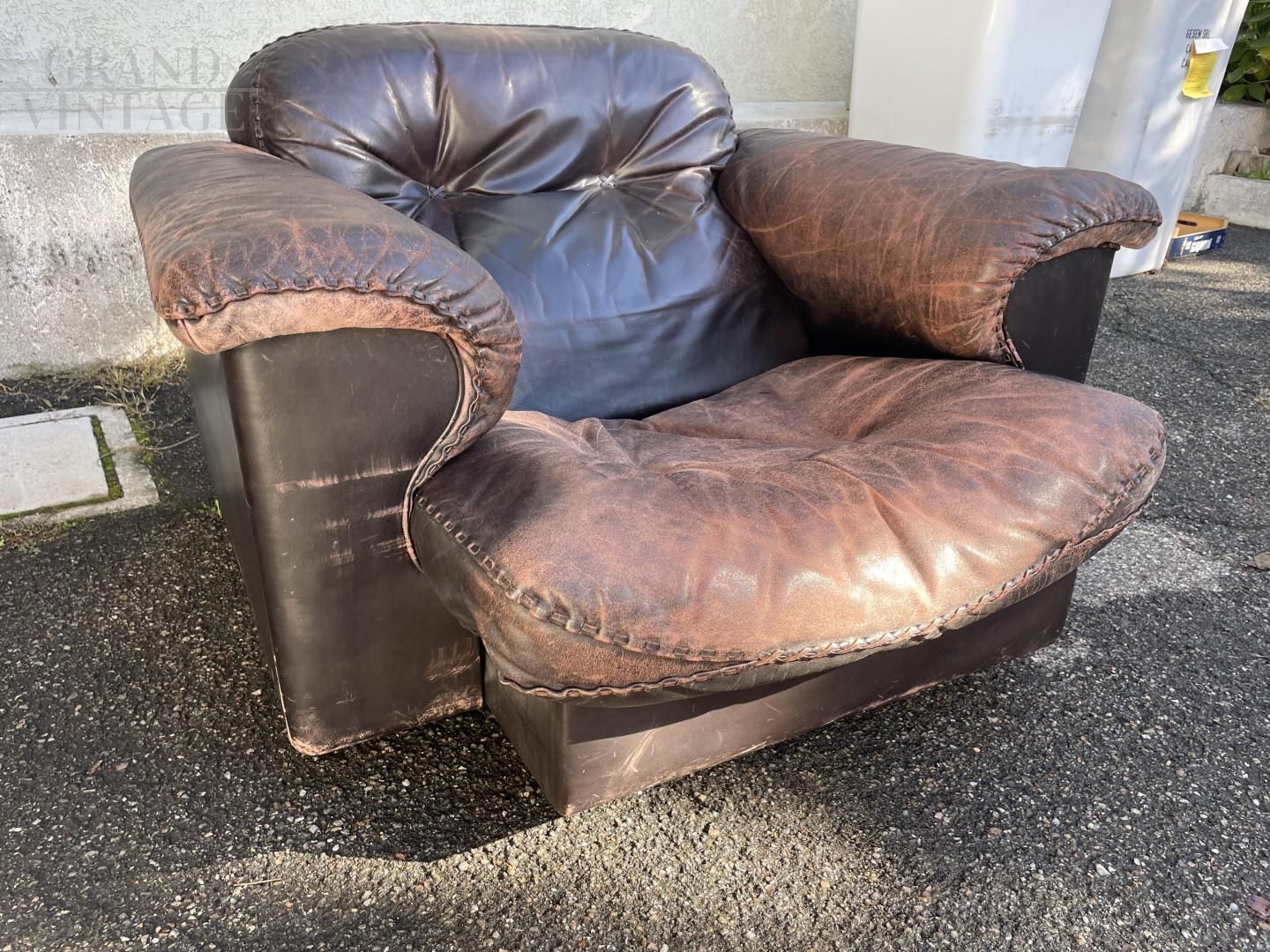 Poltrona design DS-101, ultra rara e comodissima, rivestita con cuoio di alta qualità color tabacco, dalla casa di mobili svizzera di fama mondiale De Sede. Presente nel film di James Bond Al servizio di Sua Maestà, i pezzi De Sede DS-101 sono di qualità impareggiabile, e mostrano dettagli ed esecuzione di uno standard ineguagliabile. Questa poltrona ha qualche segno superficiale di usura che le garantisce un certo fascino, i difetti sono facilmente eliminabili con una semplice lucidatura del cuoio. Tutti i meccanismi reclinabili funzionano perfettamente, estraendo il poggiapiedi inferiore si reclina lo schienale. Unico lavoro da fare, se lo si desidera, è la sostituzione delle fasce elastiche della seduta che con il tempo si sono lasciate andare.