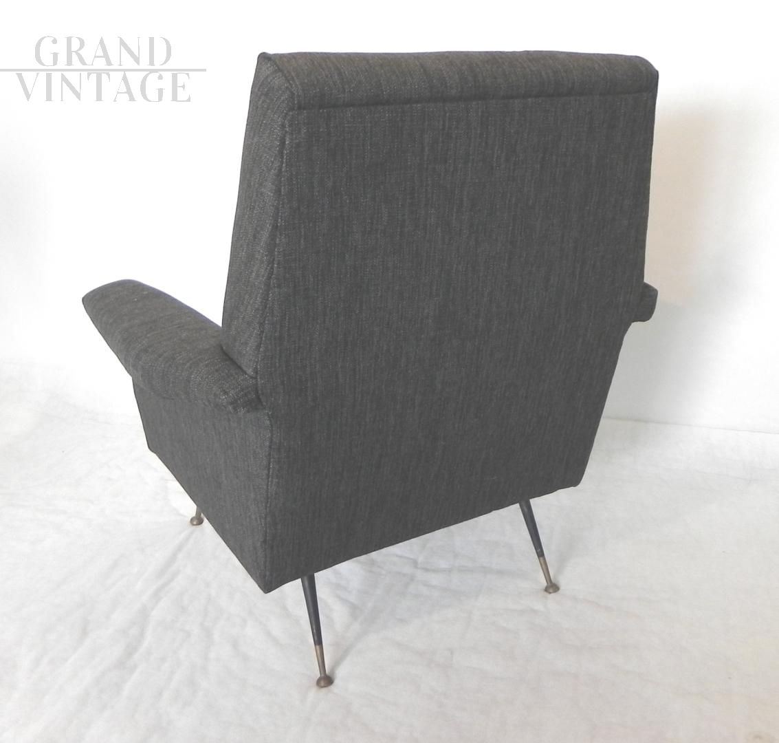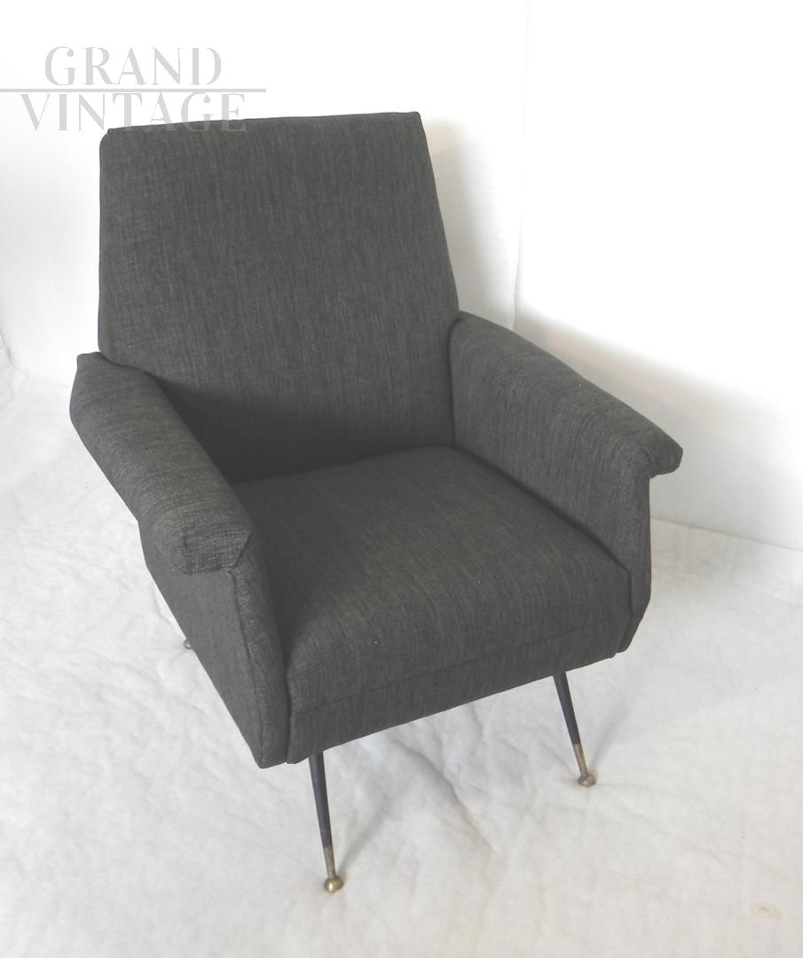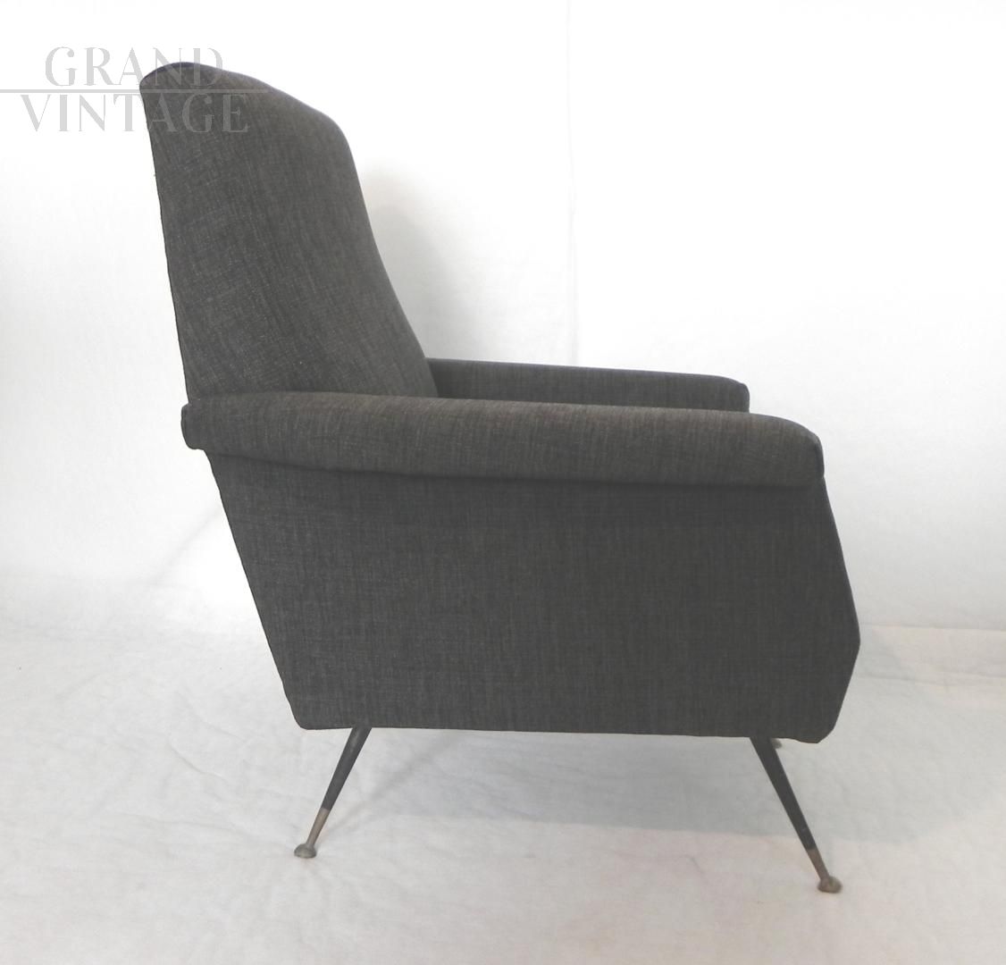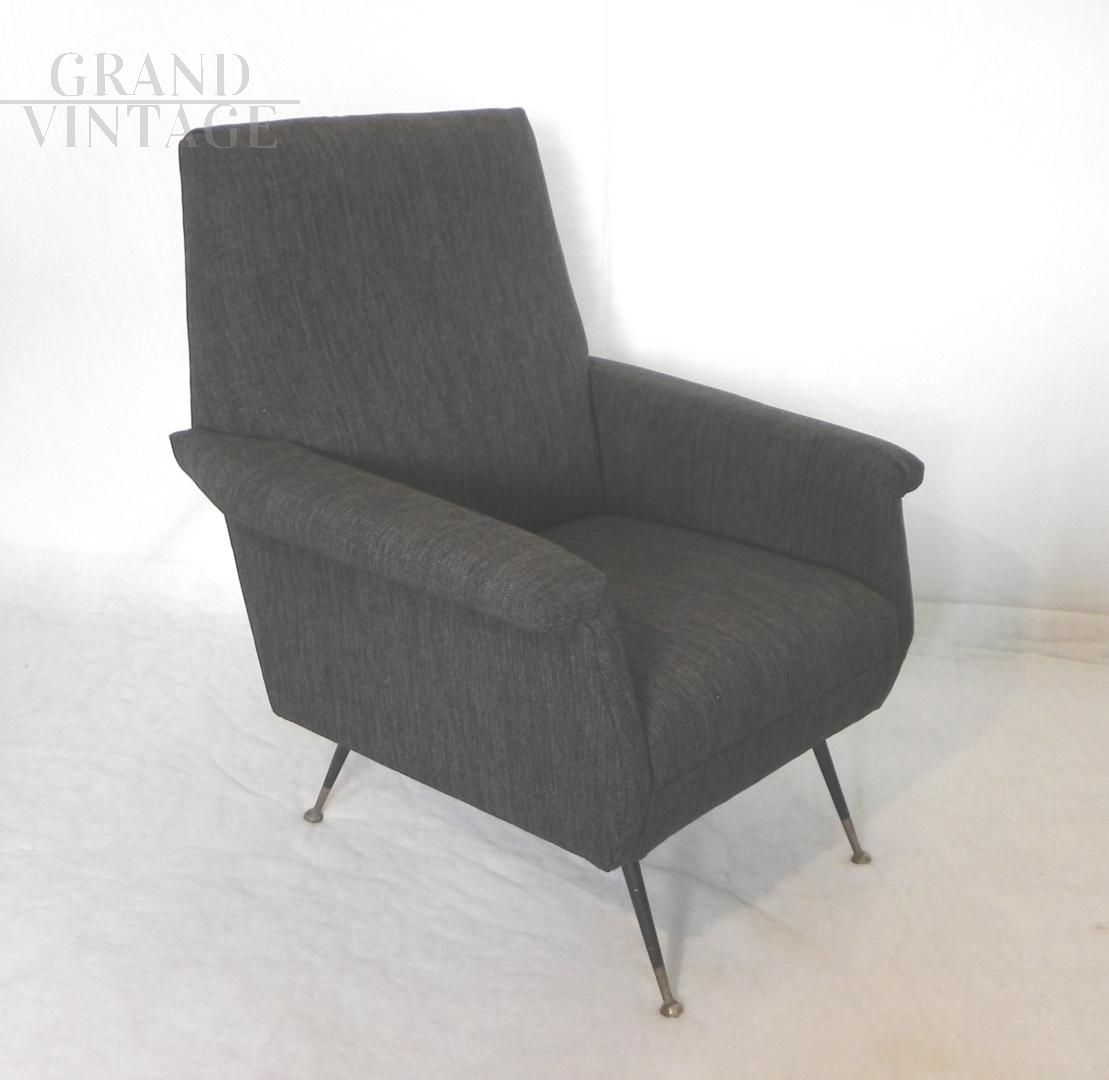 Poltrona modernariato anni '60 in tessuto grigio scuro, restaurata