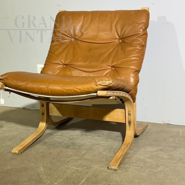 Poltrona modello Siesta di Ingmar Relling per Westnofa realizzata in legno di faggio curvato, con cuscini in pelle marrone originali, design scandinavo anni '60.