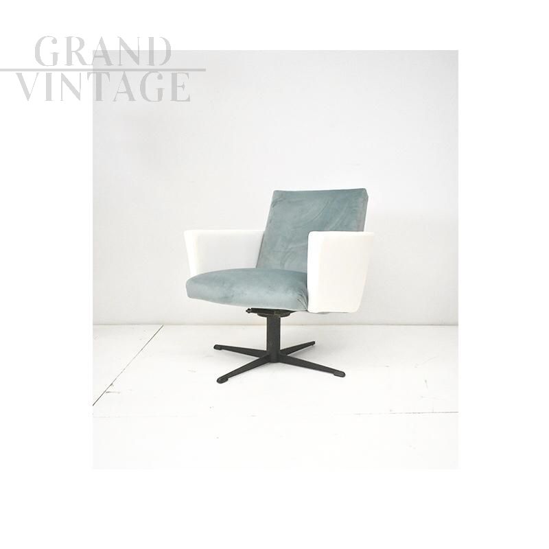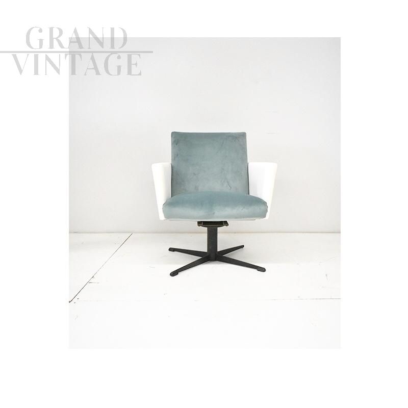 Poltrona girevole vintage anni Sessanta, manifattura Italiana. La poltrona presenta una struttura in ferro nero, con braccioli in similpelle bianca e seduta e schienale in velluto acquamarina.