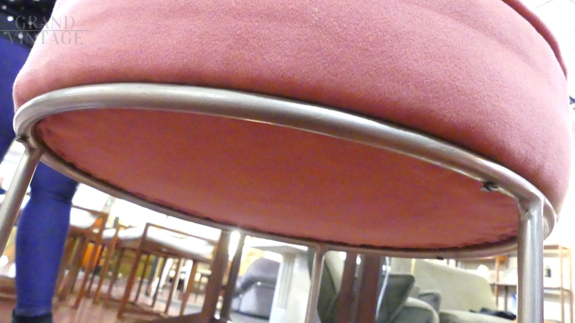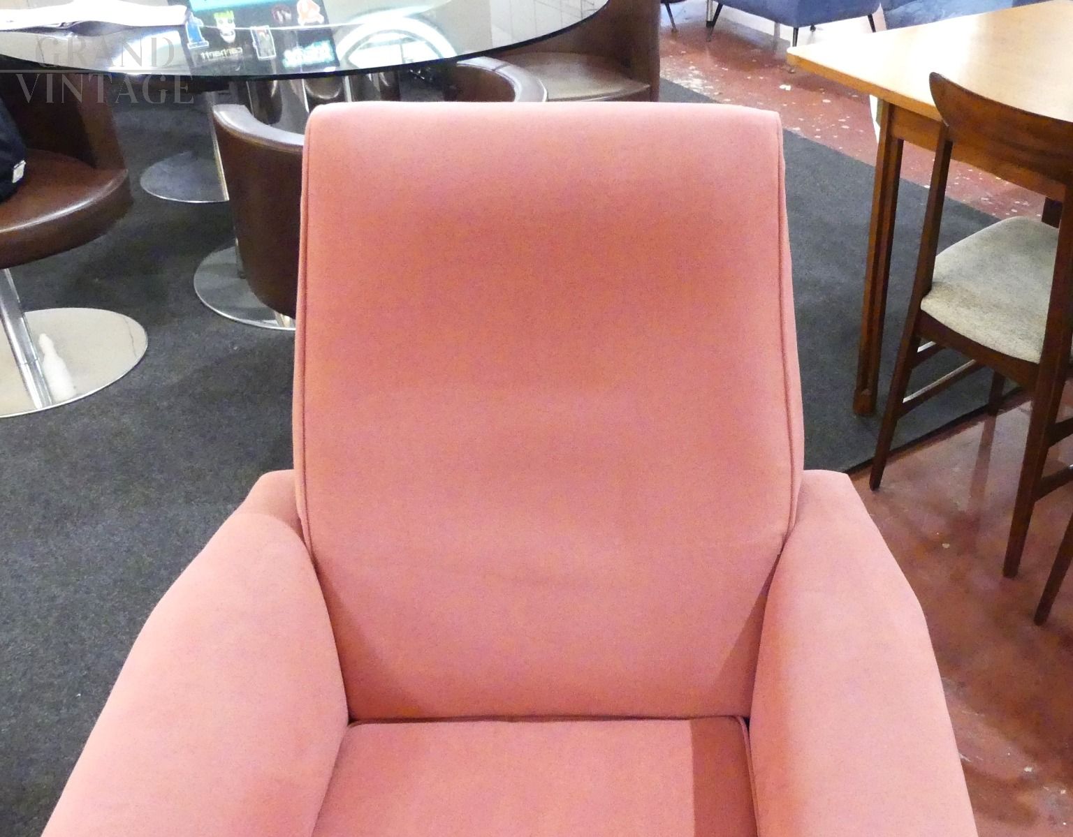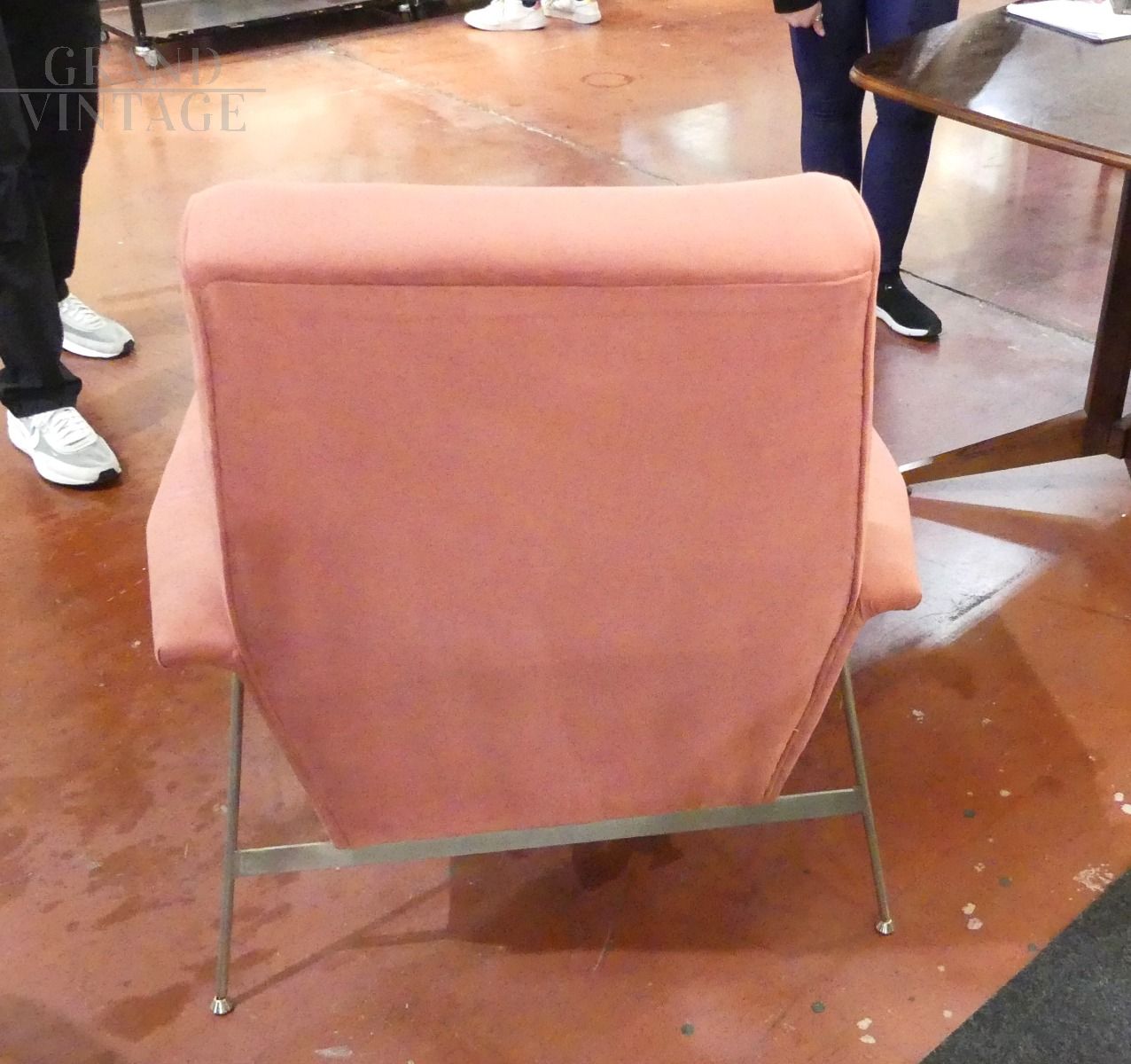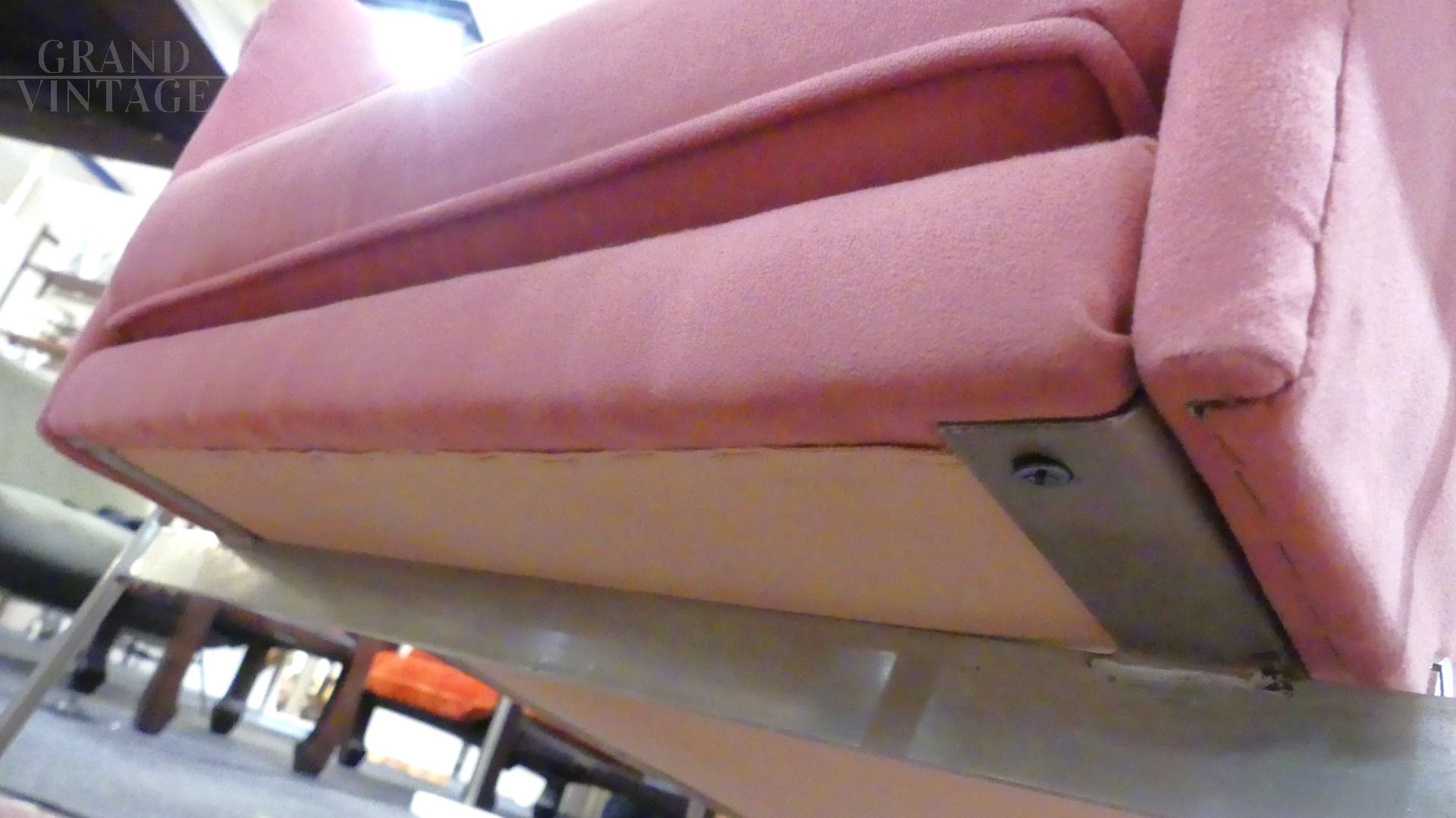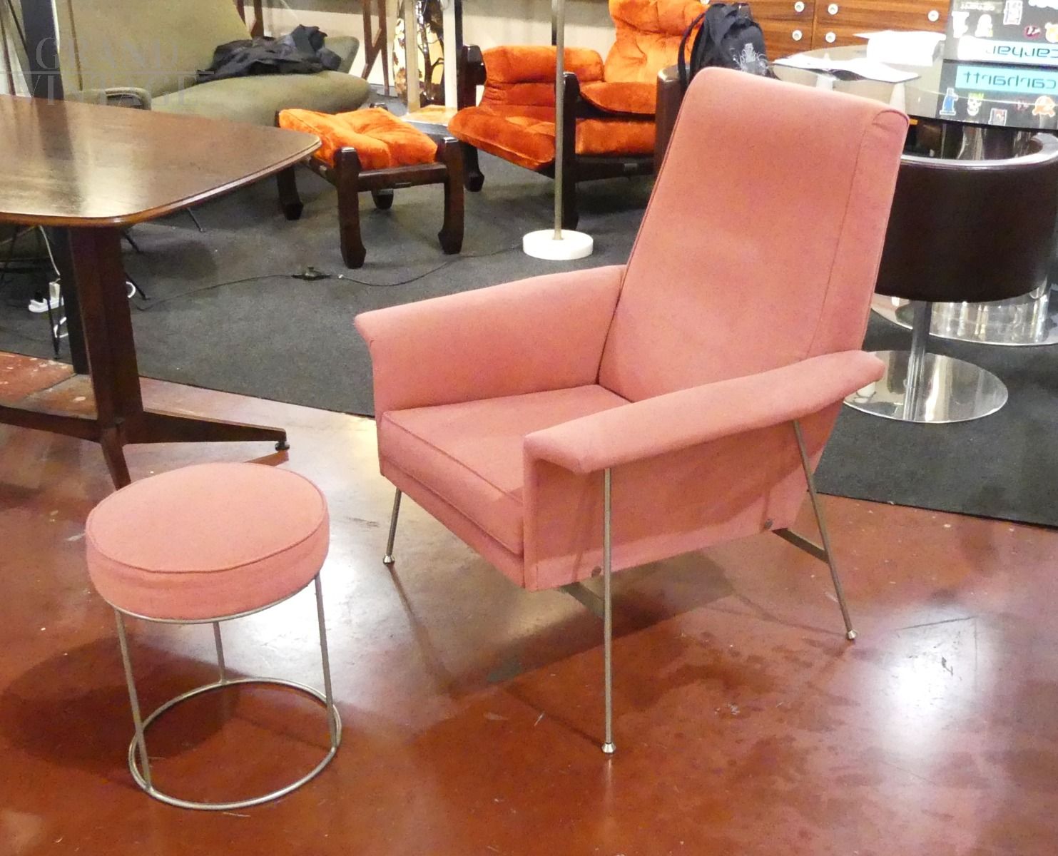 Poltrona vintage con pouf in vellutino rosa su struttura in ferro, anni '60 - '70, rifoderata negli anni '90, in ottime condizioni. Sia la poltrona che il pouf sono smontabili per agevolarne il trasporto.