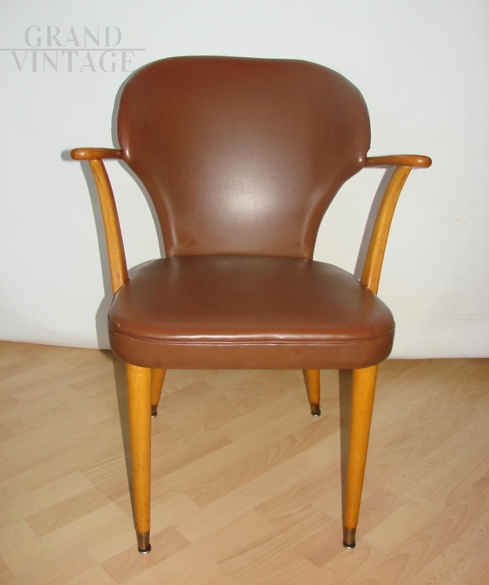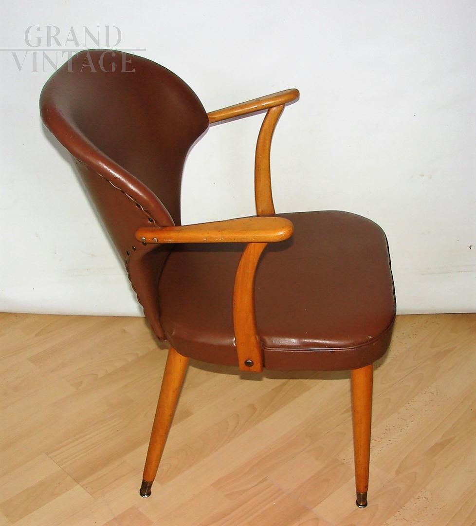 Poltrona modernariato anni '60 realizzata in legno di faggio, imbottita e rivestita in ecopelle marrone, in buone condizioni, presenta dei graffi sul rivestimento (visibili in foto).