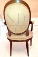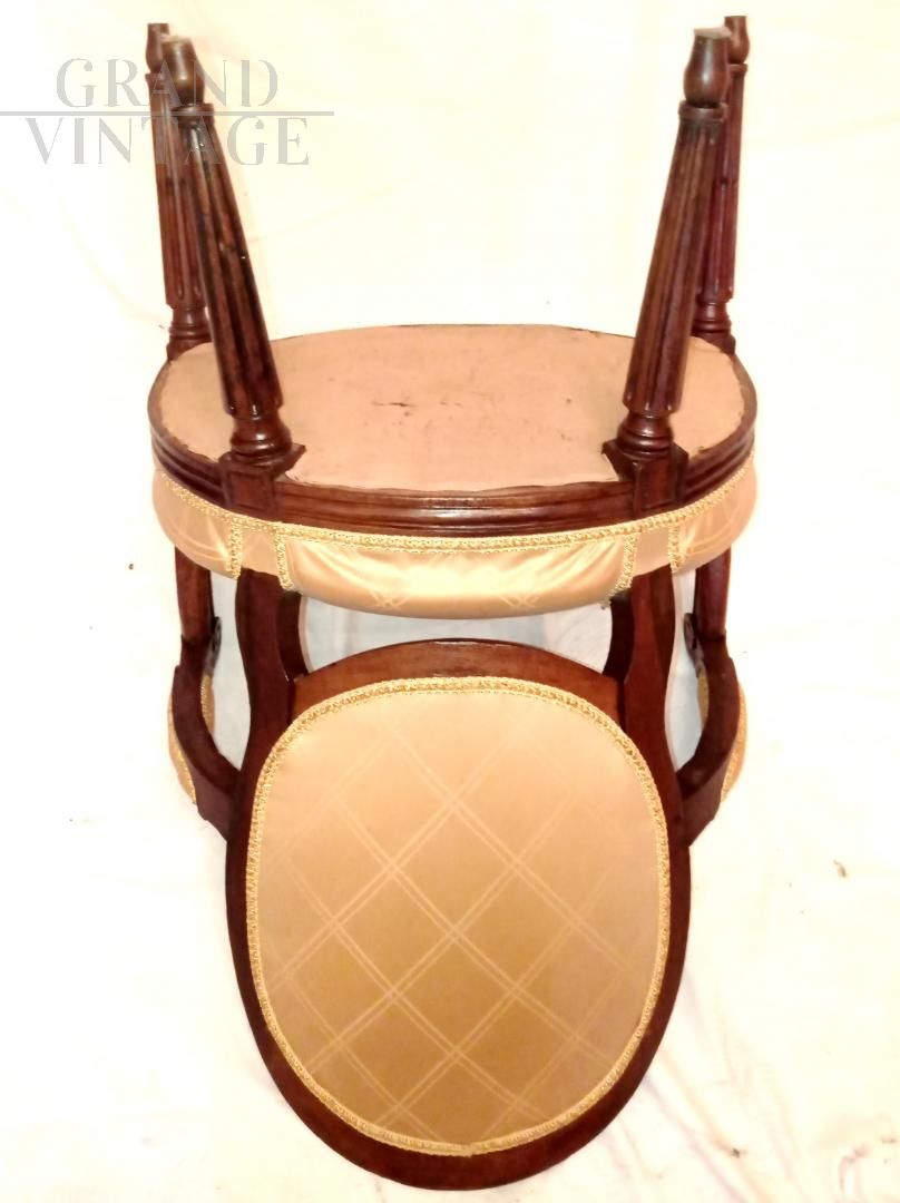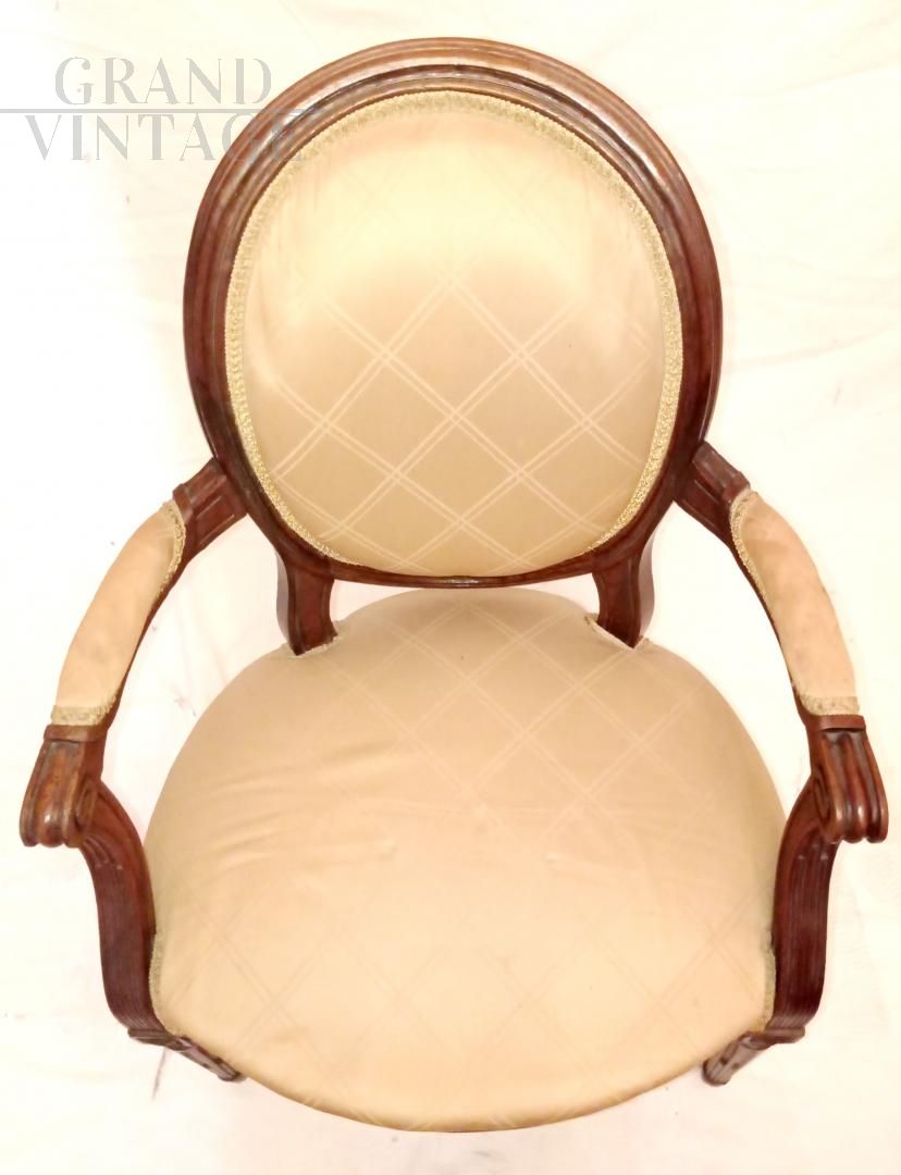 Poltroncina antica in noce ben imbottita e rivestita con elegante tessuto di seta beige, seduta comoda ideale da relax o conversazione. Il prezzo si riferisce alla singola poltroncina, disponibile la coppia.