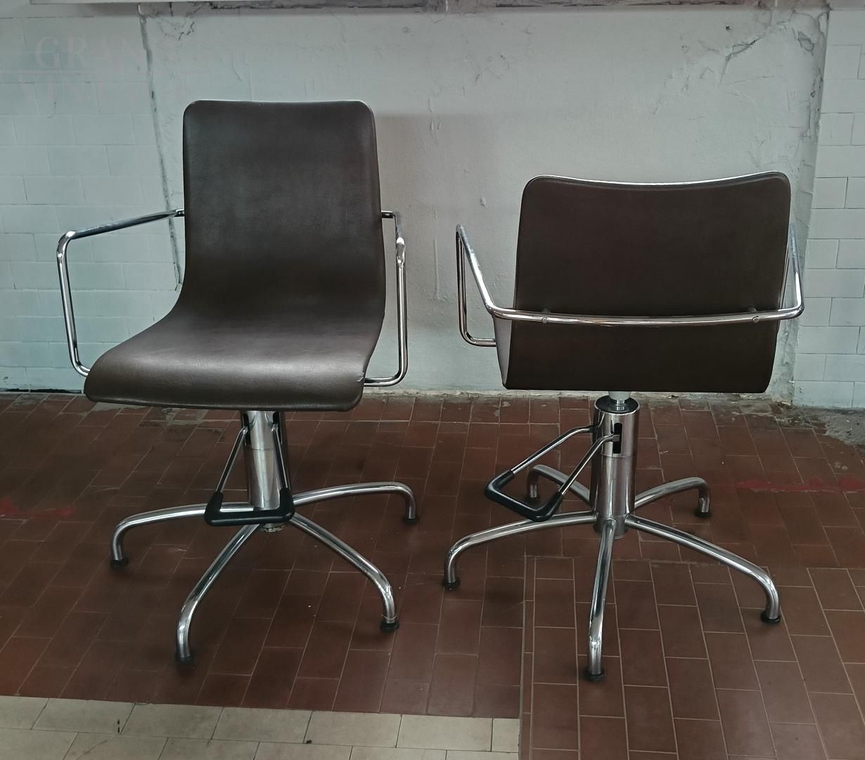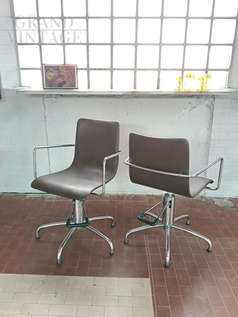 Poltrona da parrucchiere vintage anni '80 con struttura in acciaio e seduta in resina morbida di qualità. Le poltrone sono in buone condizioni, le pompe per la regolazione dell'altezza andrebbero revisionate. Utilizzabili anche come sedute polifunzionali. Disponibili 4 pezzi, il prezzo si rifrisce al singolo pezzo.