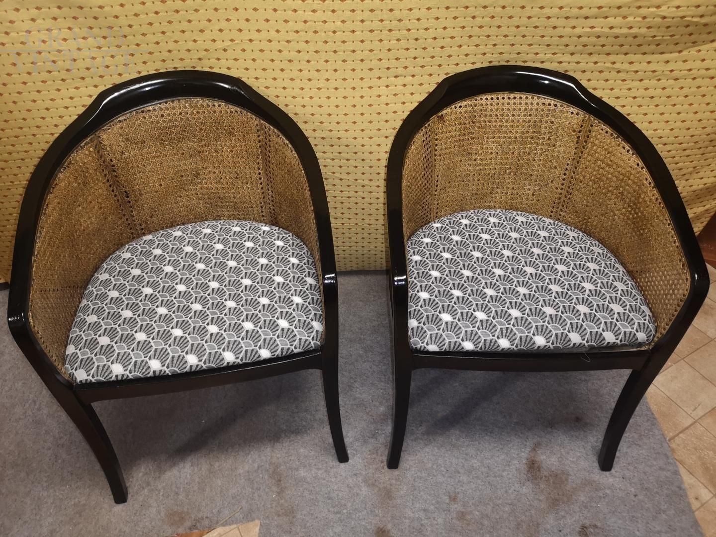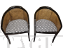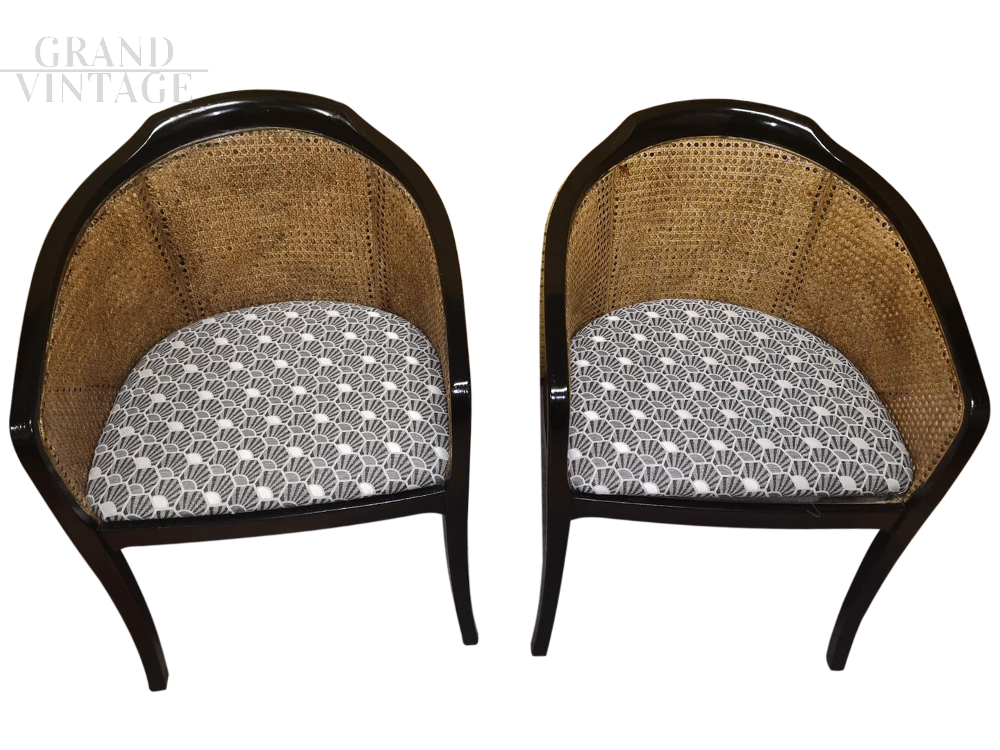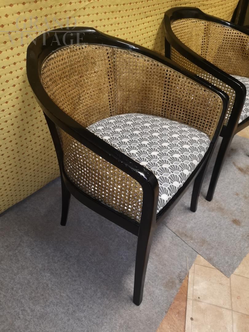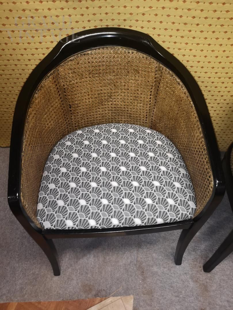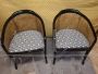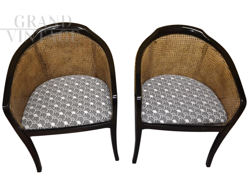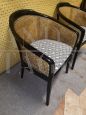 Poltrone americane aviator realizzate in faggio curvato a vapore ebanizzato, schienale in paglia di Vienna, seduta foderata in tessuto. Tipica forma curva a pozzetto.