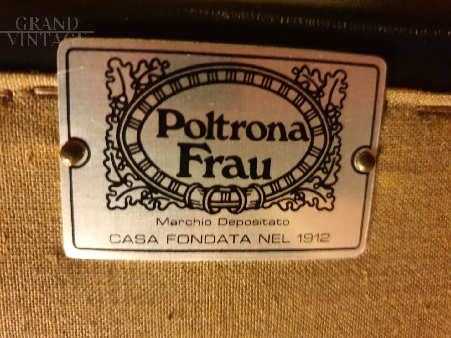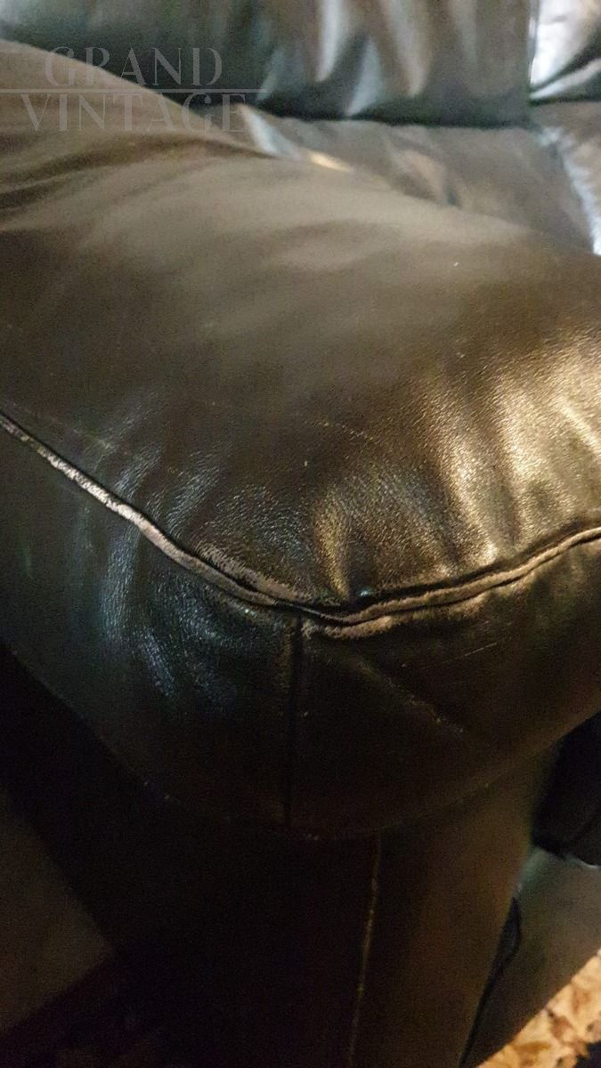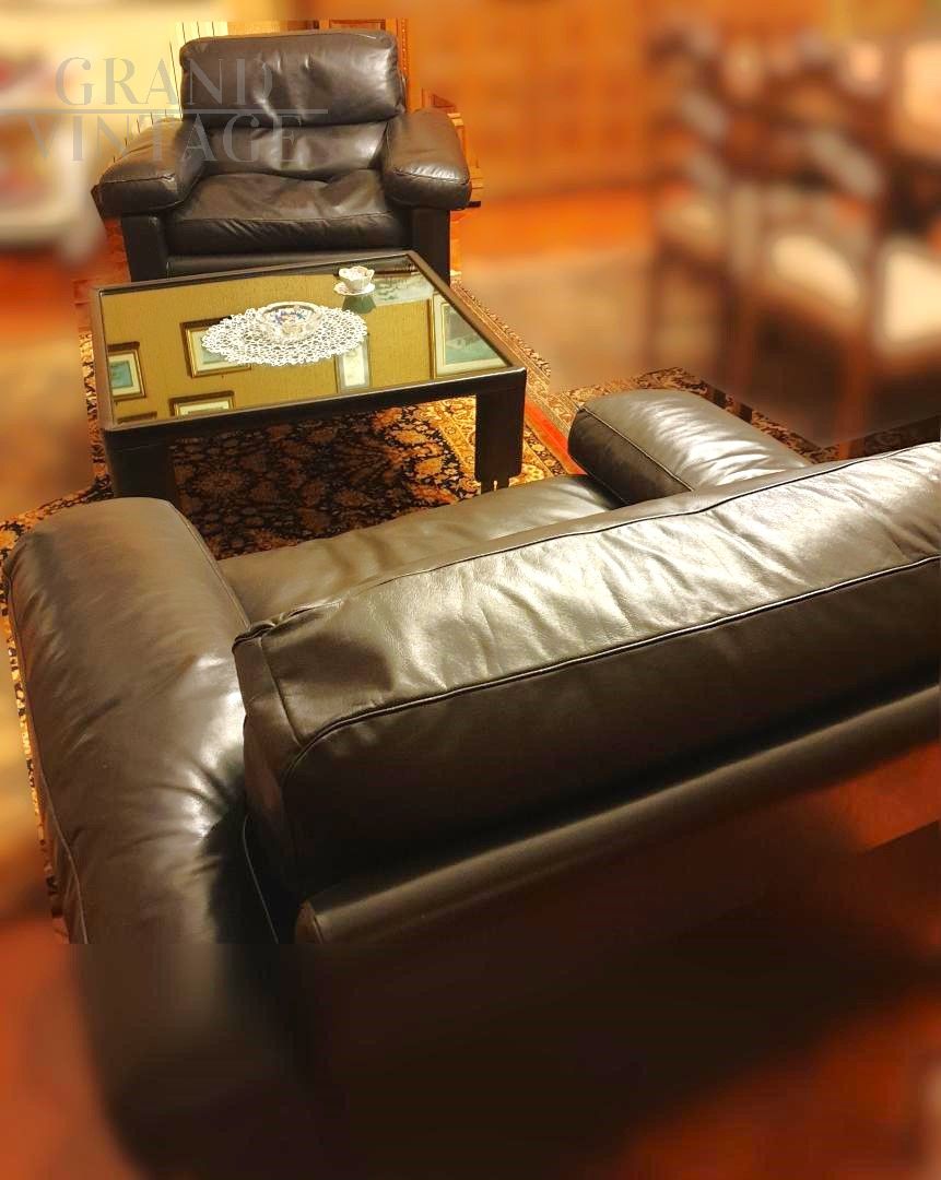 Salotto completo di Tito Agnoli per Poltrona Frau in pelle nera, originale anni '70 - '80, comprensivo di 2 poltrone, 1 divano a due posti e 1 tavolino in legno scuro con piano in cristallo. In buone condizioni, le sedute presentano i naturali segni del tempo e dell'utilizzo. Il set è marchiato Frau.