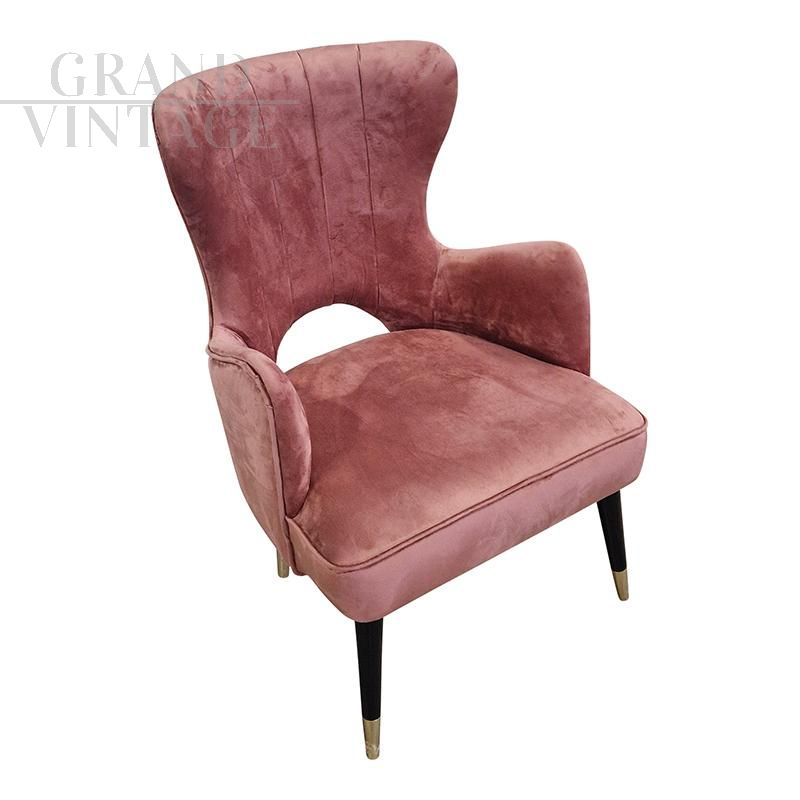 Poltrona design in stile mid-century modernariato italiano in velluto rosa con piedi in legno laccato nero e finale in ottone, di recente produzione, disponibili più pezzi.