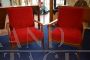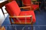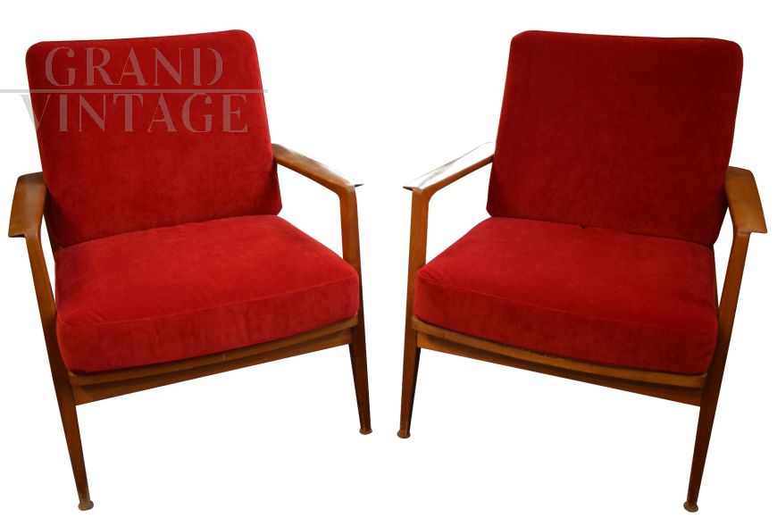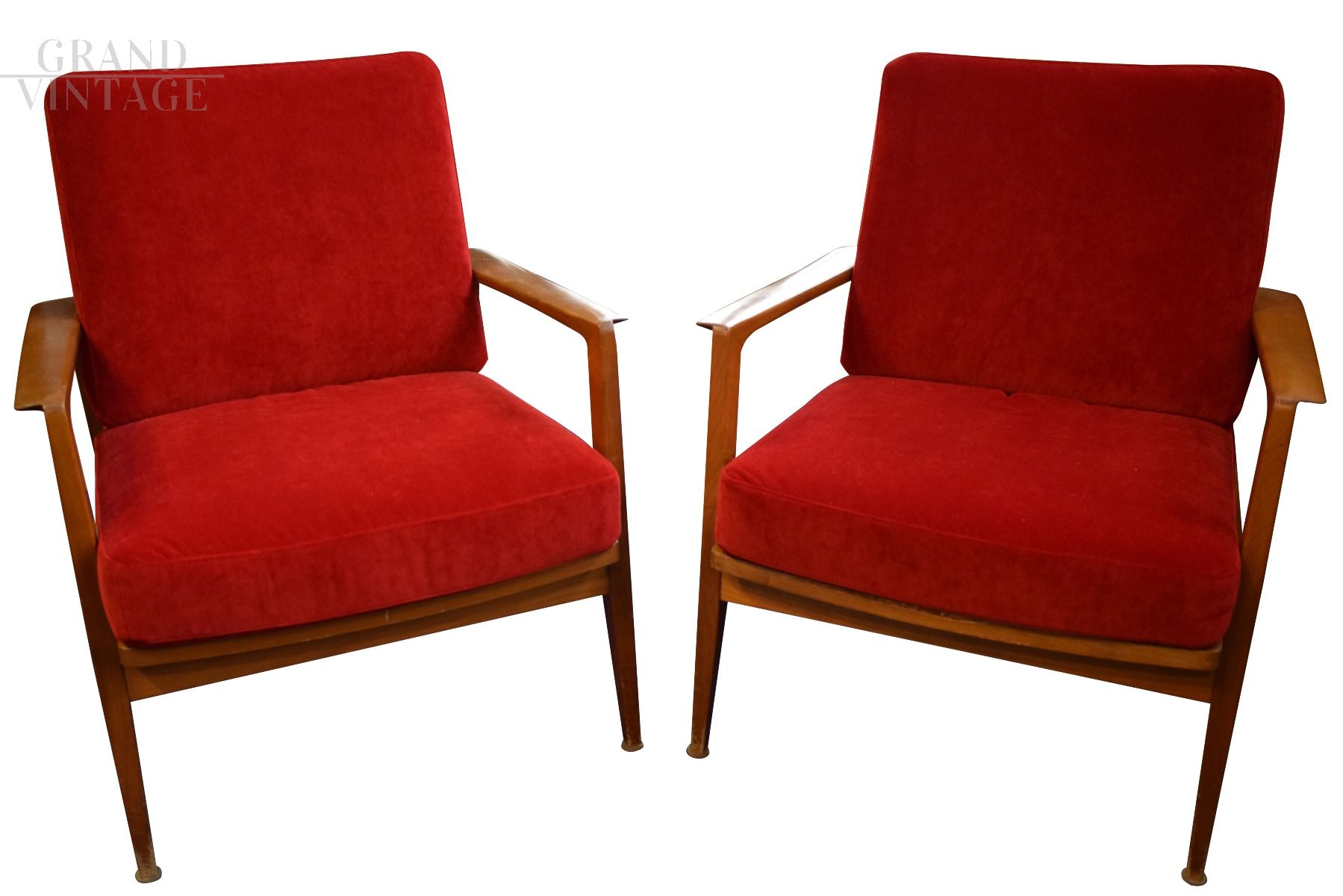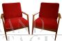 Coppia poltrone firmate KNOLL ANTIMOTT degli anni '50 prodotte in legno di ciliegio. Velluto rosso ed imbottitura nuovi.