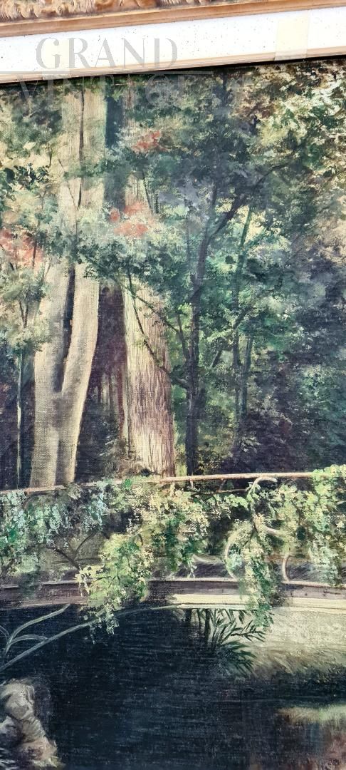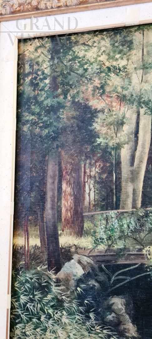 Dipinto con paesaggio francese periodo Novecento con cornice coeva, raffigurante un ponte sul fiume, di ottima qualità pittorica.