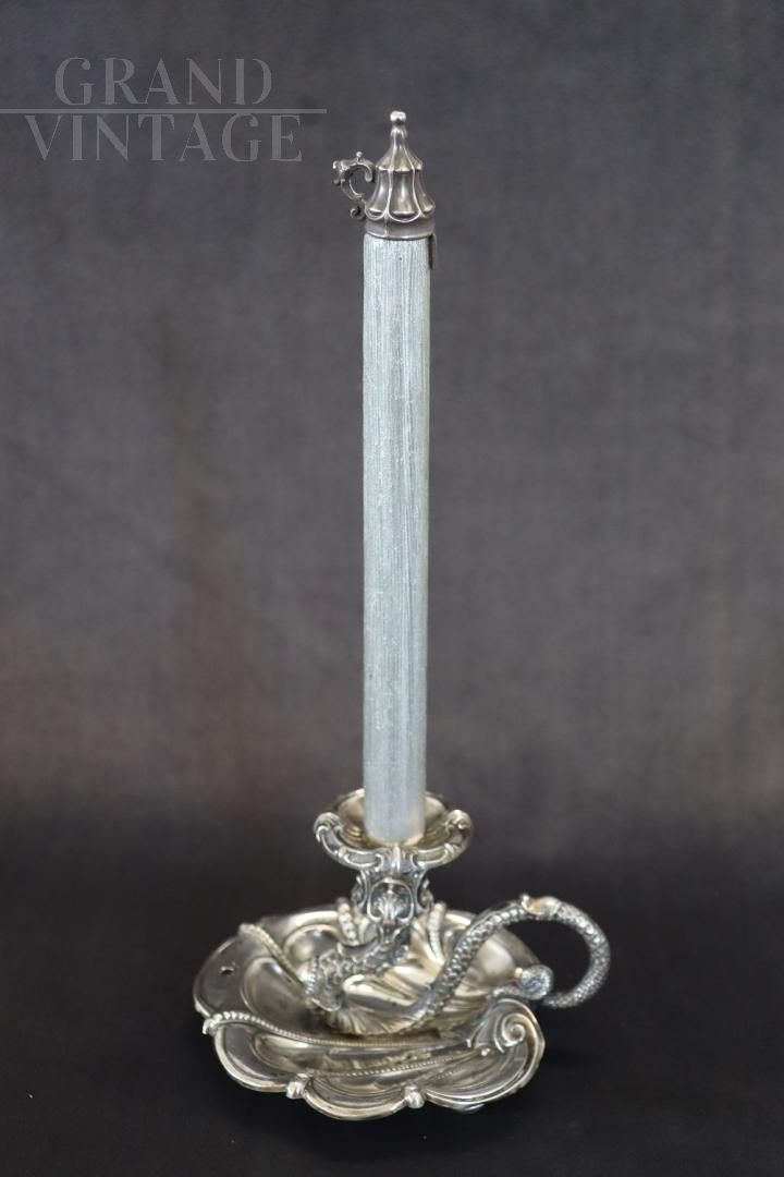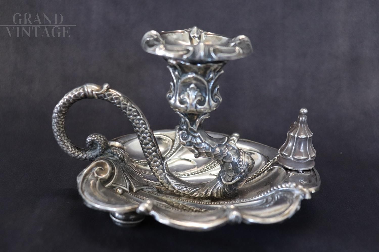 Bellissimo portacandele in argento 800 del periodo Art Nouveau - fine '800 con raffinate decorazioni fantasy finemente cesellate, realizzato dal famoso argentiere tedesco Wilhelm Binder con marchio inciso 800 WTB con corona e mezza luna. Perfette condizioni, ottimo prezzo trattabile.