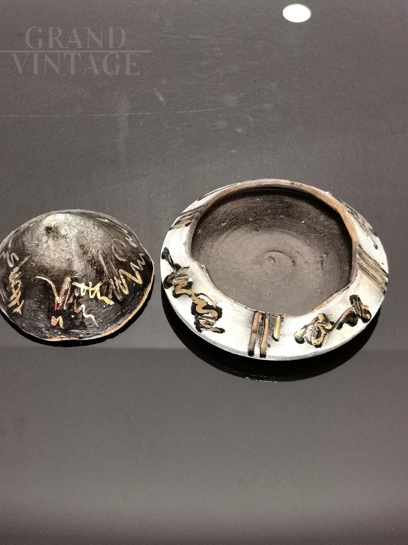 Raro cofanetto portagioie firmato Romulus Renzo Verzolini, realizzato a mano in maiolica nei colori nero, oro e platino; si tratta di un pezzo unico, un vero oggetto d'arte made in Italy.