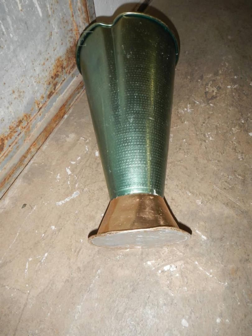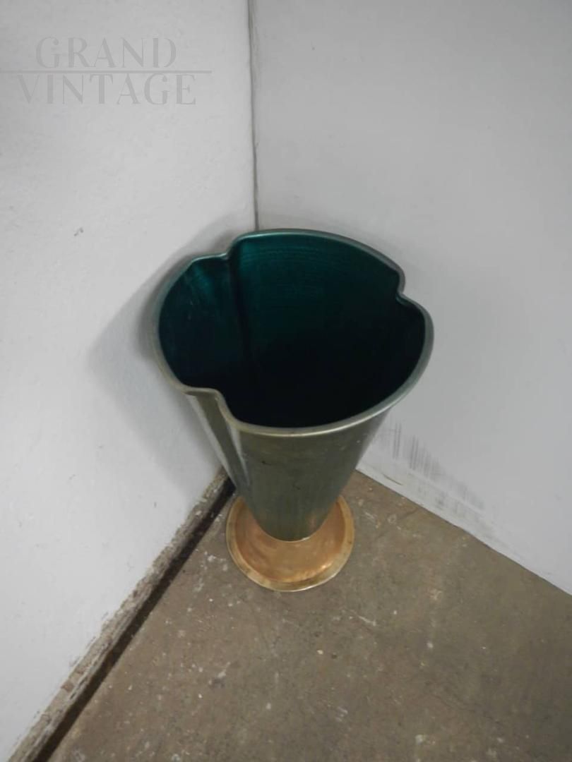 Portaombrelli vintage in alluminio laccato verde con base dorata. La base è in metallo pieno, per garantire stabilità al portaombrelli ed evitare che si ribalti.