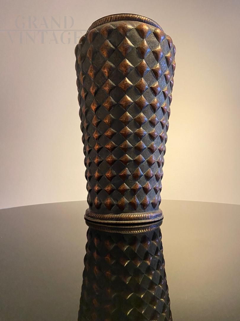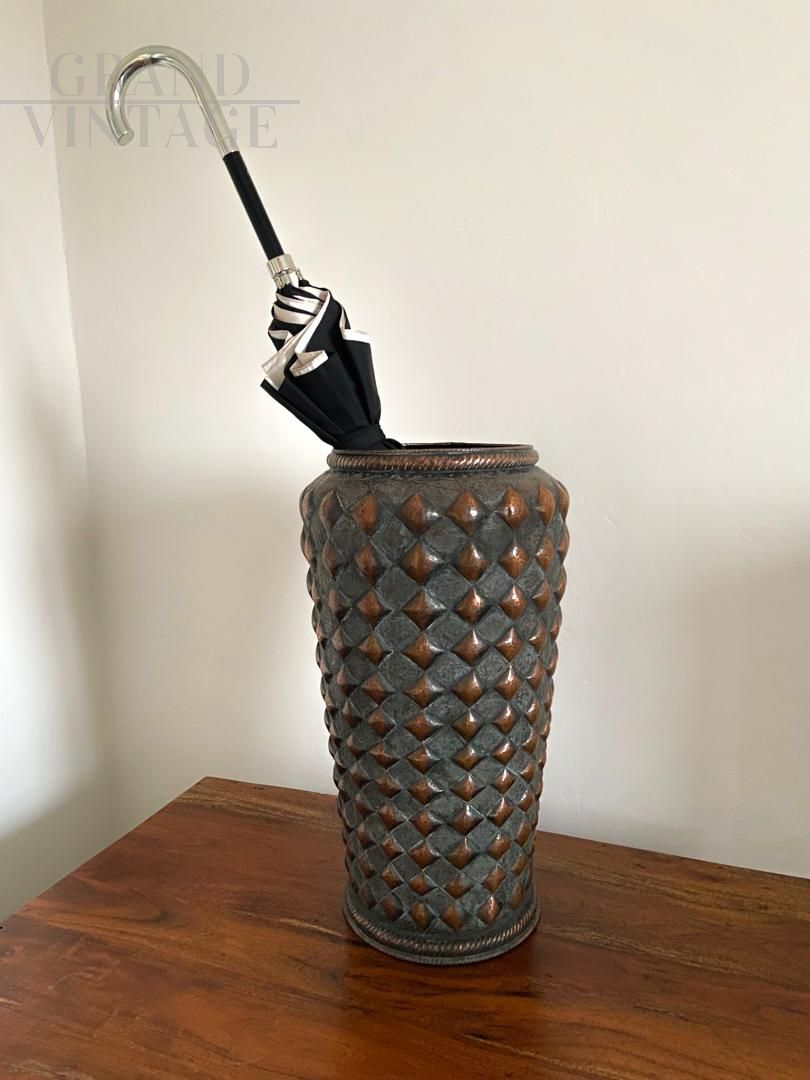 Portaombrelli vintage in rame decorato con figure romboidali in rilievo, Italia anni '50, in buone condizioni di conservazione.