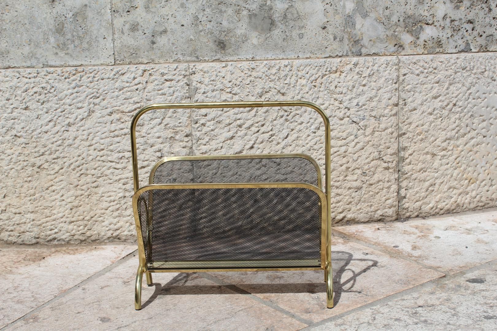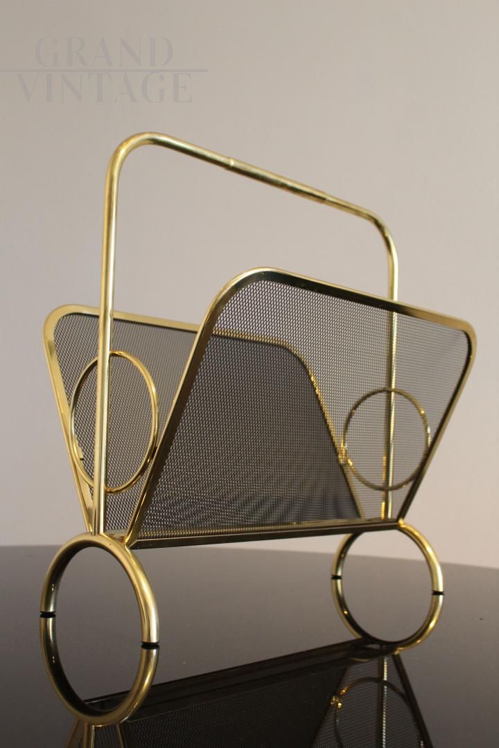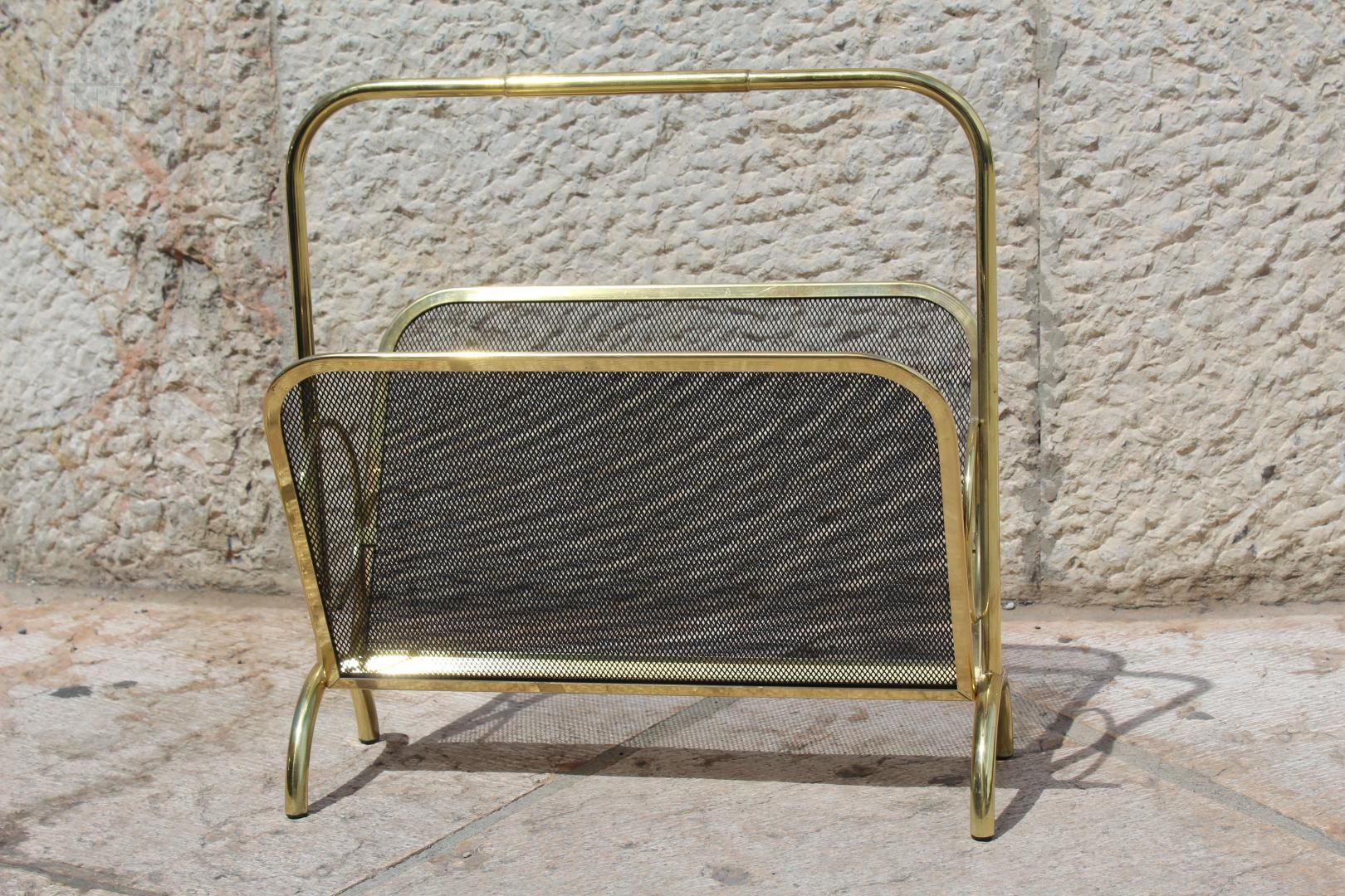 Portariviste vintage in ottone e metallo laccato nero, Italia anni '70. La struttura è in ottone, mentre invece i lati sono in rete metalica laccata in nero, richiamando così lo stile Hollywood Regency.