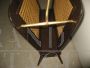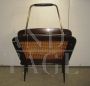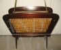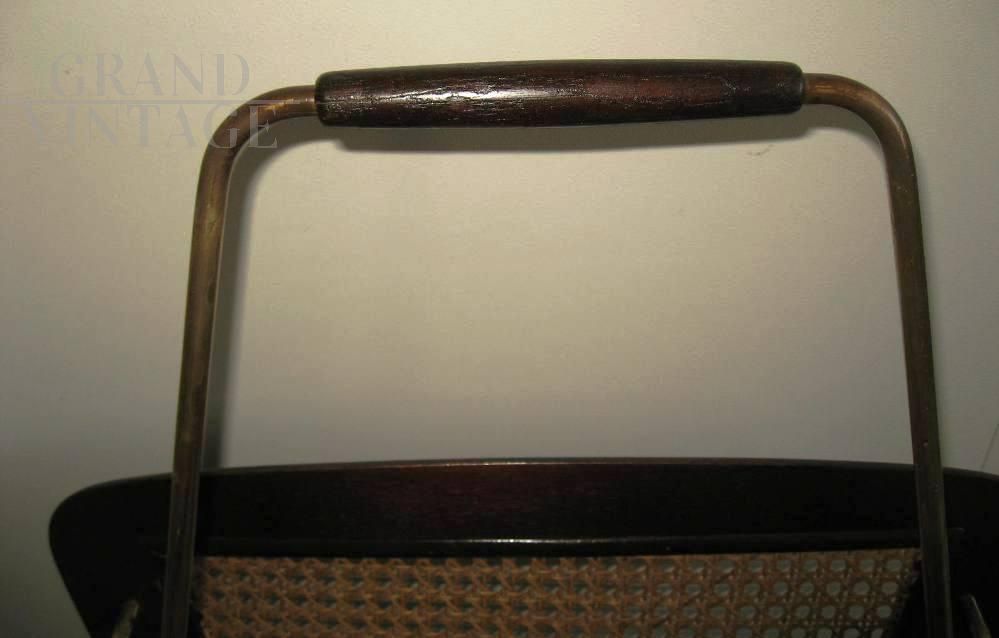 Portariviste vintage anni '50-'60 modernariato italiano in legno tinto mogano scuro, con base rettangolare sorretta da quattro piedini, due alette con paglia di Vienna centrale, completo di manico in ottone con impugnatura in legno. Ottime condizioni generali.