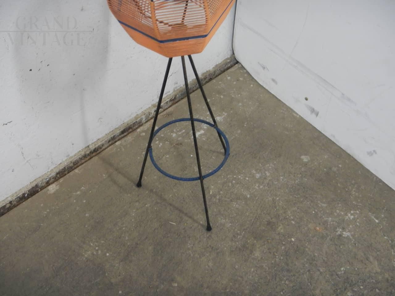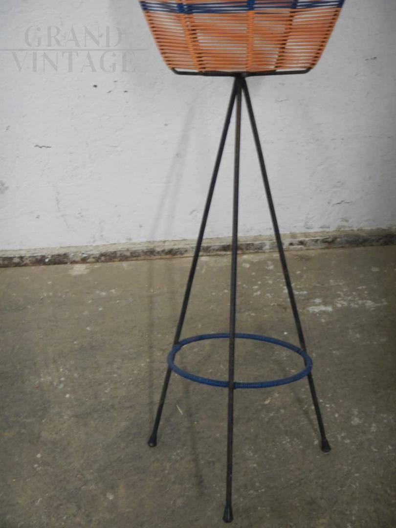 Portavasi vintage in ferro e plastica a fili colorata nei toni dell'arancione e del blu. In buone condizioni, con i naturali segni del tempo, i piedini sono originali. Lo spazio utile per il vaso è di cm 21x21, altezza cm 15.