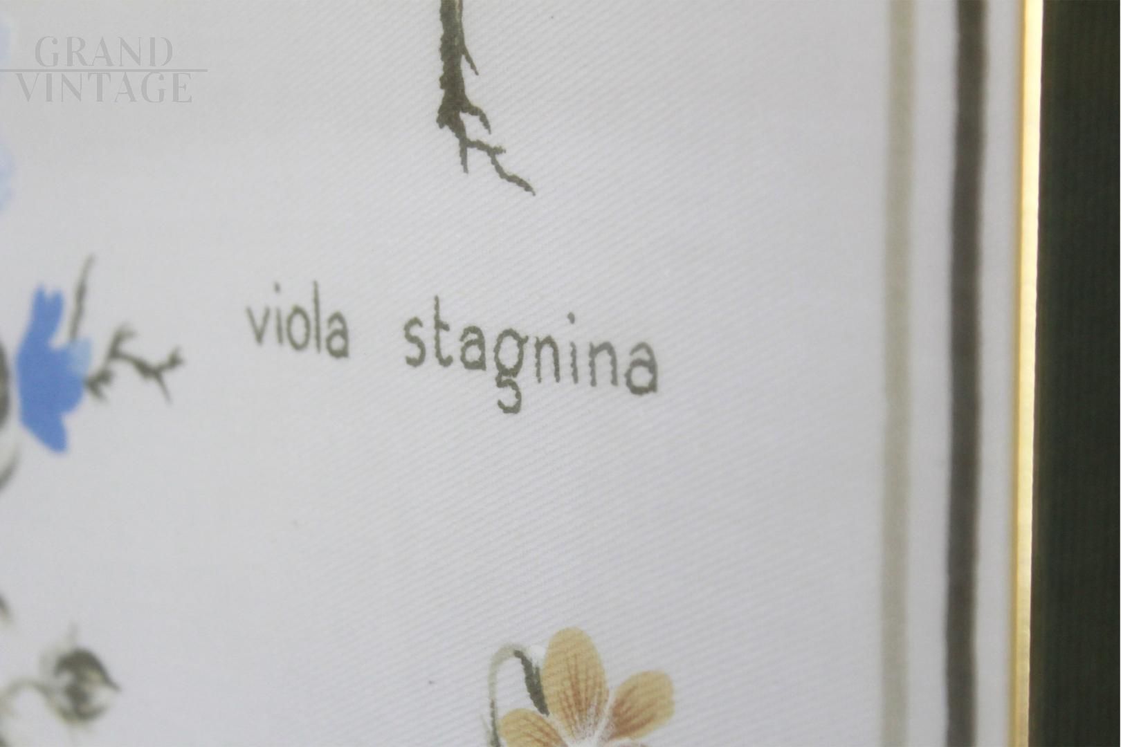 Poster vintage degli anni '60 a tema floreale con protagonista le violette di campo. Cornice in legno bianco e vetro protettivo. Prodotto da M.T.C. - Milano.