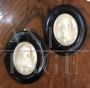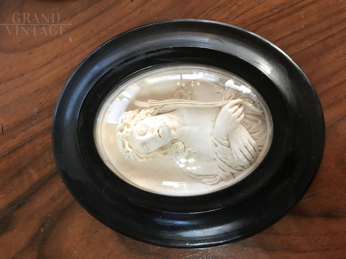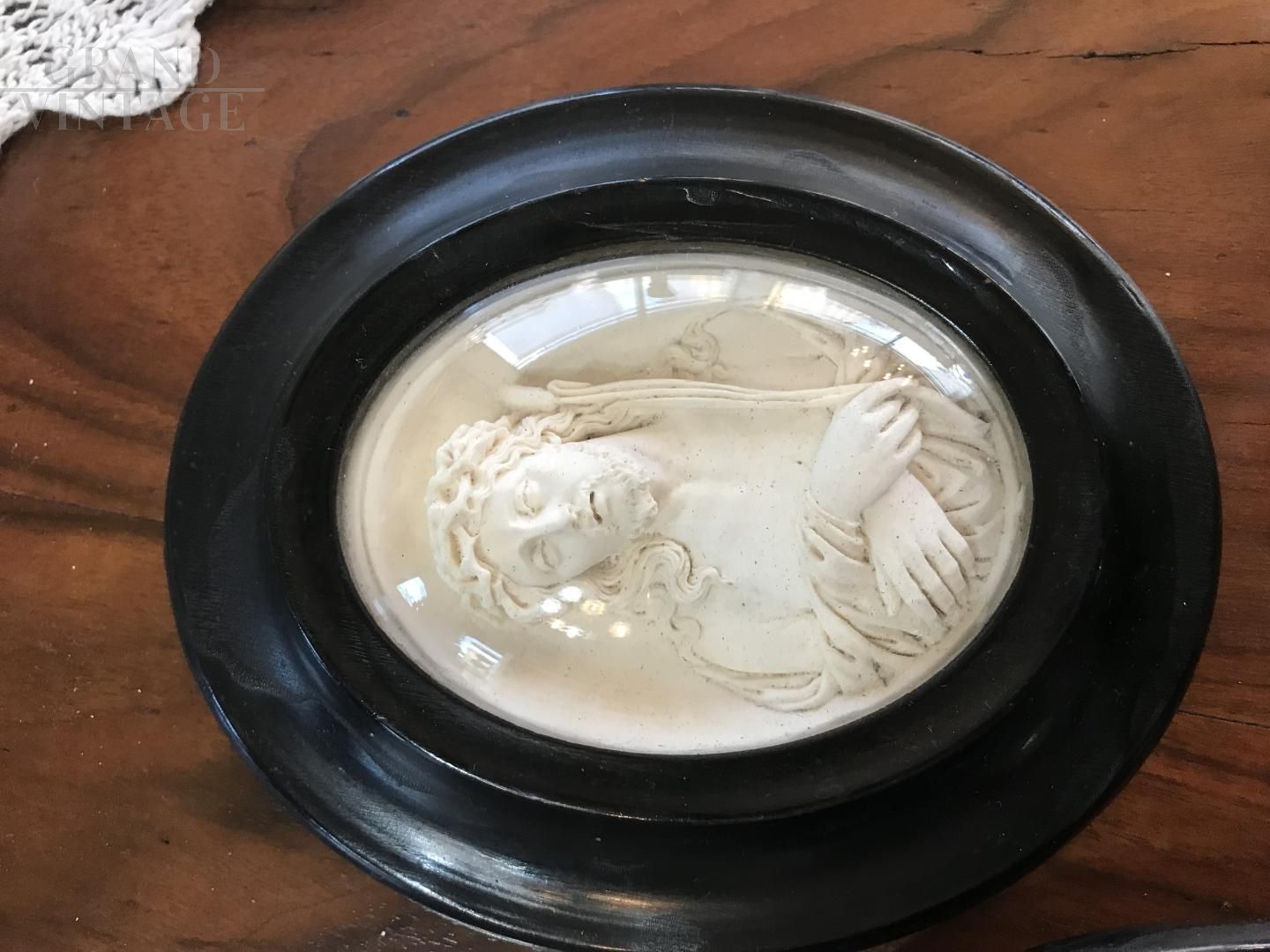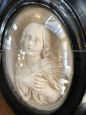 Coppia di quadri antichi Vittoriani in schiuma di mare o sepiolite scolpita a bassorilievo raffiguranti immagini sacre, con Gesù e Maria addolorati. Cornice originale in legno con vetro bombato protettivo.