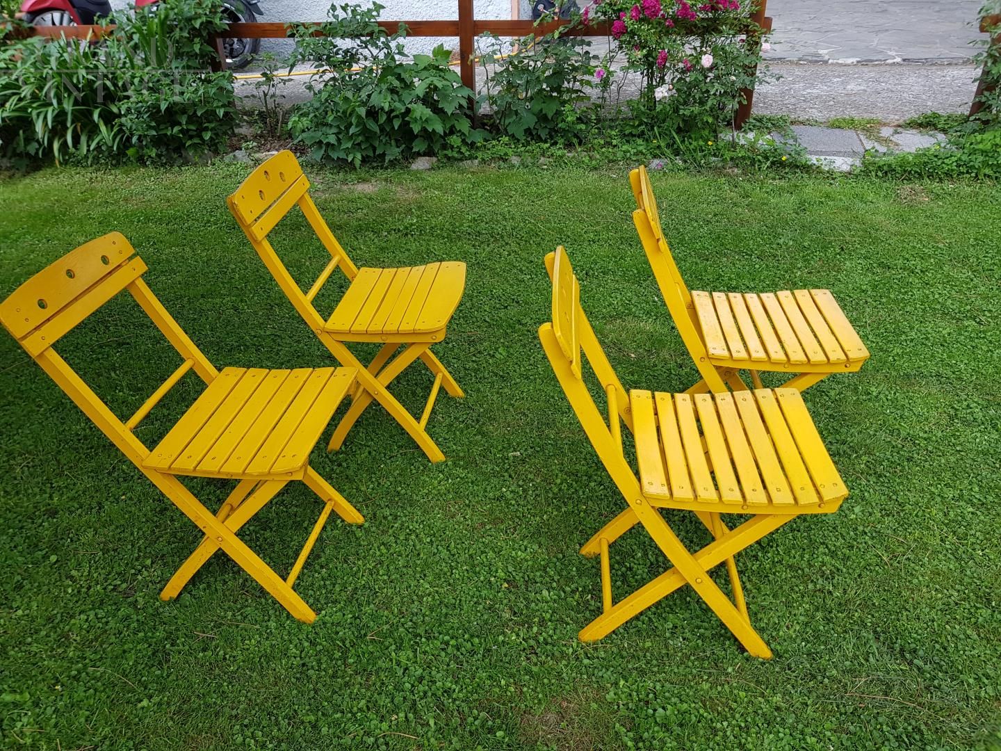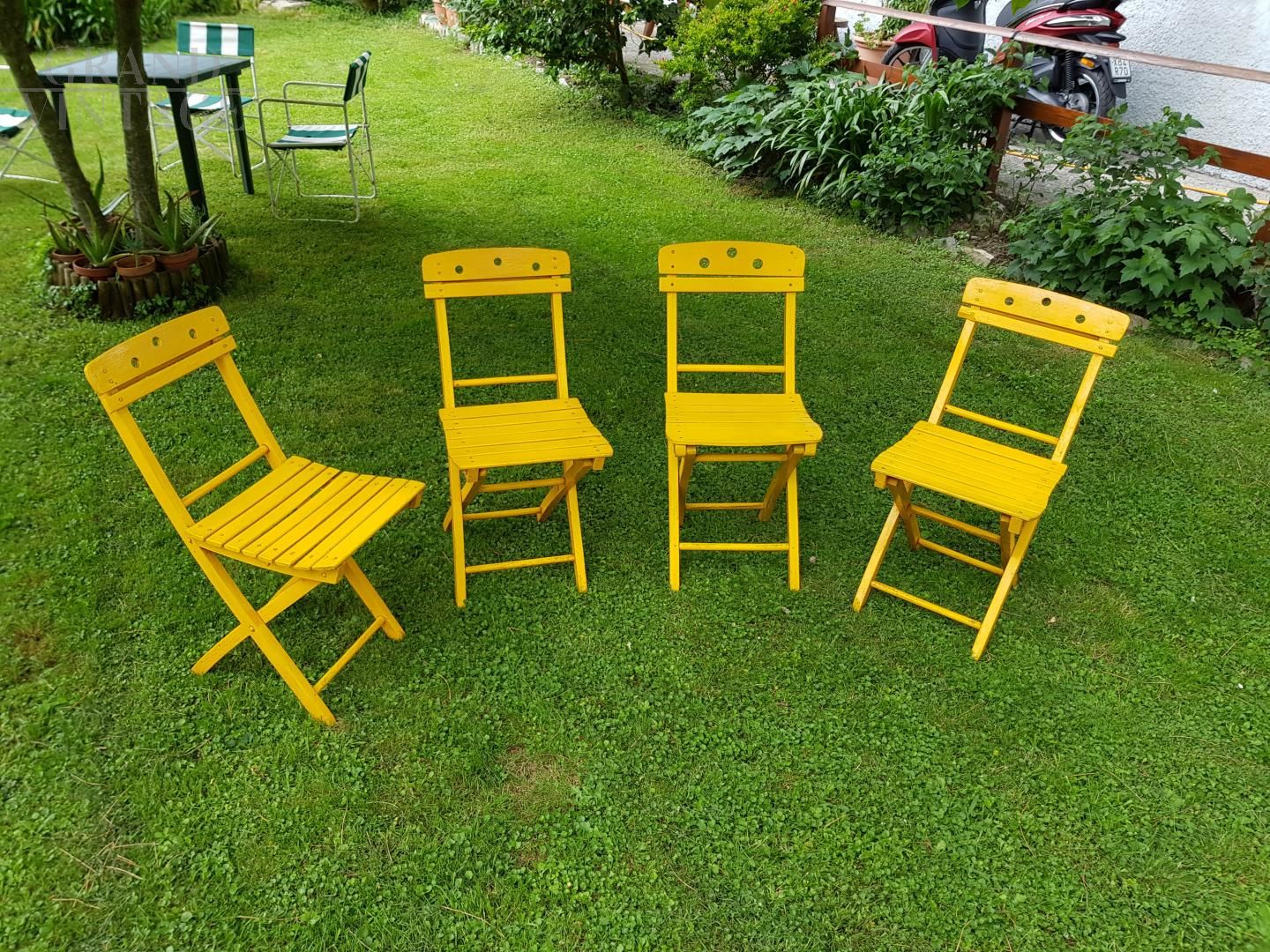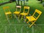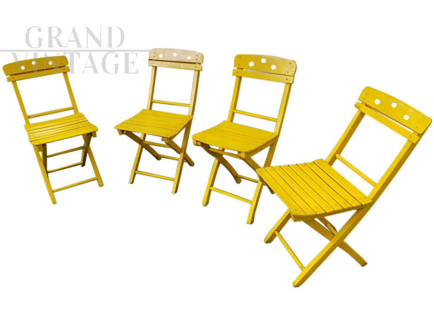 Quattro sedie pieghevoli gialle in legno anni '50 provenienti da stabilimento balneare in Riviera. Manifattura italiana.