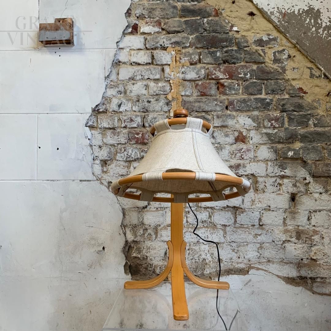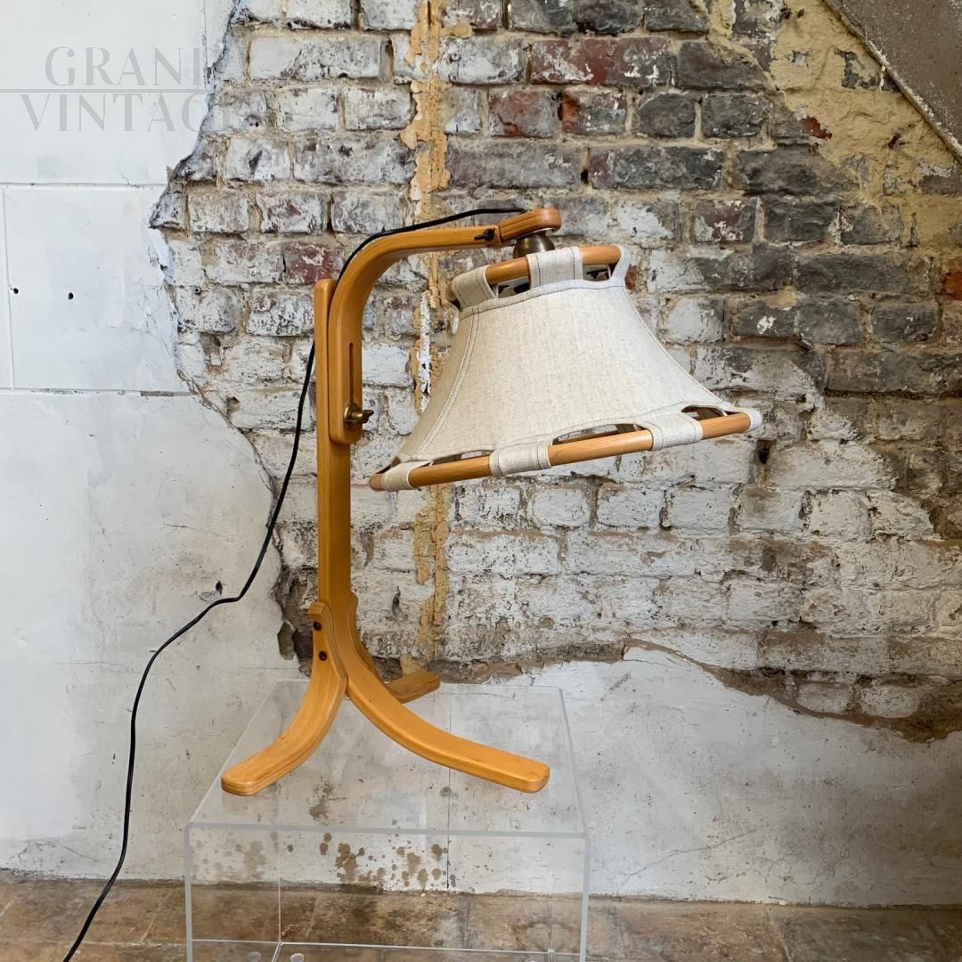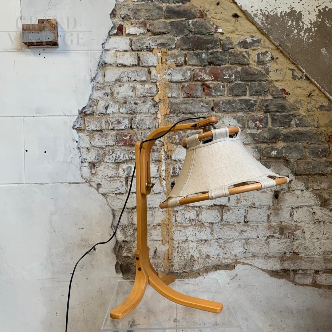 Rara lampada da tavolo Anna di Anna Ehrner per Ateljé Lyktan, Svezia anni '70, con struttura in faggio e paralume in bamboo e tela. La lampada è regolabile in altezza e con paralume girevole, e funziona con spina europea e lampadina di tipo E27, non inclusa. In condizioni molto buone, conserva qualche naturale traccia del tempo, come da foto.
