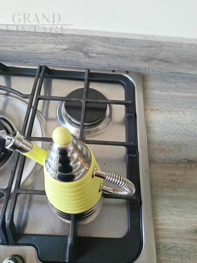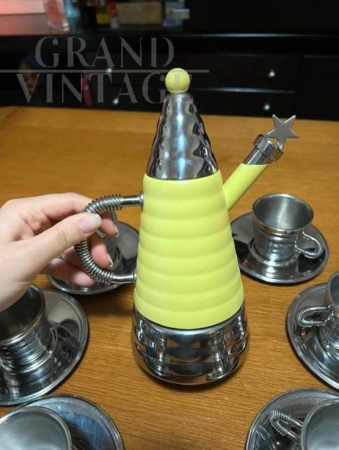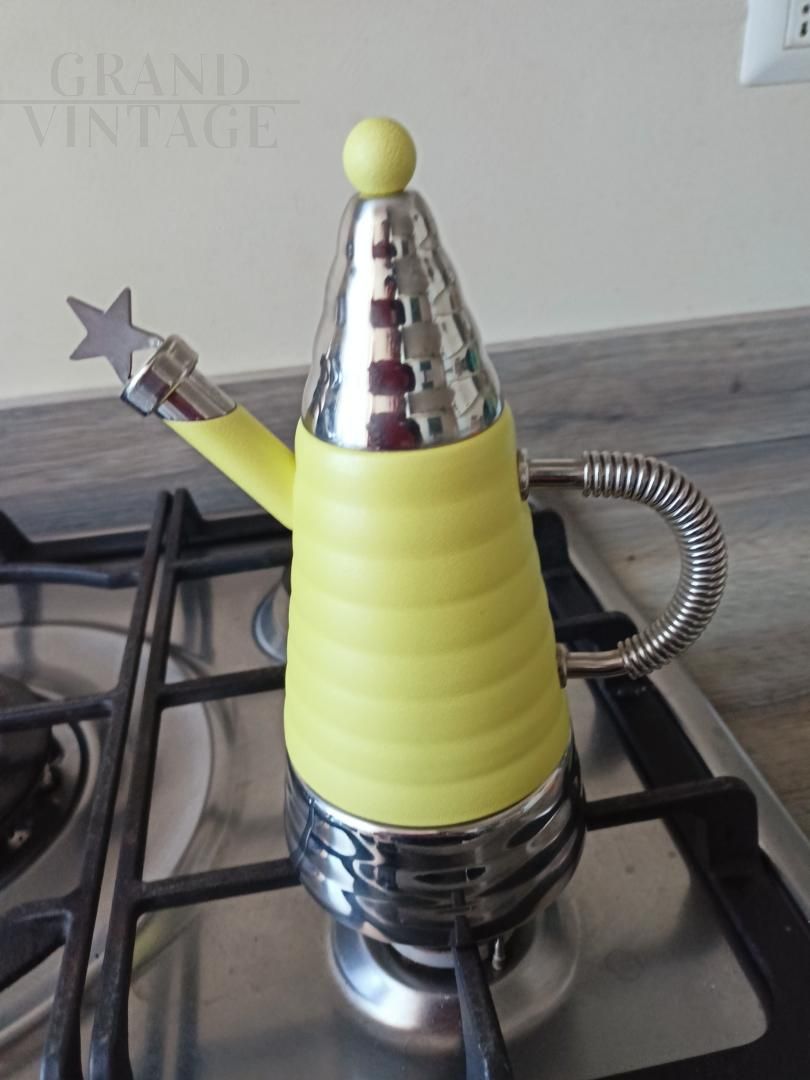 Bellissima caffettiera vintage Archimede di Stella Collection di eccellente manifattura italiana, in acciaio inox con un raro colore giallo e un fischietto avvitatore che segnala l'avvenuta preparazione del caffè. In ottime condizioni poiché mai usata, introvabile in questa versione. Un elegantissimo modo per servire il caffè . È una moka da 4 tazze ma ha un riduttore nell'imbutino che la rende da 2 tazze. Ha un design ancora attualissimo.