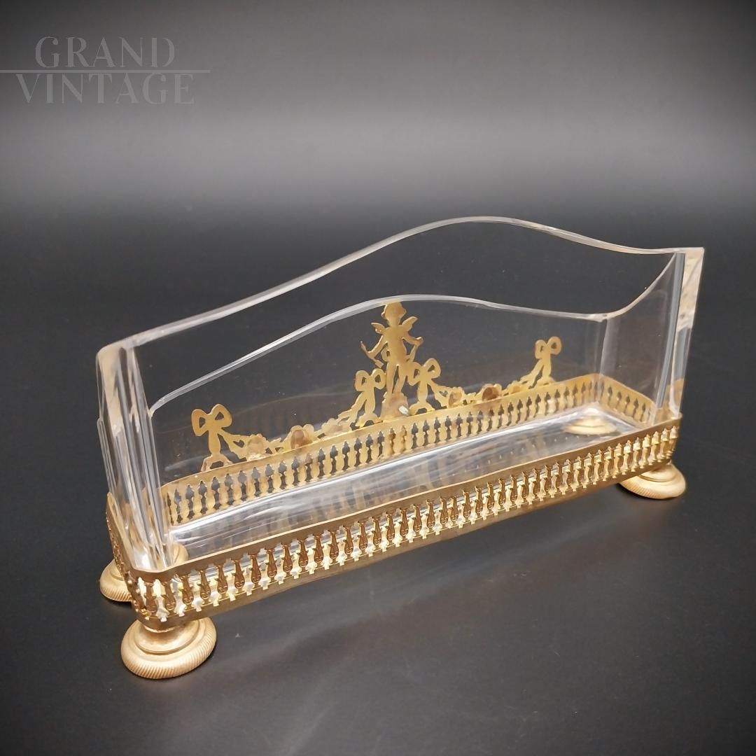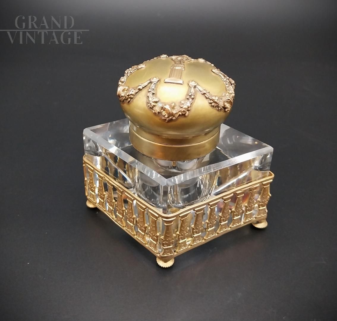 Raro set da scrittura antico Napoleone III in bronzo dorato e cristallo