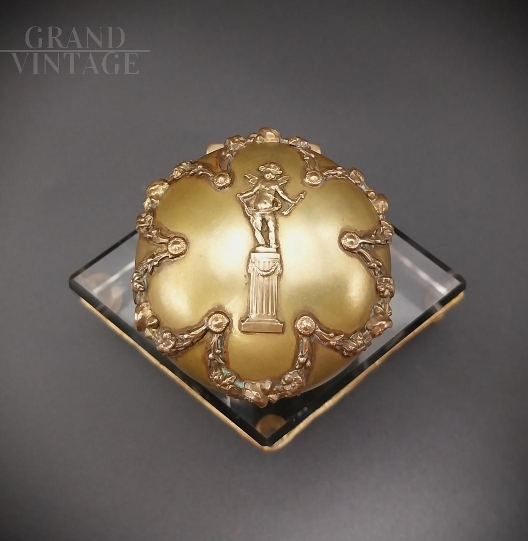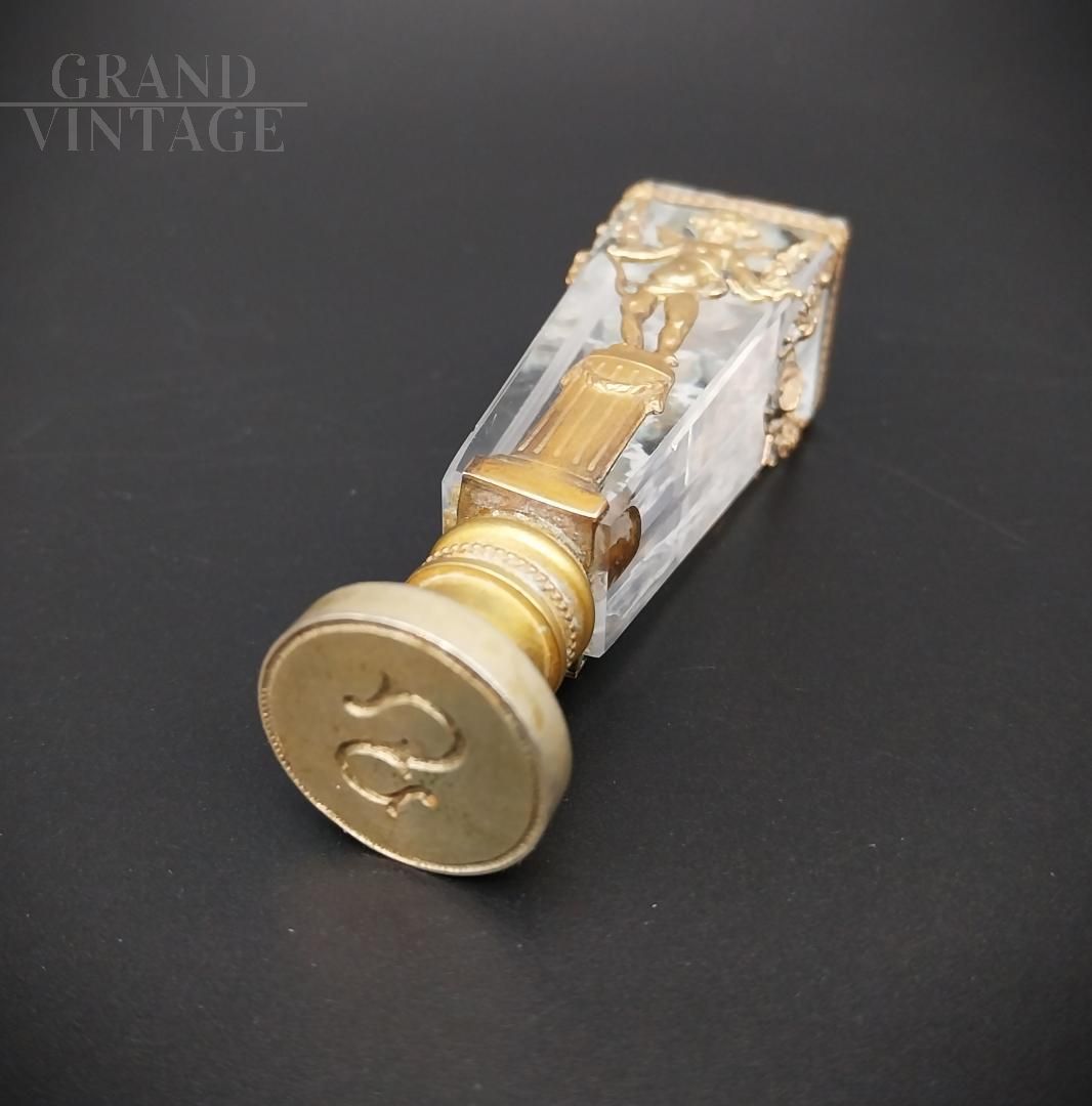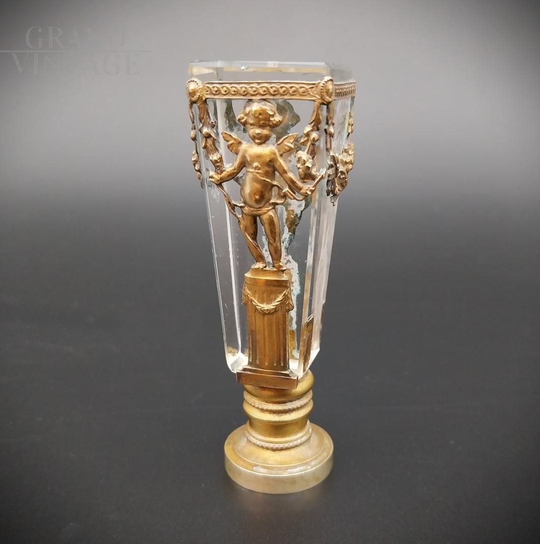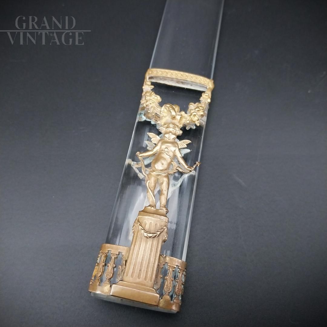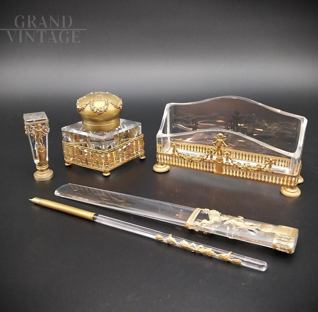 Favoloso e raro set da scrittura epoca Napoleone III in bronzo dorato e cristallo. Perfetto stato, cristallo senza scheggiature. Il set è composto da un calamaio di cristallo con coperchio in bronzo dorato raffigurante un putto, con un piccolo bicchiere porta inchiostro. Portalettere sempre in cristallo e bronzo dorato. Un pennino, un tagliacarte e un sigillo con la lettera S sempre in cristallo e bronzo dorato. Ogni pezzo ha la stessa lavorazione con l'immagine del putto ad eccezione del pennino ma è anch'esso parte dello stesso insieme. Magnifico set completo della fine del XIX secolo. Misura: calamaio: 9x7 cm altezza 9cm portalettere: 14.5x4 H. 8cm pennino: 22 cm Tagliacarte: 22.5cm sigillo: H. 7cm