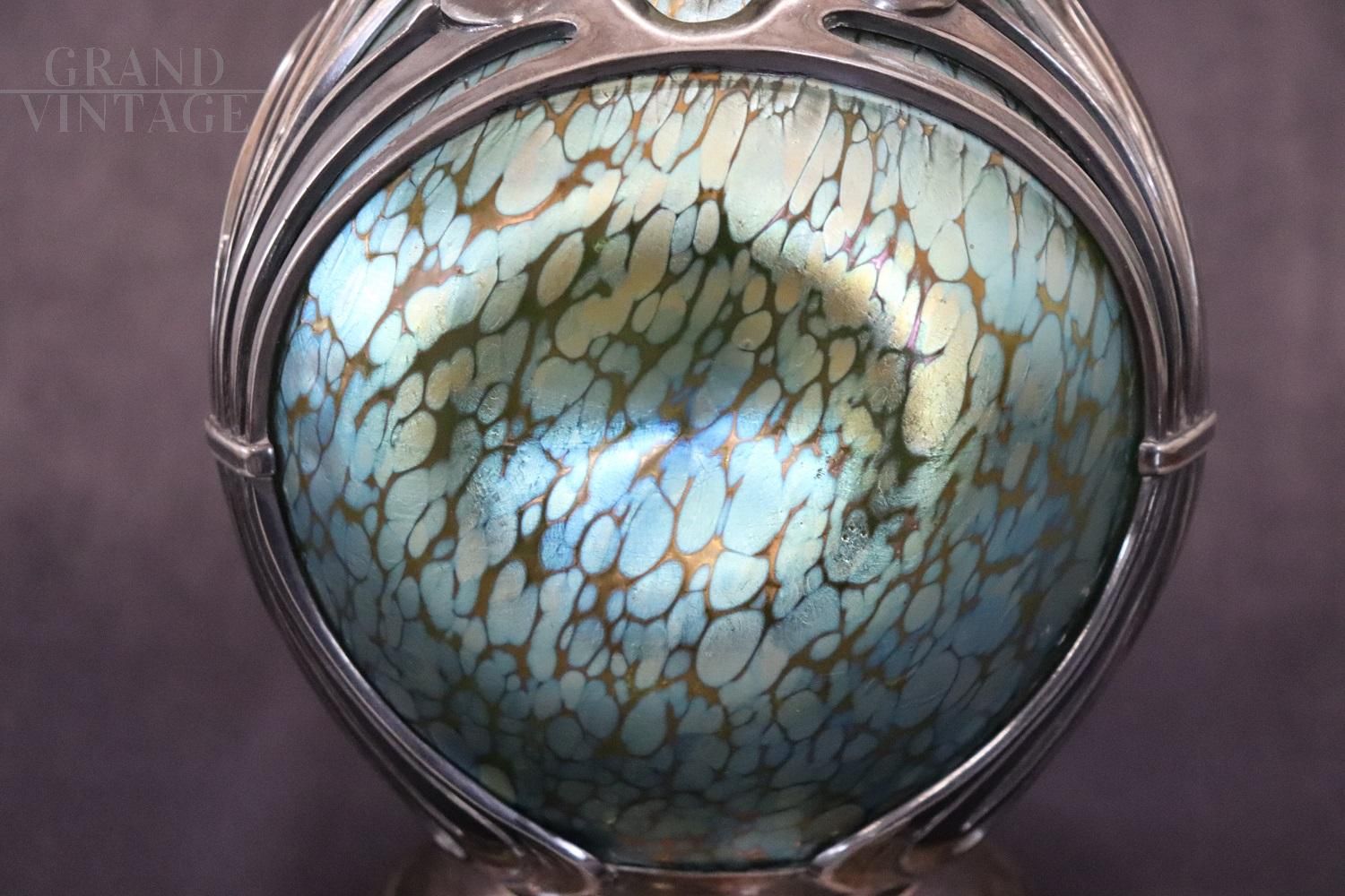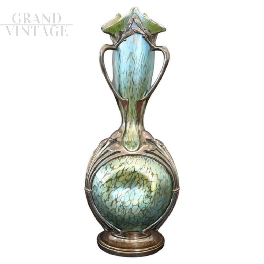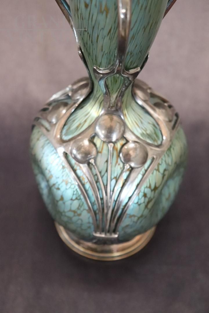Importante vaso da esposizione museale del pieno periodo Art Nouveau. Grande vaso a manico in vetro di Boemia con decorazione metallo argentato in rilievo e cesellata in stile Art Nouveau. Il vetro presenta un decoro “Papillon” molto particolare: un vetro trasparente verde con inclusioni e iridescenze giallo-argento. Questo importante vaso è il risultato della collaborazione tra Moritz Hacker (Budapest 1849-1932), gioielliere di corte, e Johann Loetz Witwe, importante produttore di vetro artistico di Klostermühle, in Boemia, Austria-Ungheria. Le opere di Johann Loetz sono tra i più importanti esempi di Art Nouveau. Il vaso presenta il marchio di Moritz Hacker sotto la base. Il vaso da noi proposto è di una raffinatezza unica nell’esecuzione artistica e in perfette condizioni.