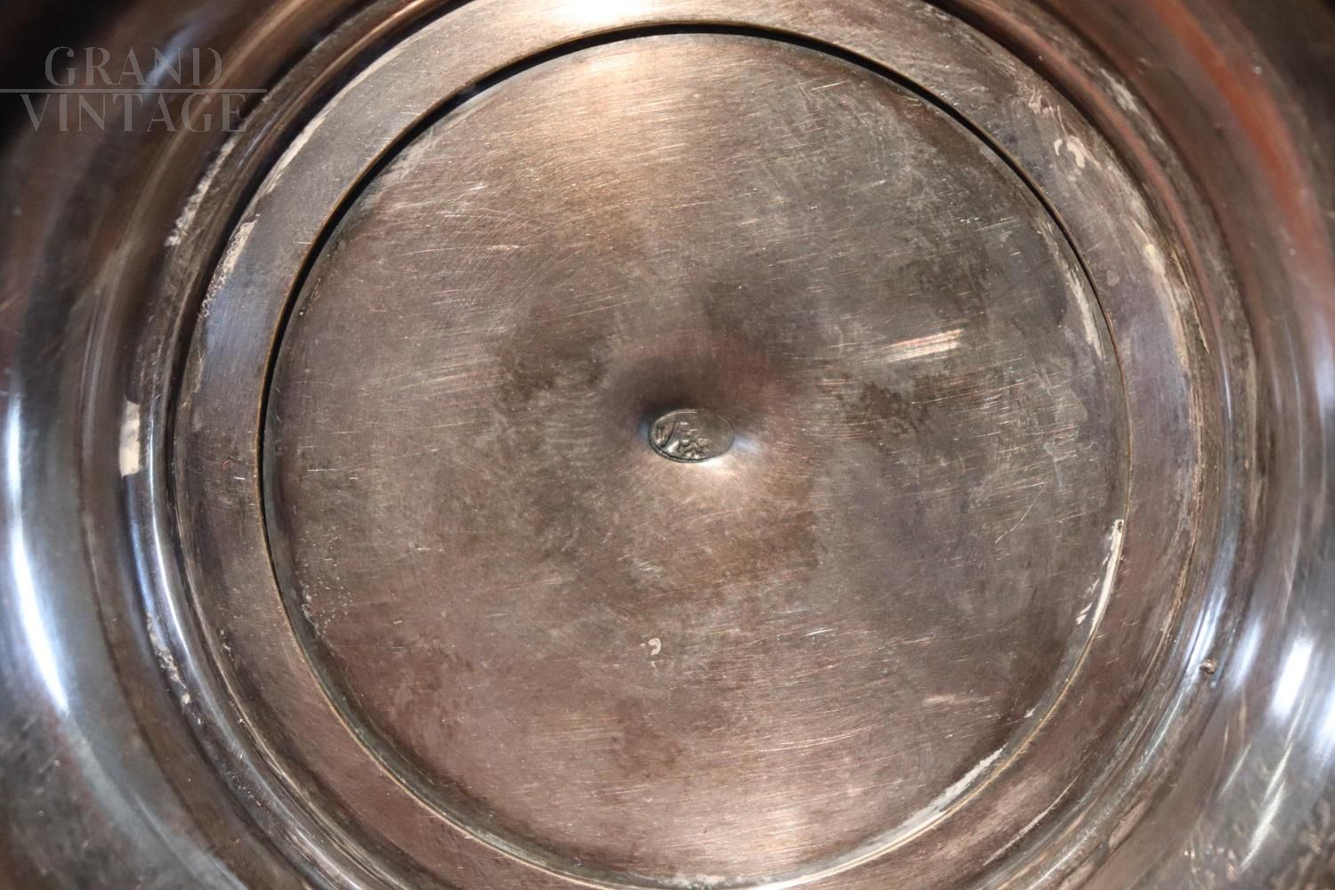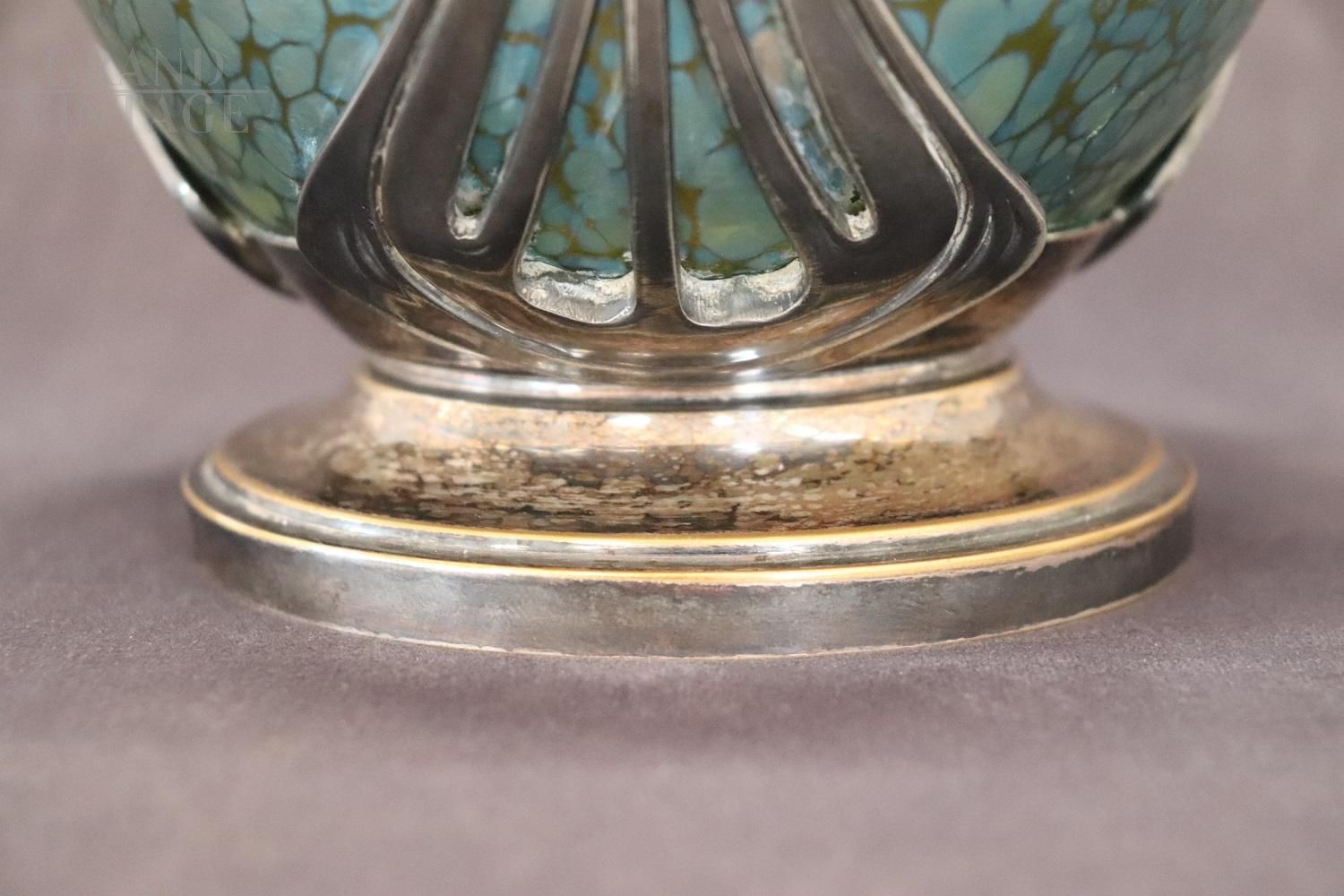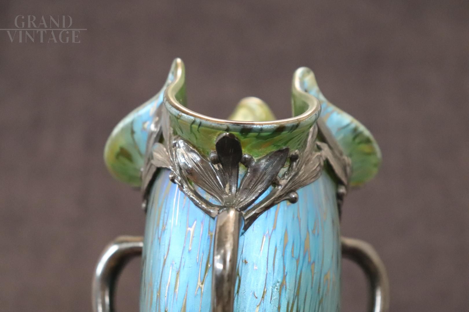 Importante vaso da esposizione museale del pieno periodo Art Nouveau. Grande vaso a manico in vetro di Boemia con decorazione metallo argentato in rilievo e cesellata in stile Art Nouveau. Il vetro presenta un decoro “Papillon” molto particolare: un vetro trasparente verde con inclusioni e iridescenze giallo-argento. Questo importante vaso è il risultato della collaborazione tra Moritz Hacker (Budapest 1849-1932), gioielliere di corte, e Johann Loetz Witwe, importante produttore di vetro artistico di Klostermühle, in Boemia, Austria-Ungheria. Le opere di Johann Loetz sono tra i più importanti esempi di Art Nouveau. Il vaso presenta il marchio di Moritz Hacker sotto la base. Il vaso da noi proposto è di una raffinatezza unica nell’esecuzione artistica e in perfette condizioni.