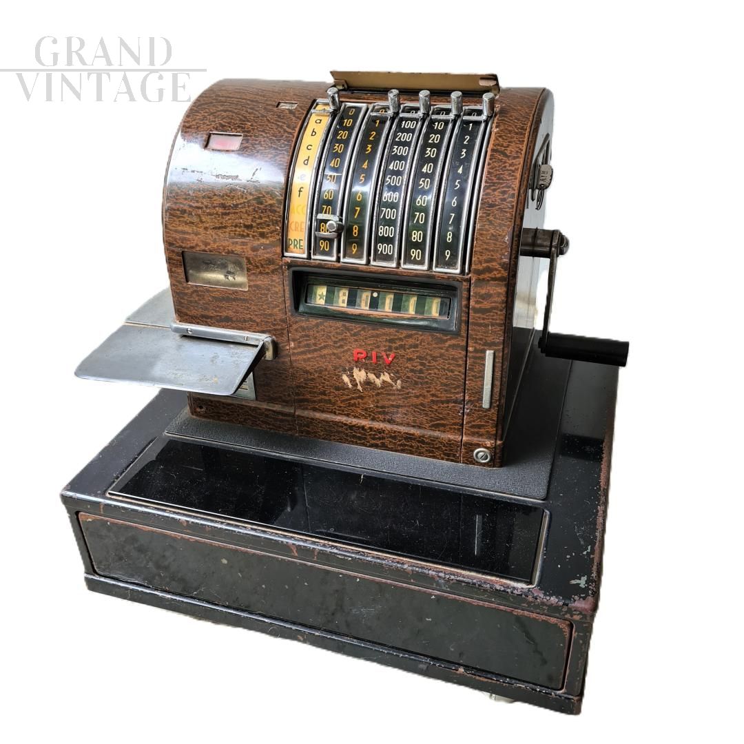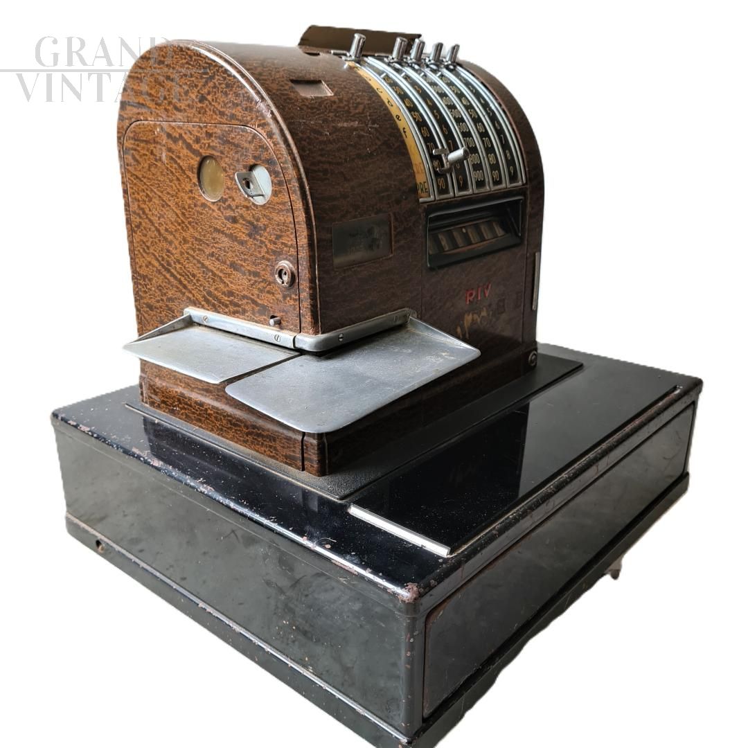 Registratore di cassa meccanico prodotto dalla RIV (Rivoluzione Industriale di Villar Perosa) di Torino negli anni '30-'40. Modello 8506 5001/00 esposto al Museo Nazionale della Scienza e della Tecnologia Leonardo da Vinci di Milano. Corpo in metallo verniciato effetto legno (finitura wood-grain); basamento in legno verniciato nero con piano in vetro temperato. Meccanismo meccanico a 5 colonne di selezione. Display con doppio visualizzatore (operatore e cliente). Cassetto con apertura automatica con suono di campanello. Sportello superiore per controllo totale di cassa. Manovella laterale in ebanite nera. Cassetto porta-monete in legno con scomparti. Originale, conservato ottimamente, meccanica funzionante, chiavi originali.