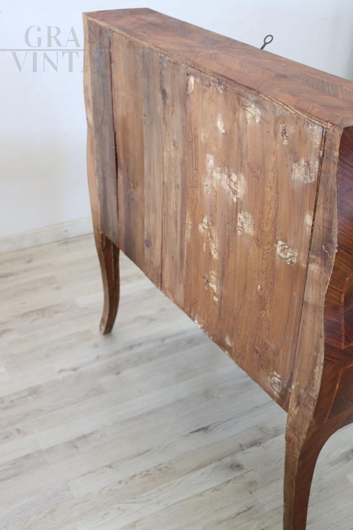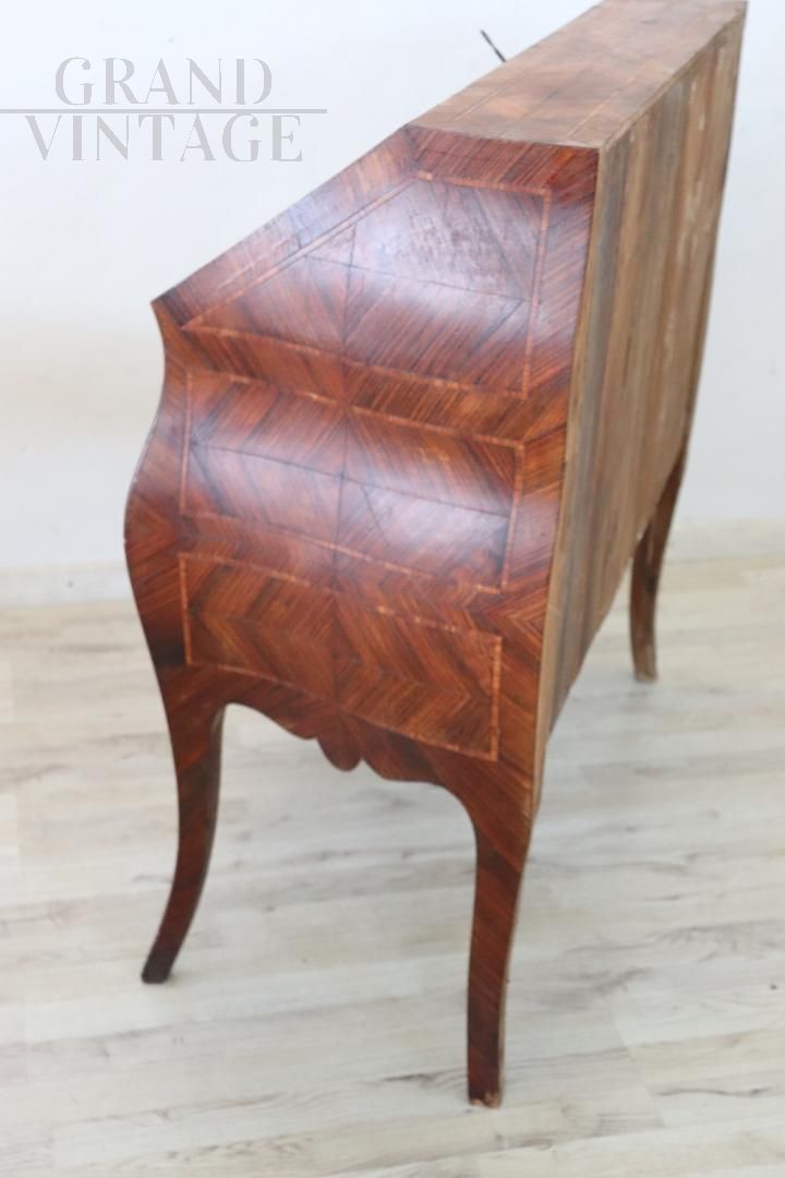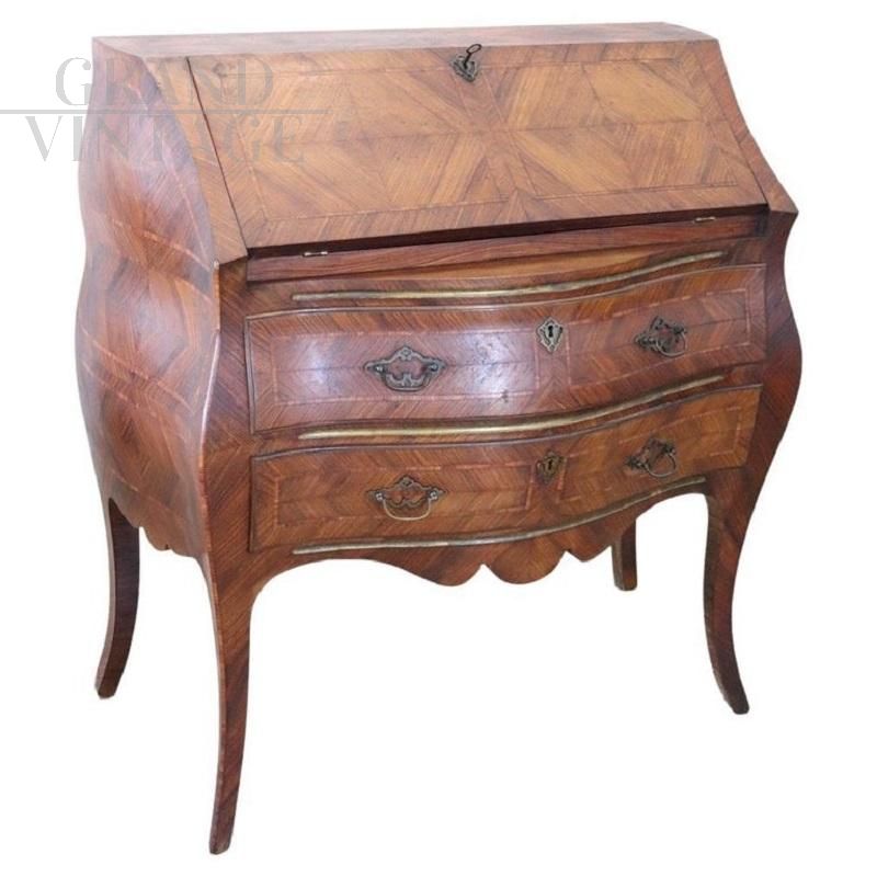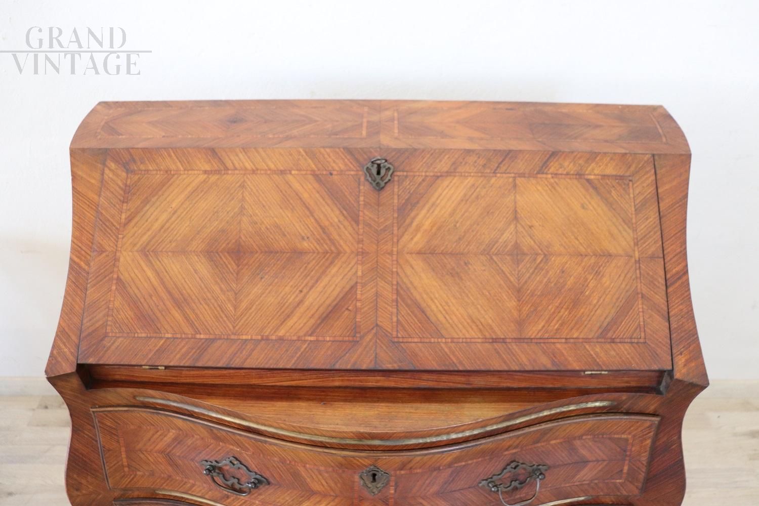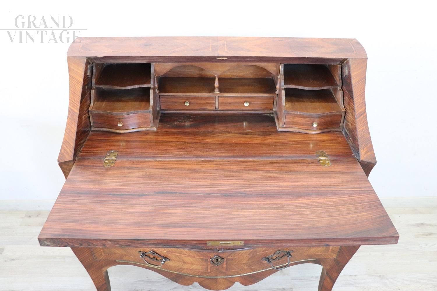 Elegante ribaltaina in stile antico Luigi XV primi decenni del secolo XX, caratterizzata da una raffinata impiallacciatura in pregiato legno di palissandro. L’impiallacciatura è posata utilizzando le venature del legno come decorazione, i contrasti formano particolari decorazioni dal gusto geometrico su ogni lato del mobile. Di grande pregio la forma bombata con gambe ad encabriolé snelle e sinuose. Il piano apribile a ribalta diventa un pratico appoggio per scrivere. All’interno quattro piccoli cassetti. Completa di due cassetti grandi e comodi sotto il piano a ribalta. Mobile in ottime condizioni pronto per essere collocato nella vostra casa.